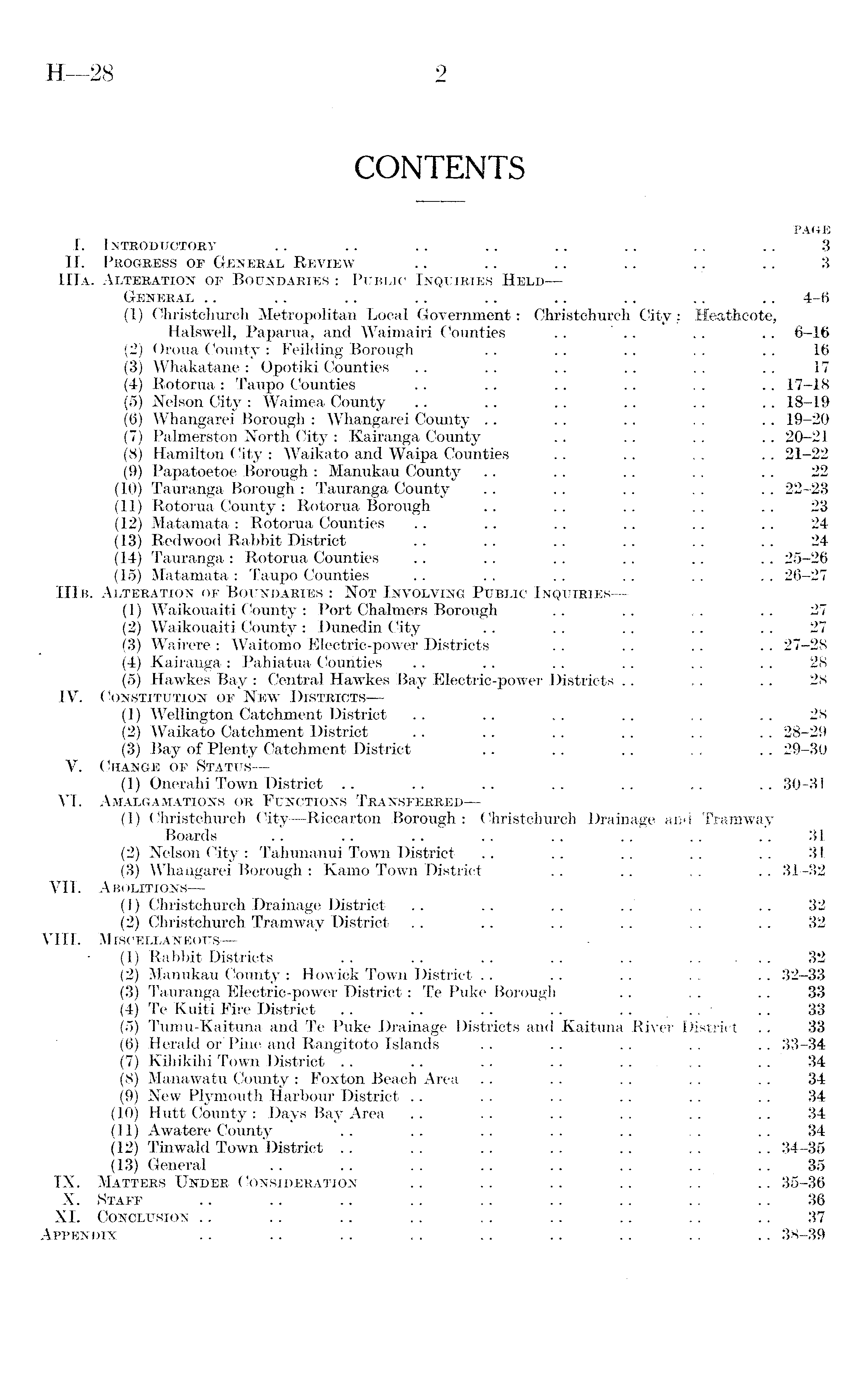 CONTENTS PAGE T. Introductory .. .. .. .. .. .. ... .. 3 11. Progress of General Review .. .. .. .. .. .. 3 lIIa. Alteration of Boundaries : Public Inquiries Held— General .. .. .. .. .. .. .. .. .. 4-6 (1) Christchurch Metropolitan Local Government: Christchurch City; Heathcote, Halswell, Paparua, and Waimairi Counties .. '.. .. .. 6-16 (2) Oroua County : Feilding Borough .. .. .. .. .. 16 (3) Whakatane : Opotiki Counties .. .. .. .. .. .. 17 (4) Rotorua : Taupo Counties .. .. .. . . .. .. 17-18 (5) Nelson City : Waimea County .. .. .. .. .. . . 18-19 (6) Whangarei Borough : Whangarei County .. .. .. . . .. 19-20 (7) Palmerston North City : Kairanga County .. .. .. .. 20-21 (8) Hamilton City : Waikato and Waipa Counties .. .. .. .. 21-22 (9) Papatoetoe Borough : Manukau County .. .. .. .. .. 22 (10) Tauranga Borough : Tauranga County .. .. .. .. .. 22-23 (11) Rotorua County : Rotorua Borough .. .. .. .. .. 23 (12) Matamata: Rotorua Counties .. .. .. .. .. 24 (13) Redwood Rabbit District .. .. .. .. .. .. 24 (14) Tauranga : Rotorua Counties .. .. .. .. .. .. 25-26 (15) Matamata : Taupo Counties .. .. .. .. .. .. 26-27 lIIb. Alteration of Boundaries : Not Involving Public Inquiries—(l) Waikouaiti County : Port Chalmers Borough .. .. ~ .. 27 (2) Waikouaiti County : Dunedin City .. .. .. .. .. 27 (3) Wairere : Waitomo Electric-power Districts . . .. .. .. 27-28 (4) Kairanga: Pahiatua Counties .. .. .. .. .. .. 28 (5) Hawkes Bay : Central Hawkes Bay Electric-power Districts .. .. .. 28 IV. Constitution of New Districts—(l) Wellington Catchment District .. .. .. .. .. .. 28 (2) Waikato Catchment District .. .. .. .. .. .. 28-29 (3) Bay of Plenty Catchment District .. .. . . .. .. 29-30 V. Change of Status — (1) Onerahi Town District .. .. .. .. .. .. * .. 30-31 VI. Amalgamations or Functions Transferred—(l) Christchurch City—Riccarton Borough : Christchurch Drainage and Tramway Boards .. .. .. .. .. .. .. .. 31 (2) Nelson City : Tahunanui Town District .. .. .. .. .. 31 (3) Whangarei Borough : Kamo Town District .. .. . . .. 31-32 VII. Abolitions — (1) Christchurch Drainage District . . .. .. .. .. .. 32 (2) Christchurch Tramway District .. .. .. .. ... 32 VIII. Miscellaneous — (1) Rabbit Districts .. .. .. .. .. 32 (2) Manukau County : Howick Town District .. .. .. .. .. 32-33 (3) Tauranga Electric-power District: Te Puke Borough .. .. .. 33 (4) Te Kuiti Fire District .. .. .. .. .. .. . . 33 (5) Tumu-Kaituna and Te Puke Drainage Districts and Kaituna River District .. 33 (6) Herald or' Pine and Rangitoto Islands .. .. .. .. .. 33-34 (7) Kihikihi Town District .. .. .. .. .. 34 (8) Manawatu County : Foxton Beach Area .... .. .. .. 34 (9) New Plymouth Harbour District .. .. . . .. .. .. 34 (10) Hutt County: Days Bay Area .. .. .. .. .. .. 34 (11) Awatere County .. .. .. .. .. .. .. 34 (12) Tinwald Town District .. .. .. .. .. .. .. 34-35 (13) General .. .. . . .. .. .. .. .. 35 IX. Matters Under Consideration .. .. .. .. .. .. 35-36 X. Staff .. .. .. .. .. .. .. .. .. 36 XI. Conclusion .... .. .. .. .. .. .. .. 37 APPENDIX .. .. .. .. .. .. .. .. .. 38-39