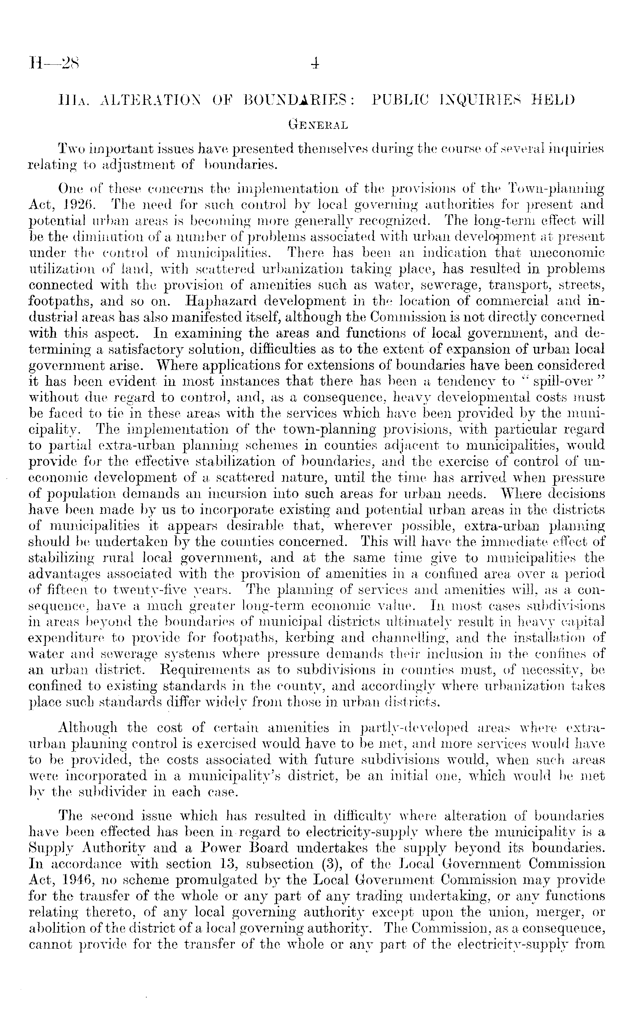 lIIa. ALTERATION OF BOUNDARIES: PUBLIC INQUIRIES HELD General Two important issues have presented themselves during the course of several inquiries relating to adjustment of boundaries. One of these concerns the implementation of the provisions of the Town-planning Act, 19*26. The need for such control by local governing authorities for present and potential urban areas is becoming more generally recognized. The long-term effect will be the diminution of a number of problems associated with urban development at present under the control of municipalities. There has been an indication that uneconomic utilization of land, with scattered urbanization taking place, has resulted in problems connected with the provision of amenities such as water, sewerage, transport, streets, footpaths, and so on. Haphazard development in the location of commercial and industrial areas has also manifested itself, although the Commission is not directly concerned with this aspect. In examining the areas and functions of local government, and determining a satisfactory solution, difficulties as to the extent of expansion of urban local government arise. Where applications for extensions of boundaries have been considered it has been evident in most instances that there has been a tendency to " spill-over " without due regard to control, and, as a consequence, heavy developmental costs must be faced to tie in these areas with the services which have been provided by the municipality. The implementation of the town-planning provisions, with particular regard to partial extra-urban planning schemes in counties adjacent to municipalities, would provide for the effective stabilization of boundaries, and the exercise of control of uneconomic development of a scattered nature, until the time has arrived when pressure of population demands an incursion into such areas for urban needs. Where decisions have been made by us to incorporate existing and potential urban areas in the districts of municipalities it appears desirable that, wherever possible, extra-urban planning should be undertaken by the counties concerned. This will have the immediate effect of stabilizing rural local government, and at the same time give to municipalities the advantages associated with the provision of amenities in a confined area over a period of fifteen to twenty-five years. The planning of services and amenities will, as a consequence, have a much greater long-term economic value. In most cases subdivisions in areas beyond the boundaries of municipal districts ultimately result in heavy capital expenditure to provide for footpaths, kerbing and channelling, and the installation of water and sewerage systems where pressure demands their inclusion in the confines of an urban district. Requirements as to subdivisions in counties must, of necessity, be confined to existing standards in the county, and accordingly where urbanization takes place such standards differ widely from those in urban districts. Although the cost of certain amenities in partly-developed areas where extraurban planning control is exercised would have to be met, and more services would have to be provided, the costs associated with future subdivisions would, when such areas were incorporated in a municipality's district, be an initial one, which would be met by the subdivider in each case. The second issue which has resulted in difficulty where alteration of boundaries have been effected has been in regard to electricity-supply where the municipality is a Supply Authority and a Power Board undertakes the supply beyond its boundaries. In accordance with section 13, subsection (3), of the Local Government Commission Act, 1946, no scheme promulgated by the Local Government Commission may provide for the transfer of the whole or any part of any trading undertaking, or any functions relating thereto, of any local governing authority except upon the union, merger, or abolition of the district of a local governing authority. The Commission, as a consequence, cannot provide for the transfer of the whole or any part of the electricity-supply from