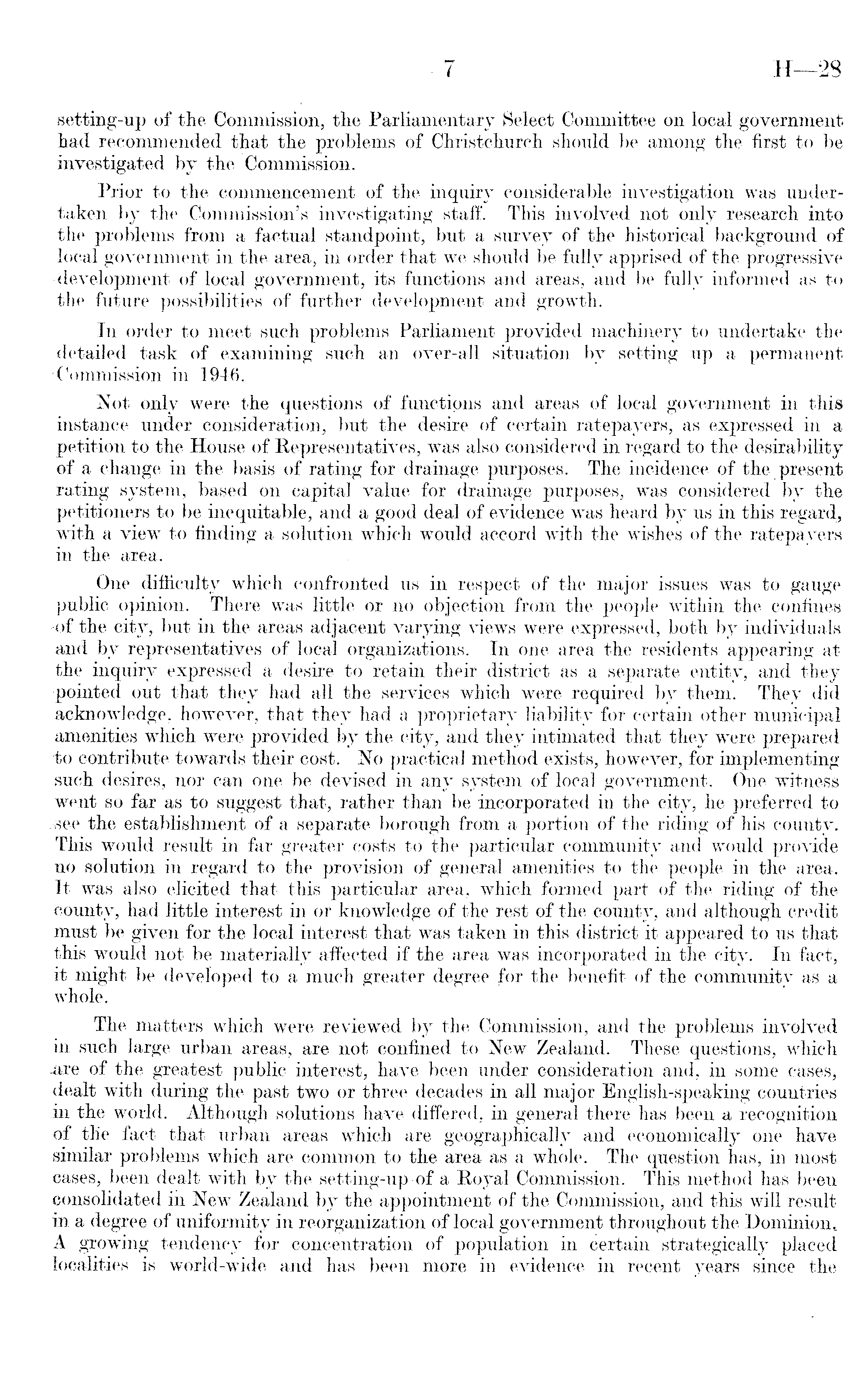 setting-up of the Commission, the Parliamentary Select Committee on local government had recommended that the problems of Christchurch should be among the first to be investigated by the Commission. Prior to the commencement of the inquiry considerable investigation was undertaken by the Commission's investigating staff. This involved not only research into the problems from a factual standpoint, but a survey of the historical background of local government in the area, in order that we should be fully apprised of the progressive development of local government, its functions and areas, and be fully informed as to the future possibilities of further development and growth. In order to meet such problems Parliament provided machinery to undertake the ■detailed task of examining such an over-all situation by setting up a permanent ■Commission in 1946. Not only were the questions of functions and areas of local government in this instance under consideration, but the desire of certain ratepayers, as expressed in a/ petition to the House of Representatives, was also considered in regard to the desirability of a change in the basis of rating for drainage purposes. The incidence of the present rating system, based on capital value for drainage purposes, was considered by the petitioners to be inequitable, and a good deal of evidence was heard by us in this regard, with a view to finding a solution which would accord with the wishes of the ratepayers in the area. One difficulty which confronted us in respect of the major issues was to gauge public opinion. There was little or no objection from the people within the confines -of the city, but in the areas adjacent varying views were expressed, both by individuals and by representatives of local organizations. In one area the residents appearing at the inquiry expressed a desire to retain their district as a. separate entity, and they pointed out that they had all the services which were required by them. They did acknowledge, however, that they had a proprietary liability for certain other municipal amenities which were provided by the city, and they intimated that they were prepared to contribute towards their cost. No practical method exists, however, for implementing such desires, nor can one be devised in any system of local government. One witness . went so far as to suggest that, rather than be incorporated in the city, he preferred to .-see the establishment of a separate borough from a portion of the riding of his county. This would result in far greater costs to the particular community and would provide no solution in regard to the provision of general amenities to the people in the area. It was also elicited that this particular area, which formed part of the riding of the •county, had little interest in or knowledge of the rest of the county, and although credit must be given for the local interest that was taken in this district it appeared to us.that this would not be materially affected if the area was incorporated in the city. In fact, it might be developed to a much greater degree for the benefit of the community as a whole. The matters which were reviewed by the Commission, and the problems involved in such large urban areas, are not confined to New Zealand. These questions, which -are of the greatest public interest, have been under consideration and, in some cases, dealt with during the past two or three decades in all major English-speaking countries in the world. Although solutions have differed, in general there has been a recognition of the fact that urban areas which are geographically and economically one have similar problems which are common to the area as a whole. The question has, in most •cases, been dealt with by the setting-up of a Royal Commission. This method has been consolidated in New Zealand by the appointment of the Commission, and this will result in a degree of uniformity in reorganization of local government throughout the Dominion, A growing tendency for concentration of population in certain strategically placed localities is world-wide and has been more in evidence in recent years since the
