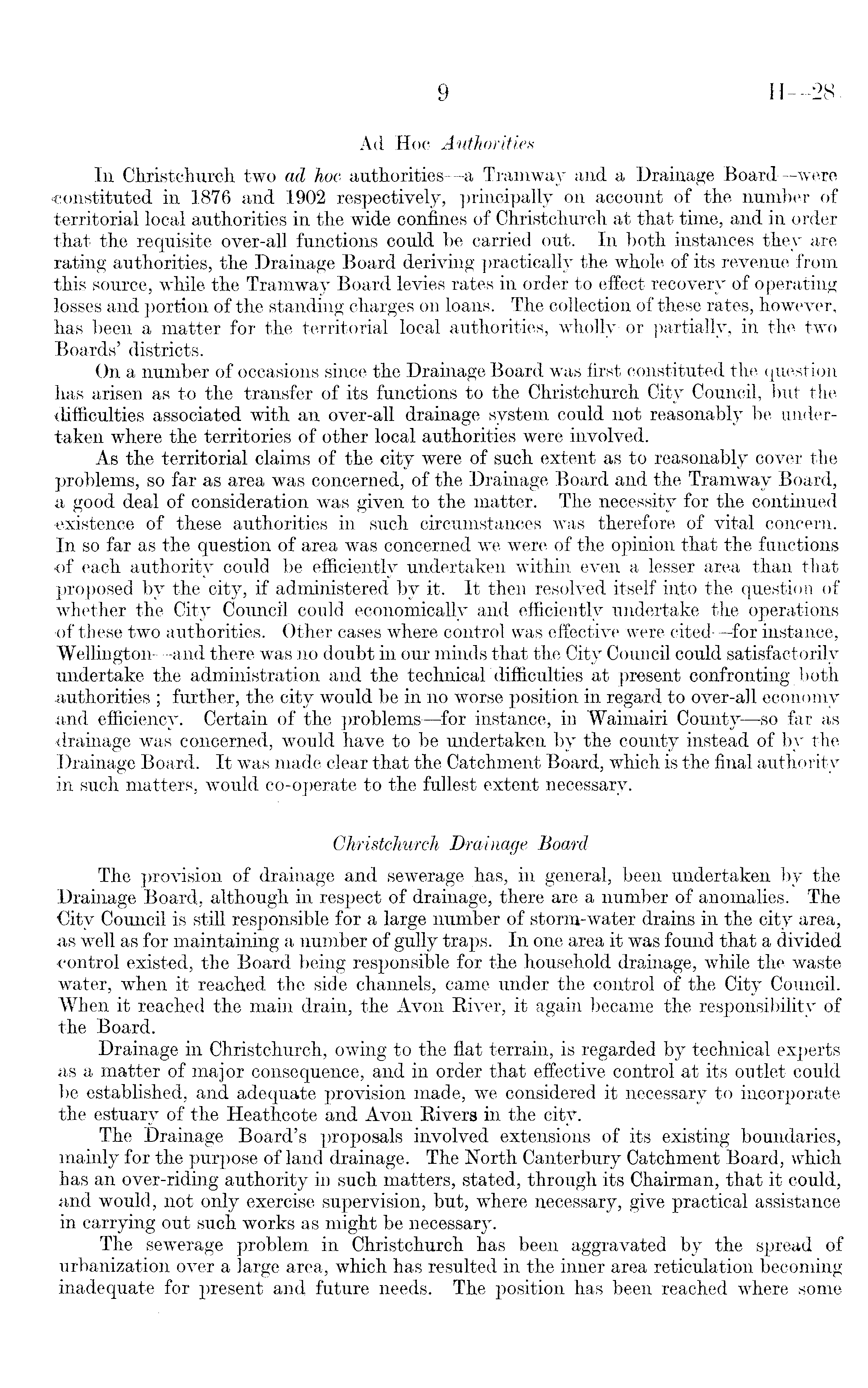 Ad Hoc Authorities In Christchurch two ad hoc authorities —a Tramway and a Drainage Board—were •constituted in 1876 and 1902 respectively, principally on account of tlie number of. territorial local authorities in the wide confines of Christchurch at that time, and in order that the requisite over-all functions could be carried out. In both instances they are rating authorities, the Drainage Board deriving practically the whole of its revenue from this source, while the Tramway Board levies rates in order to effect recovery of operating losses and portion of the standing charges on loans. The collection of these rates, however, has been a matter for the territorial local authorities, wholly or partially, in the two Boards' districts. On a number of occasions since the Drainage Board was first constituted the question has arisen as to the transfer of its functions to the Christchurch City Council, but the difficulties associated with an over-all drainage system could not reasonably be undertaken where the territories of other local authorities were involved. As the territorial claims of the city were of such extent as to reasonably cover the problems, so far as area was concerned, of the Drainage Board and the Tramway Board, a good deal of consideration was given to the matter. The necessity for the continued existence of these authorities in such circumstances was therefore of vital concern. In so far as the question of area was concerned we were of the opinion that the functions •of each authority could be efficiently undertaken within even a lesser area than that proposed by the city, if administered by it. It then resolved itself into the question of whether the City Council could economically and efficiently undertake the operations of these two authorities. Other cases where control was effective were cited—for instance, Wellington—and there was no doubt in our minds that the City Council could satisfactorily undertake the administration and the technical 'difficulties at present confronting both authorities ; further, the city would be in no worse position in regard to over-all economy and efficiency. Certain of the problems —-for instance, in Waimairi County—so far as drainage was concerned, would have to be undertaken by the county instead of by the Drainage Board. It was made clear that the Catchment Board, which is the final authority in such matters, would co-operate to the fullest extent necessary. Christchurch Drainage Board The provision of drainage and sewerage has, in general, been undertaken by the Drainage Board, although in respect of drainage, there are a number of anomalies. The City Council is still responsible for a large number of storm-water drains in the city area, as well as for maintaining a number of gully traps. In one area it was found that a divided control existed, the Board being responsible for the household drainage, while the waste water, when it reached the side channels, came under the control of the City Council. When it reached the main drain, the Avon River, it again became the responsibility of the Board. Drainage in Christchurch, owing to the flat terrain, is regarded by technical experts as a matter of major consequence, and in order that effective control at its outlet could be established, and adequate provision made, we considered it necessary to incorporate the estuary of the Heathcote and Avon Rivers in the city. The Drainage Board's proposals involved extensions of its existing boundaries, mainly for the purpose of land drainage. The North Canterbury Catchment Board, which has an over-riding authority in such matters, stated, through its Chairman, that it could, and would, not only exercise supervision, but, where necessary, give practical assistance in carrying out such works as might be necessary. The sewerage problem in Christchurch has been aggravated by the spread of urbanization over a large area, which has resulted in the inner area reticulation becoming inadequate for present and future needs. The position has been reached where some