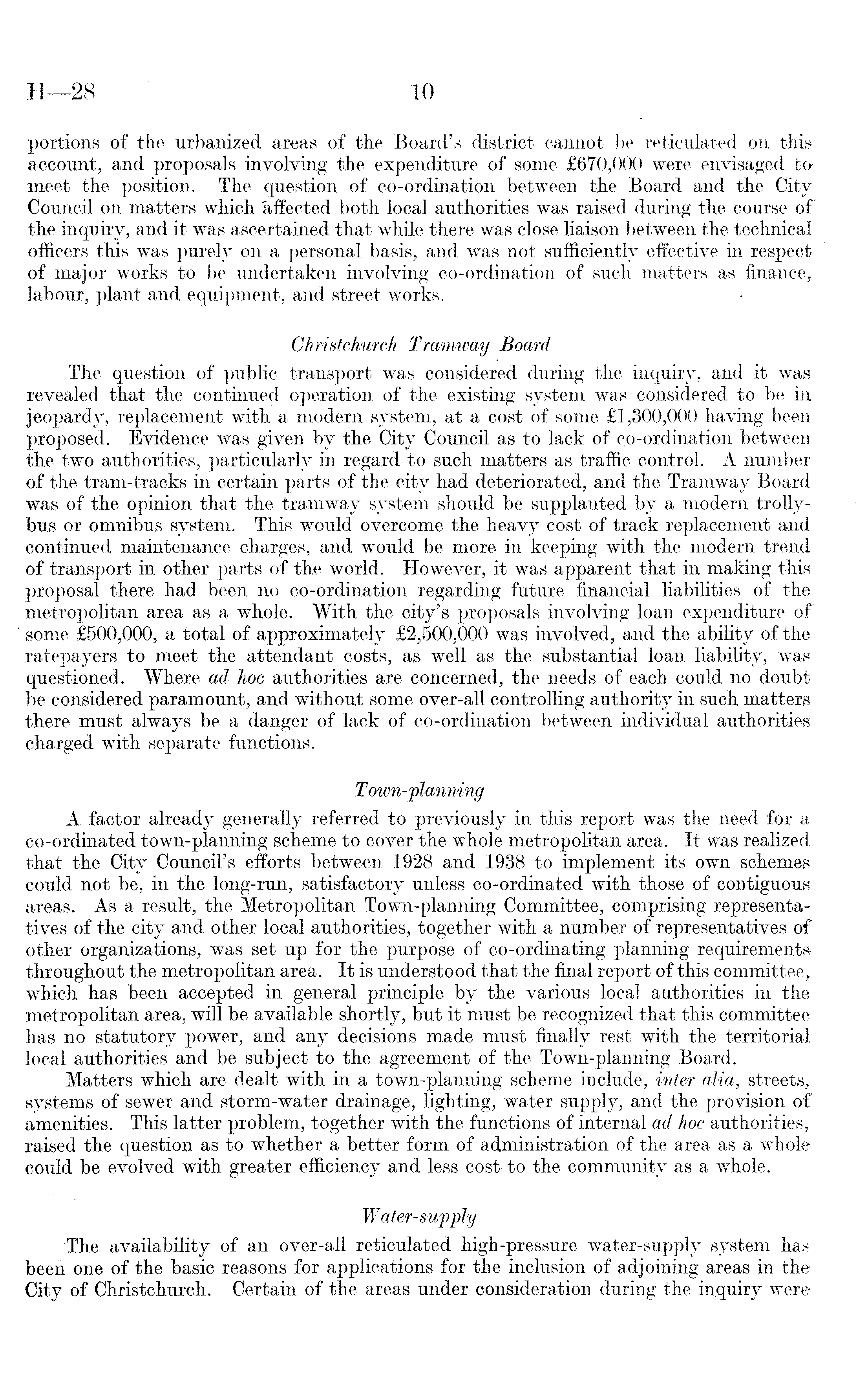 portions of the urbanized areas of the Board's district cannot be reticulated on thisaccount, and proposals involving the expenditure of some £670,000 were envisaged to meet the position. The question of co-ordination between the Board and the City Council on matters which affected both local authorities was raised during the course of the inquiry, and it was ascertained that while there was close liaison between the technical officers this was purely on a personal basis, and was not sufficiently effective in respect of major works to be undertaken involving co-ordination of such matters as finance, labour, plant and equipment, and street works. Christchurch Tramway Board The question of public transport was considered during the inquiry, and it was revealed that the continued operation of the existing system was considered to be in jeopardy, replacement with a modern system, at a cost of some £1,300,000 having been proposed. Evidence was given by the City Council as to lack of co-ordination between the two authorities, particularly in regard to such matters as traffic control. A number of the tram-tracks in certain parts of the city had deteriorated, and the Tramway Board was of the opinion that the tramway system should be supplanted by a modern trollybus or omnibus system. This would overcome the heavy cost of track replacement and continued maintenance charges, and would be more in keeping with the modern trend of transport in other parts' of the world. However, it was apparent that in making this proposal there had been no co-ordination regarding future financial liabilities of the metropolitan area as a whole. With the city's proposals involving loan expenditure of some £500,000, a total of approximately £2,500,000 was involved, and the ability of the ratepayers to meet the attendant costs, as well as the substantial loan liability, was questioned. Where ad hoc authorities are concerned, the needs of each could no doubt be considered paramount, and without some over-all controlling authority in such matters there must always be a danger of lack of co-ordination between individual authorities charged with separate functions. Town-planning A factor already generally referred to previously in this report was the need for a co-ordinated town-planning scheme to cover the whole metropolitan area. It was realized that the City Council's efforts between 1928 and 1938 to implement its own schemes could not be, in the long-run, satisfactory unless co-ordinated with those of contiguous areas. As a result, the Metropolitan Town-planning Committee, comprising representatives of the city and other local authorities, together with a number of representatives of other organizations, was set up for the purpose of co-ordinating planning requirements throughout the metropolitan area. It is understood that the final report of this committee, which has been accepted in general principle by the various local authorities in the metropolitan area, will be available shortly, but it must be recognized that this committee has no statutory power, and any decisions made must finally rest with the territorial local authorities and be subject to the agreement of the Town-planning Board. Matters which are dealt with in a town-planning scheme include, inter alia, streets, systems of sewer and storm-water drainage, lighting, water supply, and the provision of amenities. This latter problem, together with the functions of internal ad hoc authorities, raised the question as to whether a better form of administration of the area as a whole could be evolved with greater efficiency and less cost to the community as a whole. Water-supply The availability of an over-all reticulated high-pressure water-supply system has been one of the basic reasons for applications for the inclusion of adjoining areas in the City of Christchurch. Certain of the areas under consideration during the inquiry were