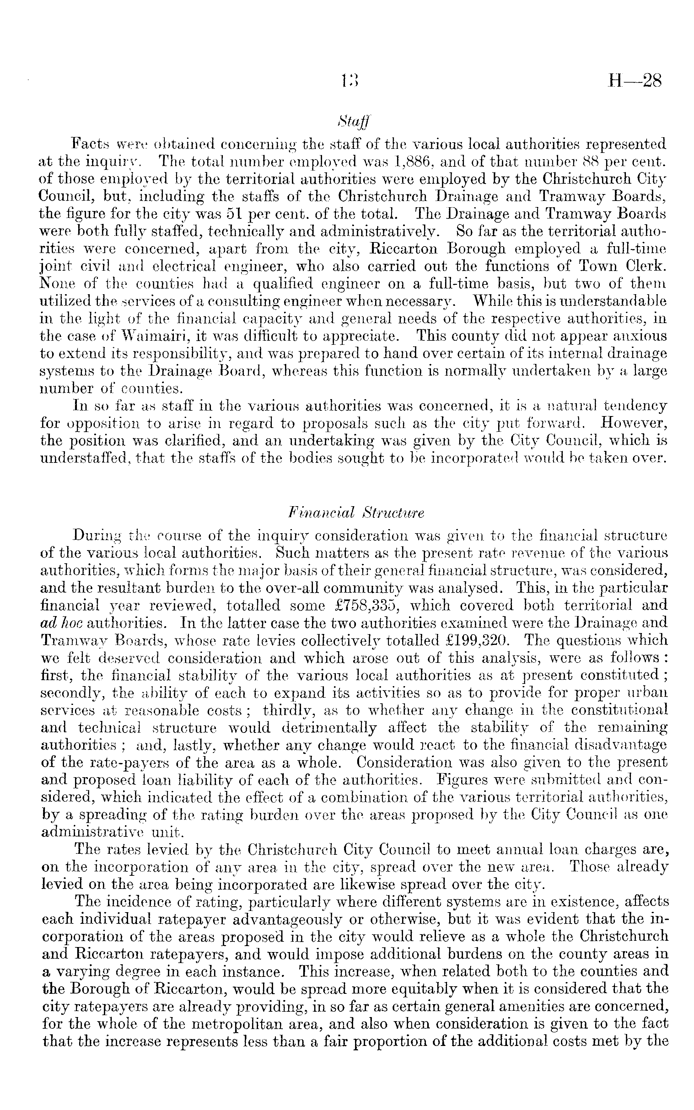 Stuff Facts were obtained concerning the staff of the various local authorities represented at the inquiry. The total number employed was 1,886, and of that number 88 per cent, of those employed by the territorial authorities were employed by the Christchurch City Council, but, including the staffs of the Christchurch Drainage and Tramway Boards, the figure for the city was 51 per cent, of the total. The Drainage and Tramway Boards were both fully staffed, technically and administratively. So far as the territorial authorities were concerned, apart from the city, Biccarton Borough employed a full-time joint civil and electrical engineer, who also carried out the functions of Town Clerk. None of the counties had a qualified engineer on a full-time basis, but two of them utilized the services of a consulting engineer when necessary. While this is understandable in the light of the financial capacity and general needs of the respective authorities, in the case of Waimairi, it was difficult to appreciate. This county did not appear anxious to extend its responsibility, and was prepared to hand over certain of its internal drainage systems to the Drainage Board, whereas this function is normally undertaken by a large number of comities. In so far as staff in the various authorities was concerned, it is a natural tendency for opposition to arise in regard to proposals such as the city put forward. However, the position was clarified, and an undertaking was given by the City Council, which is understaffed, that the staffs of the bodies sought to be incorporated would be taken over. Financial Structure During the course of the inquiry consideration was given to the financial structure of the various local authorities. Such matters as the present rate revenue of the various authorities, which forms the major basis of their general financial structure, was considered, and the resultant burden to the over-all community was analysed. This, in the particular financial year reviewed, totalled some £758,335, which covered both territorial and ad hoc authorities. In the latter case the two authorities examined were the Drainage and Tramway Boards, whose rate levies collectively totalled £199,320. The questions which we felt deserved consideration and which arose out of this analysis, were as follows : first, the financial stability of the various local authorities as at present constituted; secondly, the ability of each to expand its activities so as to provide for proper urban services at reasonable costs; thirdly, as to whether any change in the constitutional and technical structure would detrimentally affect the stability of the remaining authorities ; and, lastly, whether any change would react to the financial disadvantage of the rate-payers of the area as a whole. Consideration was also given to the present and proposed loan liability of each of the authorities. Figures were submitted and considered, which indicated the effect of a combination of the various territorial authorities, by a spreading of the rating burden over the areas proposed by the City Council as one administrative unit. The rates levied by the Christchurch City Council to meet annual loan charges are, on the incorporation of any area in the city, spread over the new area. Those already levied on the area being incorporated are likewise spread over the city. The incidence of rating, particularly where different systems are in existence, affects each individual ratepayer advantageously or otherwise, but it was evident that the incorporation of the areas proposed in the city would relieve as a whole the Christchurch and Biccarton ratepayers, and would impose additional burdens on the county areas in a varying degree in each instance. This increase, when related both to the counties and the Borough of Riccarton, would be spread more equitably when it is considered that the city ratepayers are already providing, in so far as certain general amenities are concerned, for the whole of the metropolitan area, and also when consideration is given to the fact that the increase represents less than a fair proportion of the additional costs met by the