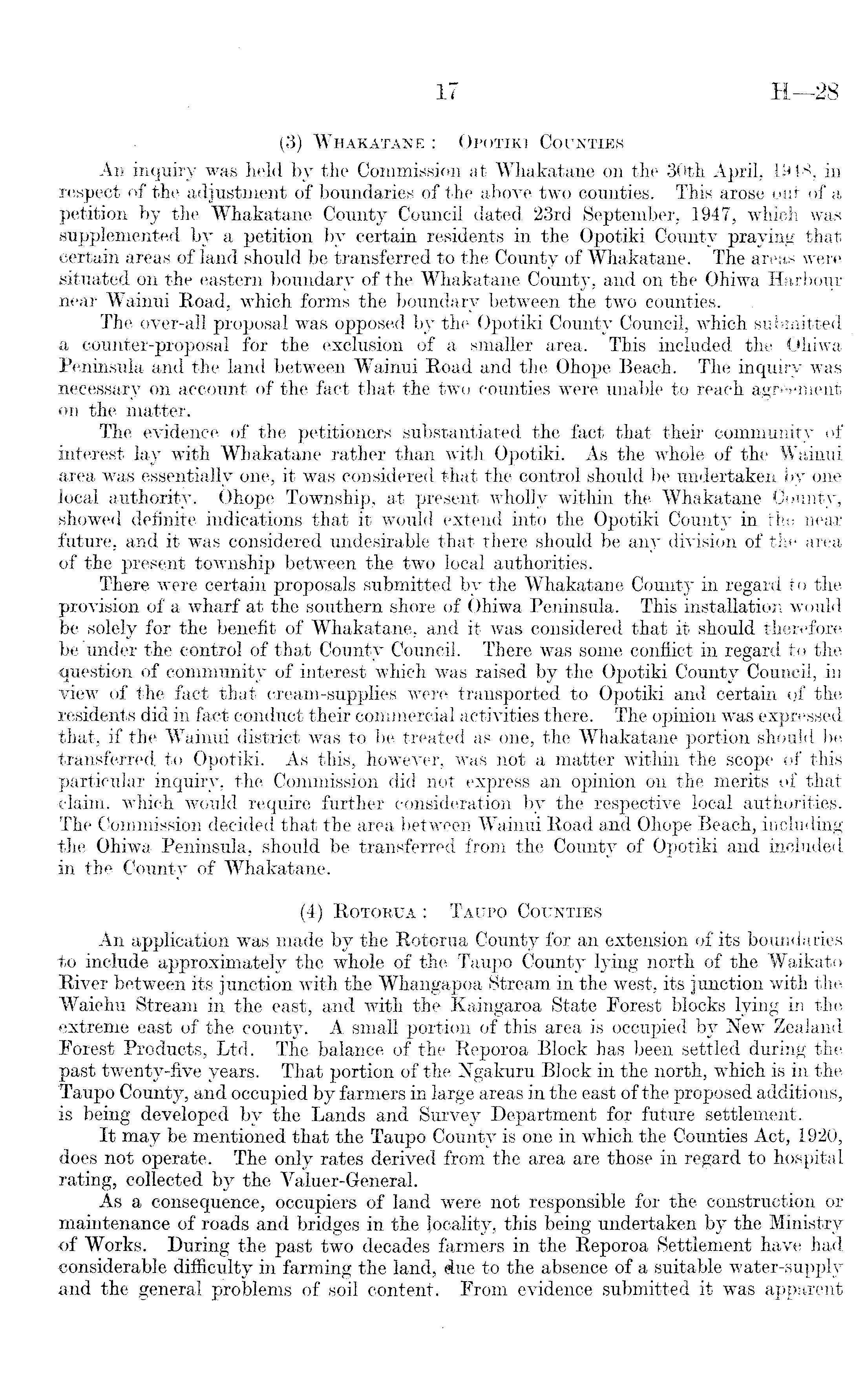 (3) Whakatane : Opotiki Counties An inquiry was held by the Commission at Whakatane on the 30th April. 1948, in respect of the adjustment of boundaries of the above two counties. This arose out of a petition by the Whakatane County Council dated 23rd September, 1947, which was supplemented by a petition by certain residents in the Opotiki County praying that certain areas of land should be transferred to the County of Whakatane. The areas were situated on the eastern boundary of the Whakatane County, and on the Ohiwa Harbour near Wainui Road, which forms the boundary between the two counties. The over-all proposal was opposed by the Opotiki County Council, which submitted a counter-proposal for the exclusion of a smaller area. This included the Ohiwa Peninsula and the land between Wainui Road and the Ohope Beach. The inquiry was necessary on account of the fact that the two counties were unable to reach agreement on the matter. The evidence of the petitioners substantiated the fact that their community of interest lay with Whakatane rather than with Opotiki. As the whole of the Wainui area was essentially one, it was considered that the control should be undertaken by one local authority. Ohope Township, at present wholly within the Whakatane County, showed definite indications that it would extend into the Opotiki County in the near future, and it was considered undesirable that there should be any division of the area, of the present township between the two Jocal authorities. There were certain proposals submitted by the Whakatane County in regard to the provision of a wharf at the southern shore of Ohiwa Peninsula. This installation would be solely for the benefit of Whakatane, and it was considered that it should therefore be "under the control of that County Council. There was some conflict in regard to the question of community of interest which was raised by the Opotiki County Council, in view of the fact that cream-supplies were transported to Opotiki and certain of the residents did in fact conduct their commercial activities there. The opinion was expressed that, if the Wainui district was to be treated as one, the Whakatane portion should be transferred to Opotiki. As this, however, was not a matter within the scope of this particular inquiry, the Commission did not express an opinion on the merits of that claim, which would require further consideration by the respective local authorities. The Commission decided that the area between Wainui Road and Ohope Beach, including the Ohiwa Peninsula, should be transferred from the County of Opotiki and included in the County of Whakatane. (4) Rotorua : Taupo Counties An application was made by the Rotorua County for an extension of its boundaries to include approximately the whole of the Taupo County lying north of the Waikato River between its junction with the Whangapoa Stream in the west, its junction with the Waiehu Stream in the east, and with the Kaingaroa State Forest blocks lying in the extreme east of the county. A small portion of this area is occupied by New Zealand Forest Products, Ltd. The balance of the Reporoa Block has 4 been settled during the past twenty-five years. That portion of the Ngakuru Block in the north, which is in the Taupo County, and occupied by farmers in large areas in the east of the proposed additions, is being developed by the Lands and Survey Department for future settlement. It may be mentioned that the Taupo County is one in which the Counties Act, 1920, does not operate. The only rates derived from the area are those in regard to hospital rating, collected by the Valuer-General. As a consequence, occupiers of land were not responsible for the construction or maintenance of roads and bridges in the locality, this being undertaken by the Ministry of Works. During the past two decades farmers in the Reporoa Settlement have had considerable difficulty in farming the land, due to the absence of a suitable water-supply and the general problems of soil content. From evidence submitted it was apparent