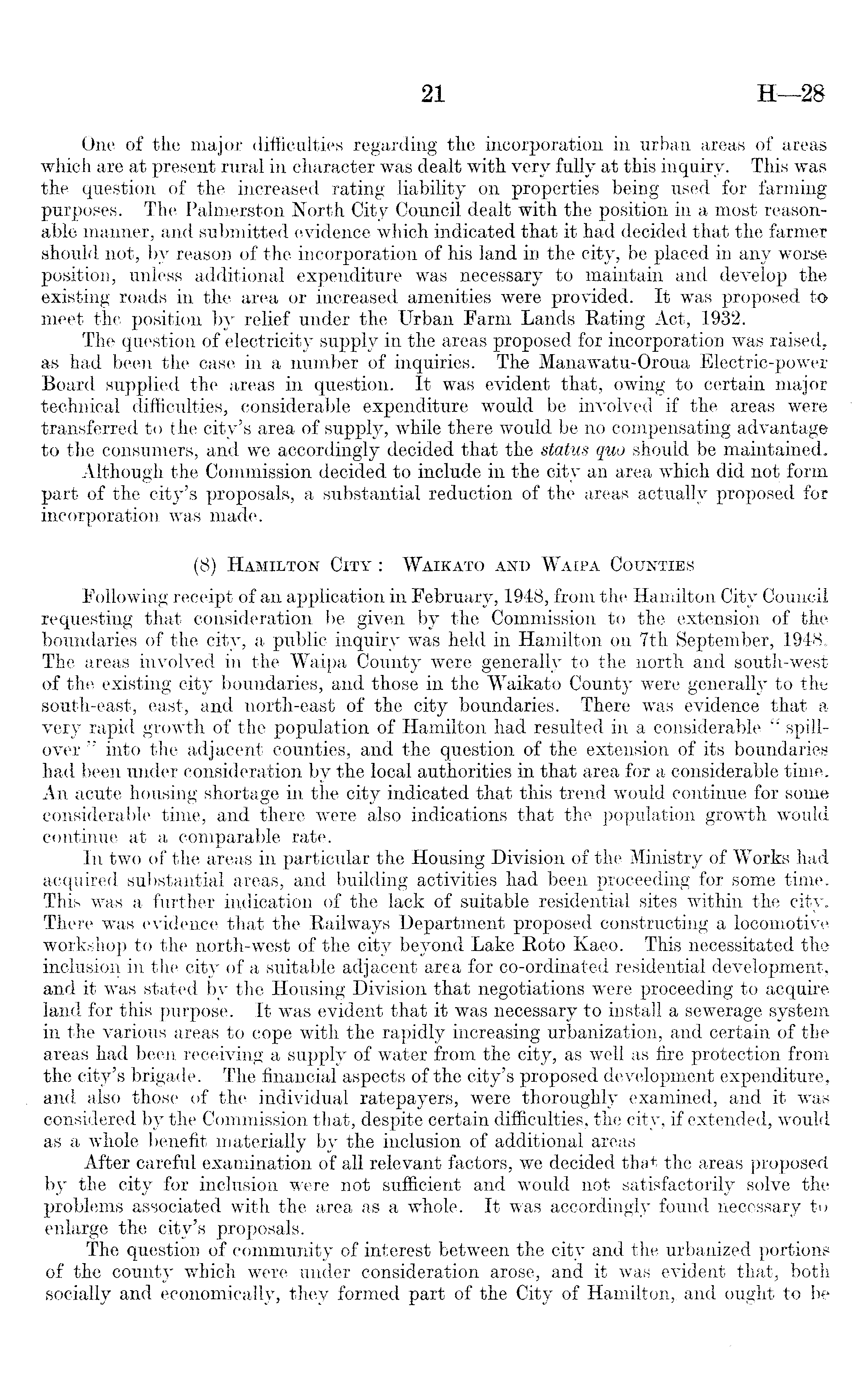 One of the major difficulties regarding the incorporation in urban areas of areas which are at present rural in character was dealt with very fully at this inquiry. This was the question of the increased rating liability on properties being used for farming purposes. The Palmerston North City Council dealt with the position in a most reasonable manner, and submitted evidence which indicated that it had decided that the farmer should not, by reason of the incorporation of his land in the city, be placed in any worse position, unless additional expenditure was necessary to maintain and develop the existing roads in the area or increased amenities were provided. It was proposed to meet the position by relief under the Urban Farm Lands Rating Act, 1932. The question of electricity supply in the areas proposed for incorporation was raised, as had been the case in a number of inquiries. The Manawatu-Oroua Electric-power Board supplied the areas in question. It was evident that, owing to certain major technical difficulties, considerable expenditure would be involved if the areas were transferred to the city's area of supply, while there would be no compensating advantage to the consumers, and we accordingly decided that the status quo should be maintained. Although the Commission decided to include in the city an area which did not form part of the city's proposals, a substantial reduction of the areas actually proposed for incorporation was made. (8) Hamilton City : Waikato and Waipa Counties Following receipt of an application in February, 1948, from the Hamilton City Council requesting that consideration be given by the Commission to the extension of the boundaries of the city, a public inquiry was held in Hamilton on 7th September, 1948. The areas involved in the Waipa County were generally to the north and south-west of the existing city boundaries, and those in the Waikato County were generally to the south-east, east, and north-east of the city boundaries. There was evidence that a very rapid growth of the population of Hamilton had resulted in a considerable " spillover " into the adjacent counties, and the question of the extension of its boundaries had been under consideration by the local authorities in that area for a considerable time. An acute housing shortage in the city indicated that this trend would continue for some considerable time, and there were also indications that the population growth would continue at a comparable rate. In two of the areas in particular the Housing Division of the Ministry of Works had acquired substantial areas, and building activities had been proceeding for some time. This was a further indication of the lack of suitable residential sites within the city. There was evidence that the Railways Department proposed constructing a locomotive workshop to the north-west of the city beyond Lake Roto Kaeo. This necessitated the inclusion in the city of a suitable adjacent area for co-ordinated residential development, and it was stated by the Housing Division that negotiations were proceeding to acquire land for this purpose. It was evident that it was necessary to install a sewerage system in the various areas to cope with the rapidly increasing urbanization, and certain of the areas had been receiving a supply of water from the city, as well as fire protection from the city's brigade. The financial aspects of the city's proposed development expenditure, and also those of the individual ratepayers, were thoroughly examined, and it was considered by the Commission that, despite certain difficulties, the city, if extended, would as a whole benefit materially by the inclusion of additional areas After careful examination of all relevant factors, we decided that the areas proposed by the city for inclusion were not sufficient and would not satisfactorily solve the problems associated with the area as a whole. It was accordingly found necessary to enlarge the city's proposals. The question of community of interest between the city and the urbanized portions of the county which were under consideration arose, and it was evident that, both socially and economically, they formed part of the City of Hamilton,, and ought to be