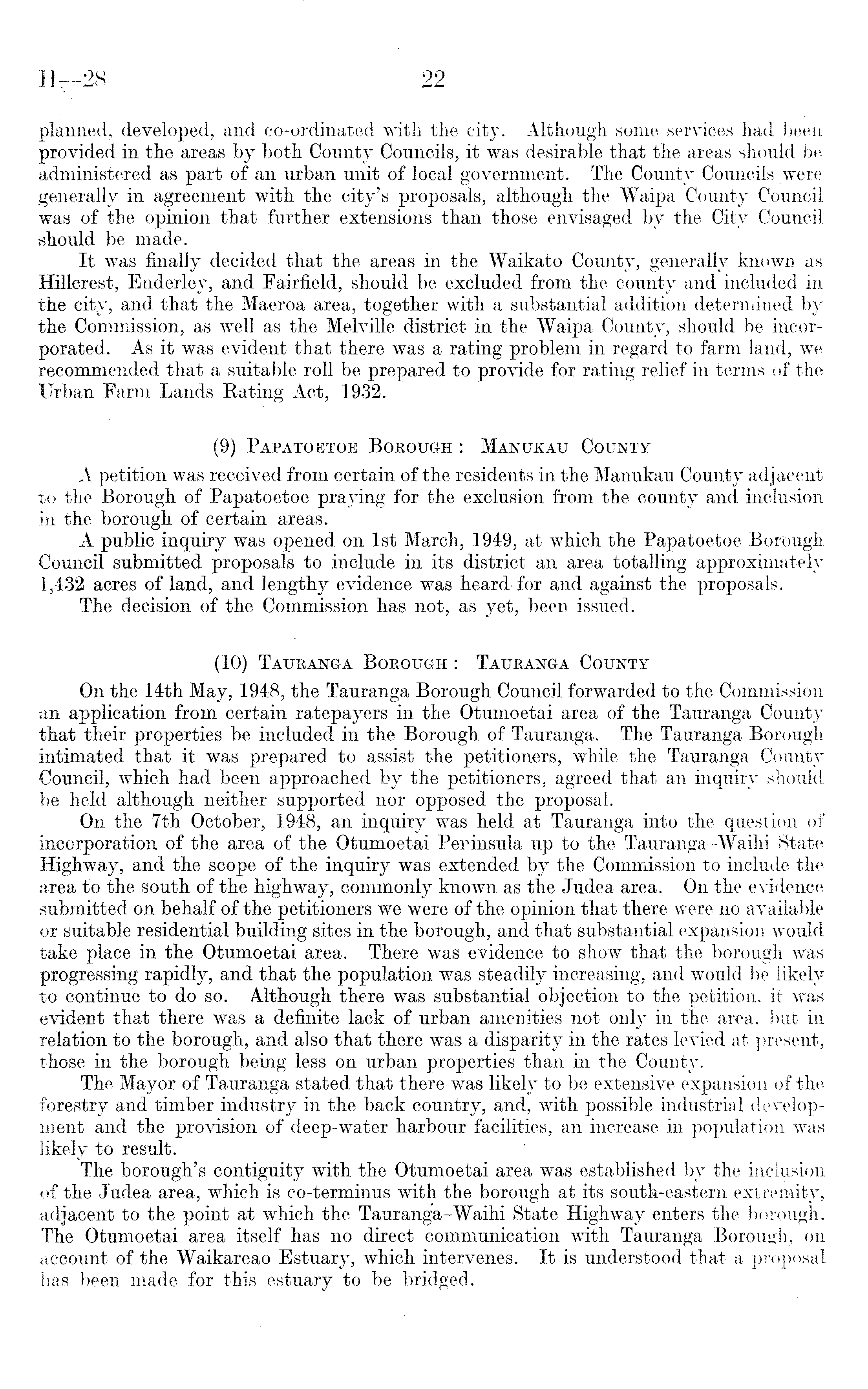 planned, developed, and co-ordinated with the city. Although some services had been provided in the areas by both County Councils, it was desirable that the areas should be administered as part of an urban unit of local government. The County Councils were generally in agreement with the city's proposals, although the Waipa County Council was of the opinion that further extensions than those envisaged by the City Council should be made. It was finally decided that the areas in the Waikato County, generally known as Hillcrest, Enderley, and Fairfield, should be excluded from the county and included in the city, and that the Maeroa area, together with a substantial addition determined by the Commission, as well as the Melville district in the Waipa County, should be incorporated. As it was evident that there was a rating problem in regard to farm land, we recommended that a suitable roll be prepared to provide for rating relief in terms of the Urban Farm Lands Rating Act, 1932. (9) Papatoetoe Borough : Manukau County A petition was received from certain of the residents in the Manukau County adjacent to the Borough of Papatoetoe praying for the exclusion from the county and inclusion in the borough of certain areas. A public inquiry was opened on Ist March, 1949, at which the Papatoetoe BorOugh Council submitted proposals to include in its district an area totalling approximately 1,432 acres of land, and lengthy evidence was heard'for and against the proposals. The decision of the Commission has not, as yet, been issued. (10) Tauranga Borough : Tauranga County On the 14th May, 1948, the Tauranga Borough Council forwarded to the Commission an application from certain ratepayers in the Otumoetai area of the Tauranga County that their properties be included in the Borough of Tauranga. The Tauranga Borough intimated that it was prepared to assist the petitioners, while the Tauranga County Council, which had been approached by the petitioners, agreed that an inquiry should be held although neither supported nor opposed the proposal. On the 7th October, 1948, an inquiry was held at Tauranga into the question of incorporation of the area of the Otumoetai Perinsula up to the Tauranga-Waihi State Highway, and the scope of the inquiry was extended by the Commission to include the area to the south of the highway, commonly known as the Judea area. On the evidence submitted on behalf of the petitioners we were of the opinion that there were no available or suitable residential building sites in the borough, and that substantial expansion would take place in the Otumoetai area. There was evidence to show that the borough was progressing rapidly, and that the population was steadily increasing, and would be likely to continue to do so. Although there was substantial objection to the petition, it was evident that there was a definite lack of urban amenities not only in the area, but in relation to the borough, and also that there was a disparity in the rates levied at present, those in the borough being less on urban properties than in the County. The Mayor of Tauranga stated that there was likely to be extensive expansion of the forestry and timber industry in the back country, and, with possible industrial development and the provision of deep-water harbour facilities, an increase in population was likely to result. The borough's contiguity with the Otumoetai area was established by the inclusion of the Judea area, which is co-terminus with the borough at its south-eastern extremity, adjacent to the point at which the Tauranga-Waihi State Highway enters the borough. The Otumoetai area itself has no direct communication with Tauranga Borough, on account of the Waikareao Estuary, which intervenes. It is understood that a proposal has been made for this estuary to be bridged.