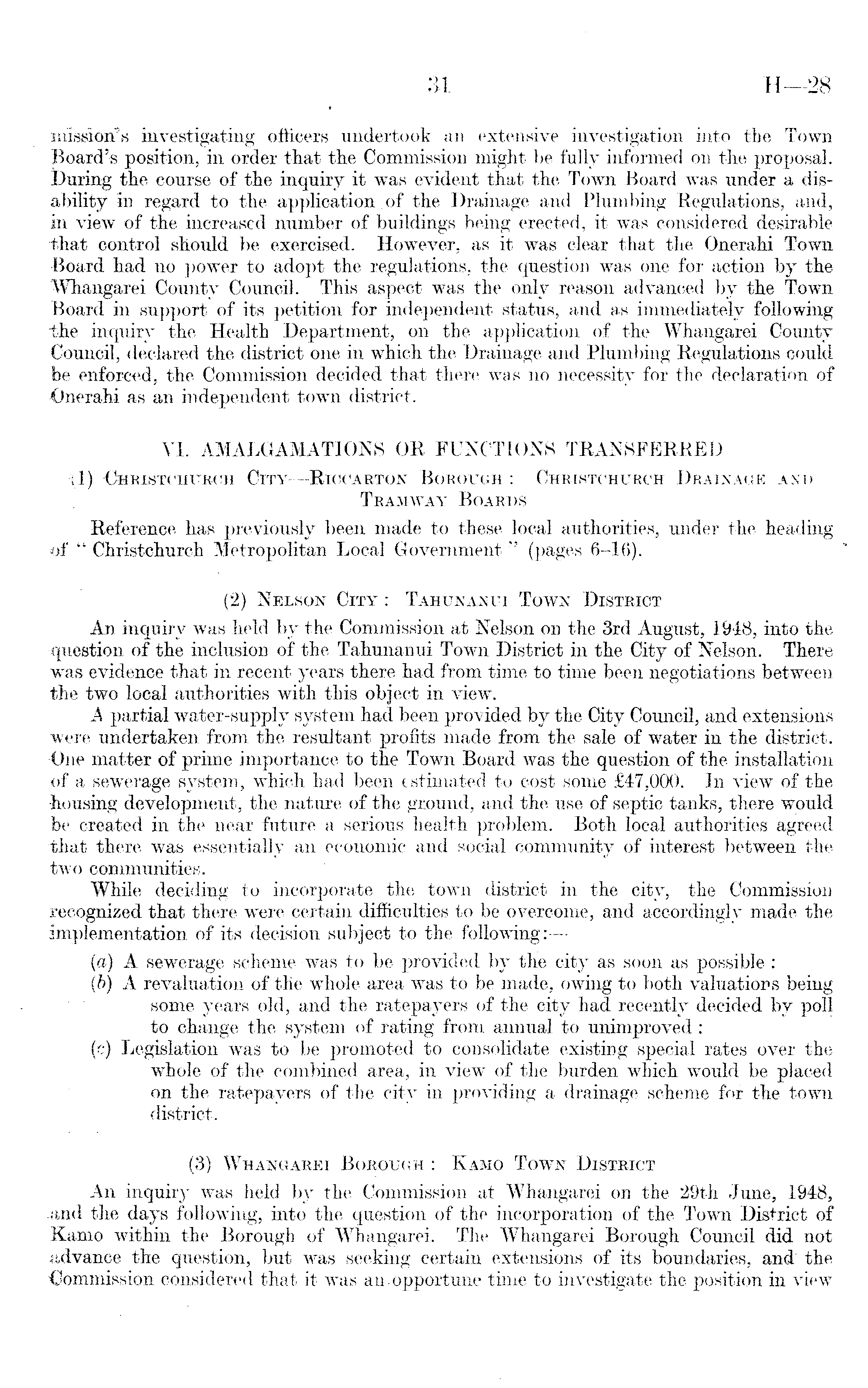 mission's investigating officers undertook an extensive investigation into tbe Town .Board's position, in order that the Commission might be fully informed on the proposal. l)uring the course of the inquiry it was evident that the Town Board was under a disability in regard to the application .of the Drainage and Plumbing Regulations, and, in view of the increased number of buildings being erected, it was considered desirable that control should be exercised. However, as it was clear that 'the Onerahi Town Board had no power to adopt the regulations, the question was one for action by the Whangarei County Council. This aspect was the only reason advanced by the Town Board in support of its petition for independent status, and as immediately following the inquiry the Health Department, on the application of the Whangarei County Council, declared the district one in which the Drainage and Plumbing Regulations could be enforced, the Commission decided that there was no necessity for the declaration of Onerahi as an independent town district. VI. AMALGAMATIONS OR FUNCTIONS TRANSFERRED (1) Christchurch City—Riccarton Borough: Christchurch Drainage and Tramway Boards Reference has previously been made to these local authorities, under the heading of " Christchurch Metropolitan Local Government " (pages 6-16). (2) Nelson City : Tahunanui Town District An inquiry was held by the Commission at Nelson on the 3rd August, 1948, into the question of the inclusion of the Tahunanui Town District in the City of Nelson. There was evidence that in recent years there had from time to time been negotiations between the two local authorities with this object in view. A partial water-supply system had been provided by the City Council, and extensions were undertaken from the resultant profits made from the sale of water in the district. One matter of prime importance to the Town Board was the question of the installation of a sewerage system, which had been estimated to cost some £47,000. In view of the housing development, the nature of the ground, and the use of septic tanks, there would be created in the near future a serious health problem. Both local authorities agreed that there was essentially an economic and social community of interest between the two communities. While deciding to incorporate the town district in the city, the Commission recognized that there were certain difficulties to be overcome, and accordingly made the implementation of its decision subject to the following:— (a) A sewerage scheme was to be provided by the city as soon as possible : (b) Are valuation, of the whole area was to be made, owing to both valuations being some years old, and the ratepayers of the city had recently decided by poll to change the system of rating from annual to unimproved : (c) Legislation was to be promoted to consolidate existing special rates over the whole of the combined area, in view of the burden which would be placed on the ratepayers of the city in providing a drainage scheme for the town district. (3) Whangarei Borough : Kamo Town District An inquiry was held by the Commission at Whangarei on the 29th June, 1948, and the days following, into the question of the incorporation of the Town District of Kamo within the Borough of Whangarei. The Whangarei Borough Council did not advance the question, but was seeking certain extensions of its boundaries, and the •Commission considered that it was an opportune time to investigate the position in view