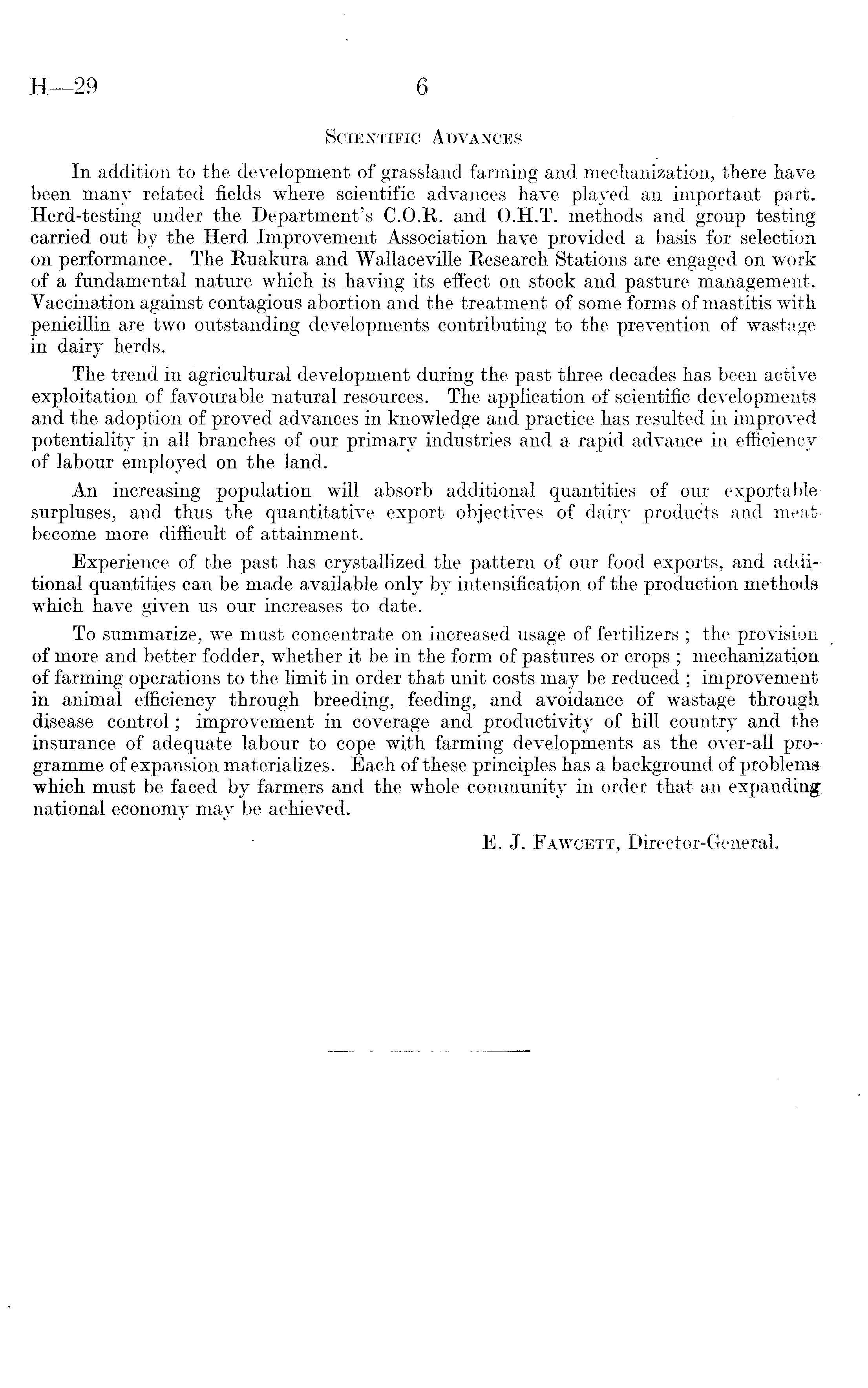 Scientific Advances In addition to the development of grassland farming and mechanization, there have been many related fields where scientific advances have played an important part. Herd-testing under the Department's C.O.R. and O.H.T. methods and group testing carried out by the Herd Improvement Association have provided a basis for selection on performance. The Huakura and Wallaceville Research Stations are engaged on work of a fundamental nature which is having its effect on stock and pasture management. Vaccination against contagious abortion and the treatment of some forms of mastitis with penicillin are two outstanding developments contributing to the prevention of wastage in dairy herds. The trend in agricultural development during the past three decades has been active exploitation of favourable natural resources. The application of scientific developments and the adoption of proved advances in knowledge and practice has resulted in improved potentiality in all branches of our primary industries and a rapid advance in efficiency of labour employed on the land. An increasing population will absorb additional quantities of our exportable surpluses, and thus the quantitative export objectives of dairy products and meatbecome more difficult of attainment. Experience of the past has crystallized the pattern of our food exports, and additional quantities can be made available only by intensification of the production methods which have given us our increases to date. To summarize, we must concentrate on increased usage of fertilizers ; the provision of more and better fodder, whether it be in the form of pastures or crops ; mechanization of farming operations to the limit in order that unit costs may be reduced ; improvement in animal efficiency through breeding, feeding, and avoidance of wastage through disease control; improvement in coverage and productivity of hill country and the insurance of adequate labour to cope with farming developments as the over-all programme of expansion materializes. Each of these principles has a background of problemswhich must be faced by farmers and the whole community in order that an expanding: national economy may be achieved. E. J. Fawcett, Director-General.