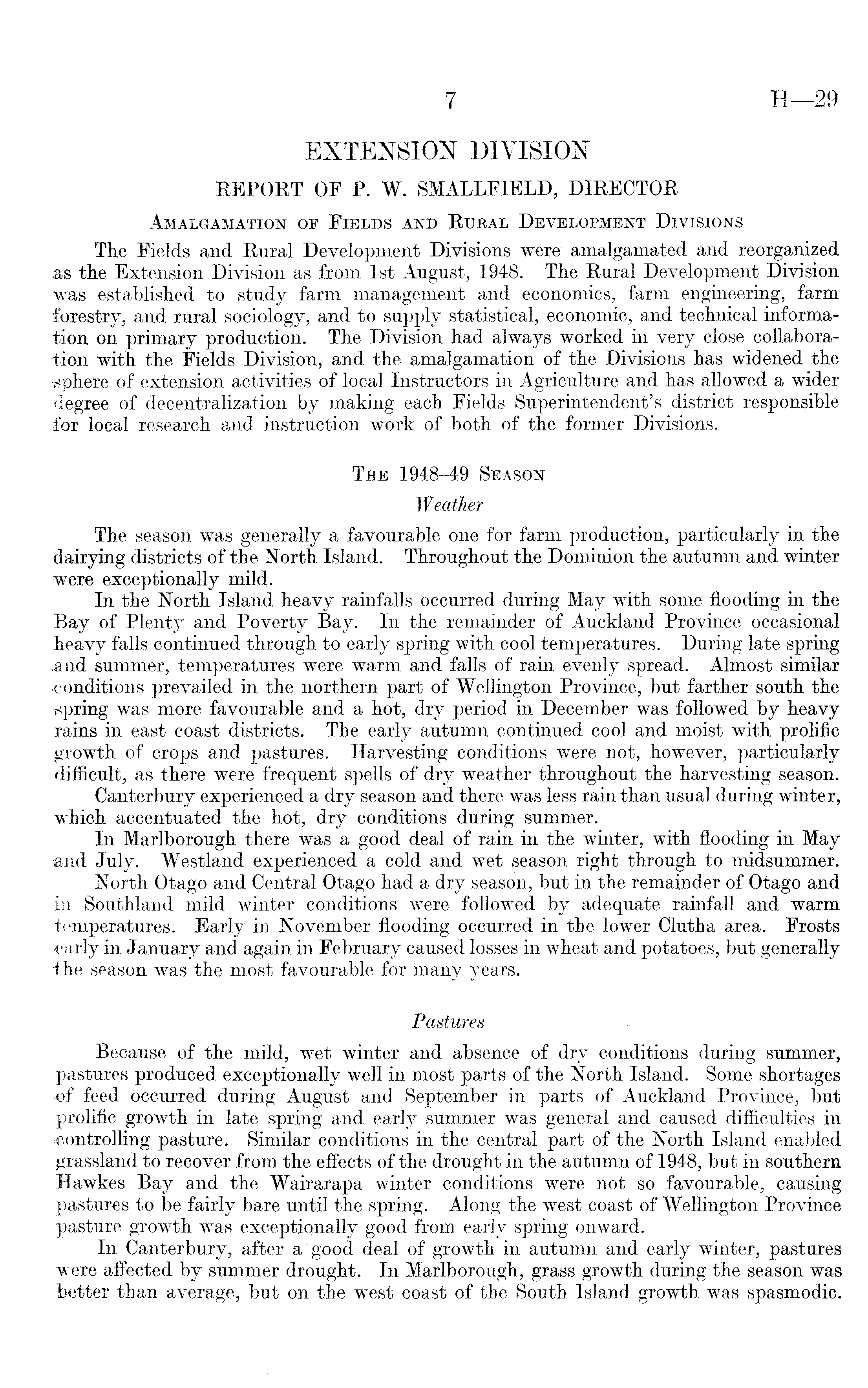 EXTENSION DIVISION REPORT OF P. W. SMALLFIELD, DIRECTOR Amalgamation of Fields and Rural Development Divisions The Fields and Rural Development Divisions were amalgamated and reorganized as the Extension Division as from Ist August, 1948. The Rural Development Division was established to study farm management and economics, farm engineering, farm forestry, and rural sociology, and to supply statistical, economic, and technical information on primary production. The Division had always worked in very close collaboration with the Fields Division, and the amalgamation of the Divisions has widened the ■sphere of extension activities of local Instructors in Agriculture and has allowed a wider degree of decentralization by making each Fields Superintendent's district responsible for local research and instruction work of both of the former Divisions. The 1948-49 Season Weather The season was generally a favourable one for farm production, particularly in the dairying districts of the North Island. Throughout the Dominion the autumn and winter were exceptionally mild. In the North Island heavy rainfalls occurred during May with some flooding in the Bay of Plenty and Poverty Bay. In the remainder of Auckland Province occasional heavy falls continued through to early spring with cool temperatures. During late spring and summer, temperatures were warm and falls of rain evenly spread. Almost similar •conditions prevailed in the northern part of Wellington Province, but farther south the spring was more favourable and a hot, dry period in December was followed by heavy rains in east coast districts. The early autumn continued cool and moist with prolific growth of crops and pastures. Harvesting conditions were not, however, particularly difficult, as there were frequent spells of dry weather throughout the harvesting season. Canterbury experienced a dry season and there was less rain than usual during winter, which accentuated the hot, dry conditions during summer. In Marlborough there was a good deal of rain in the winter, with flooding in May and July. Westland experienced a cold and wet season right through to midsummer. North Otago and Central Otago had a dry season, but in the remainder of Otago and in Southland mild winter conditions were followed by adequate rainfall and warm temperatures. Early in November flooding occurred in the lower Clutha area. Frosts early in January and again in February caused losses in wheat and potatoes, but generally the season was the most favourable for many years. Pastures Because of the mild, wet winter and absence of dry conditions during summer, pastures produced exceptionally well in most parts of the North Island. Some shortages •of feed occurred during August and September in parts of Auckland Province, but prolific growth in late spring and early summer was general and caused difficulties in -controlling pasture. Similar conditions in the central part of the North Island enabled grassland to recover from the effects of the drought in the autumn of 1948, but in southern Hawkes Bay and the Wairarapa winter conditions were not so favourable, causing pastures to be fairly bare until the spring. Along the west coast of Wellington Province pasture growth was exceptionally good from early spring onward. In Canterbury, after a good deal of growth in autumn and early winter, pastures were affected by summer drought. In Marlborough, grass growth during the season was better than average, but on the west coast of the South Island growth was spasmodic.