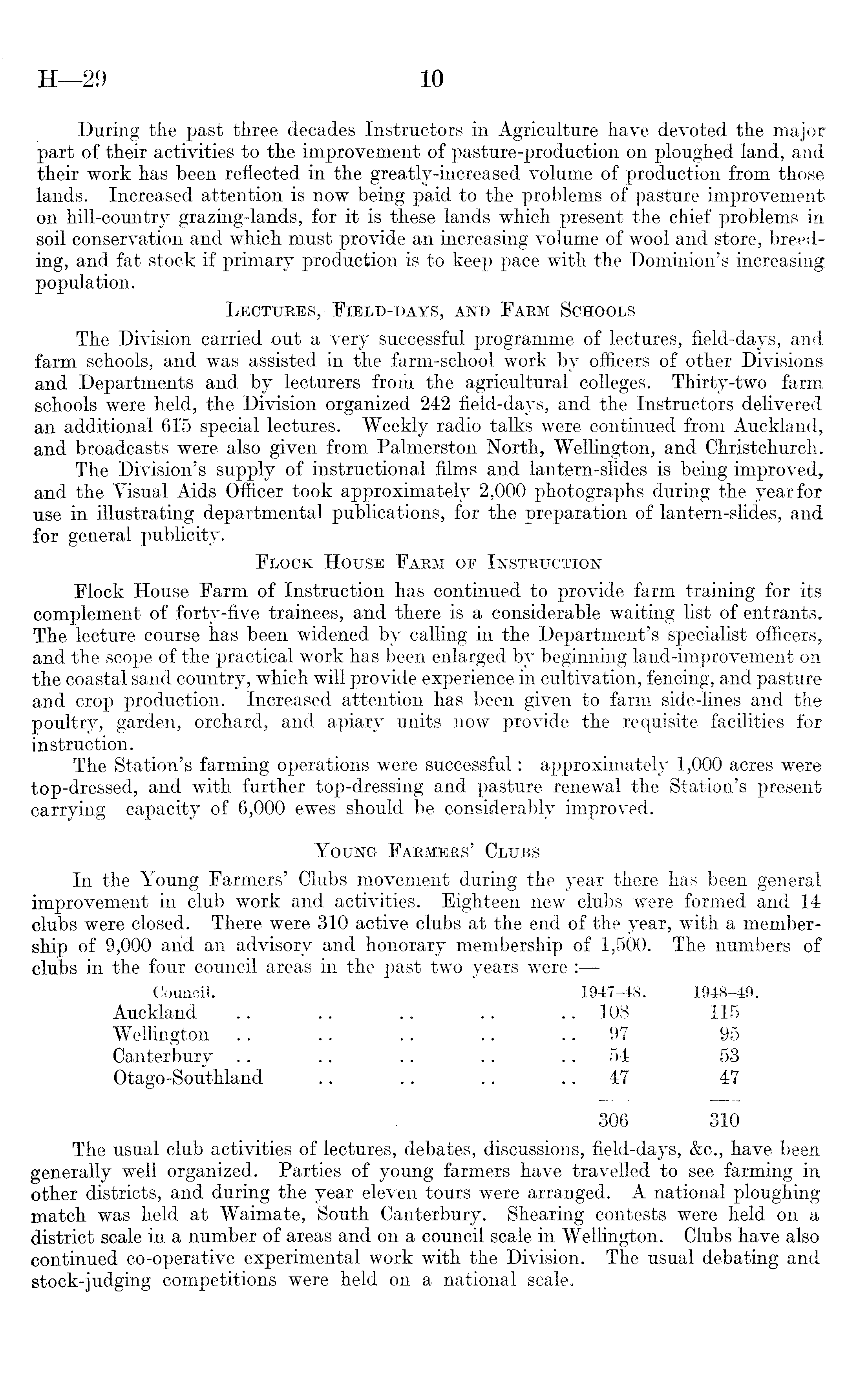 During the past three decades Instructors in Agriculture have devoted the major part of their activities to the improvement of pasture-production on ploughed land, and their work has been reflected in the greatly-increased volume of production from those lands. Increased attention is now being paid to the problems of pasture improvement on hill-country grazing-lands, for it is these lands which present the chief problems in soil conservation and which must provide an increasing volume of wool and store, breeding, and fat stock if primary production is to keep pace with the Dominion's increasing population. Lectures, Field-days, and Farm Schools The Division carried out a very successful programme of lectures, field-days, and farm schools, and was assisted in the farm-school work by officers of other Divisions and Departments and by lecturers from the agricultural colleges. Thirty-two farm schools were held, the Division organized 242 field-days, and the Instructors delivered an additional 61'5 special lectures. Weekly radio talks were continued from Auckland,, and broadcasts were also given from Palmerston North, Wellington, and Christchurch. The Division's supply of instructional films and lantern-slides is being improved, and the Visual Aids Officer took approximately 2,000 photographs during the year for use in illustrating departmental publications, for the preparation of lantern-slides, and for general publicity. Flock House Farm of Instruction Flock House Farm of Instruction has continued to provide farm training for its complement of forty-five trainees, and there is a considerable waiting list of entrants. The lecture course has been widened by calling in the Department's specialist officers, and the scope of the practical work has been enlarged by beginning land-improvement on the coastal sand country, which will provide experience in cultivation, fencing, and pasture and crop production. Increased attention has been given to farm side-lines and the poultry, garden, orchard, and apiary units now provide the requisite facilities for instruction. The Station's farming operations were successful: approximately 1,000 acres were top-dressed, and with further top-dressing and pasture renewal the Station's present carrying capacity of 6,000 ewes should be considerably improved. Young Farmers' Clubs In the Young Farmers' Clubs movement during the year there has been general improvement in club work and activities. Eighteen new clubs were formed and 14 clubs were closed. There were 310 active clubs at the end of the year, with a membership of 9,000 and an advisory and honorary membership of 1,500. The numbers of clubs in the four council areas in the past two years were : Council. 1948-49. Auckland .. .. .. .. .. • 108 115 Wellington .. .. .. .. 97 95 Canterbury .. .. .. .. 54 53 Otago-Southland .. .. .. 47 47 306 310 The usual club activities of lectures, debates, discussions, field-days, &c., have been generally well organized. Parties of young farmers have travelled to see farming in other districts, and during the year eleven tours were arranged. A national ploughing match was held at Waimate, South Canterbury. Shearing contests were held on a district scale in a number of areas and on a council scale in Wellington. Clubs have also continued co-operative experimental work with the Division. The usual debating and stock-judging competitions were held on a national scale.