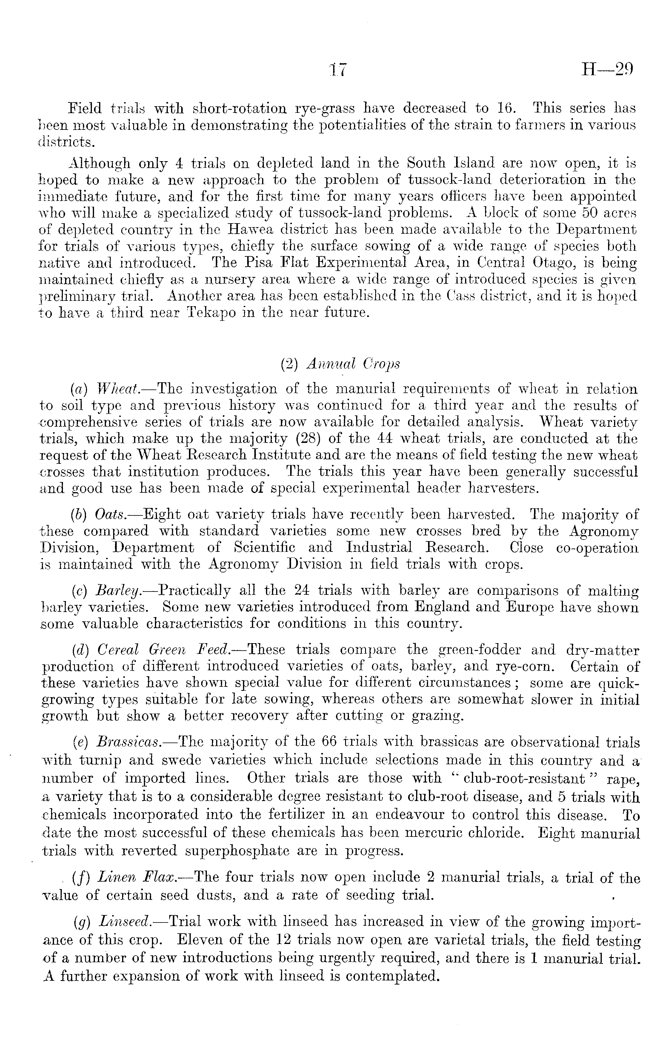 Field trials with short-rotation rye-grass have decreased to 16. This series has been most valuable in demonstrating the potentialities of the strain to farmers in various districts. Although only 4 trials on depleted land in the South Island are now open, it is hoped to make a new approach to the problem of tussock-land deterioration in the immediate future, and for the first time for many years officers have been appointed who will make a specialized study of tussock-land problems. A block of some 50 acres of depleted country in the Hawea district has been made available to the Department for trials of various types, chiefly the surface sowing of a wide range of species both native and introduced. The Pisa Flat Experimental Area, in Central Otago, is being maintained chiefly as a nursery area where a wide range of introduced species is given preliminary trial. Another area has been established in the Cass district, and it is hoped to have a third near Tekapo in the near future. (2) Annual Crops {a) Wheat. —The investigation of the manurial requirements of wheat in relation to soil type and previous history was continued for a third year and the results of •comprehensive series of trials are now available for detailed analysis. Wheat variety trials, which make up the majority (28) of the 44 wheat trials, are conducted at the request of the Wheat Research Institute and are the means of field testing the new wheat crosses that institution produces. The trials this year have been generally successful and good use has been made of special experimental header harvesters. (b) Oats.—Eight oat variety trials have recently been harvested. The majority of these compared with standard varieties some new crosses bred by the Agronomy Division, Department of Scientific and Industrial Research. Close co-operation is maintained with the Agronomy Division in field trials with crops. (c) Barley. —Practically all the 24 trials with barley are comparisons of malting barley varieties. Some new varieties introduced from England and Europe have shown some valuable characteristics for conditions in this country. (d) Cereal Green Feed. —These trials compare the green-fodder and dry-matter production of different introduced varieties of oats, barley, and rye-corn. Certain of these varieties have shown special value for different circumstances ; some are quickgrowing types suitable for late sowing, whereas others are somewhat slower in initial growth but show a better recovery after cutting or grazing. (e) Brassicas. —The majority of the 66 trials with brassicas are observational trials with turnip and swede varieties which include selections made in this country and a number of imported lines. Other trials are those with " club-root-resistant" rape, a variety that is to a considerable degree resistant to club-root disease, and 5 trials with chemicals incorporated into the fertilizer in an endeavour to control this disease. To date the most successful of these chemicals has been mercuric chloride. Eight manurial trials with reverted superphosphate are in progress. . (/) Linen Flax. —The four trials now open include 2 manurial trials, a trial of the value of certain seed dusts, and a rate of seeding trial. (g) Linseed. —Trial work with linseed has increased in view of the growing importance of this crop. Eleven of the 12 trials now open are varietal trials, the field testing of a number of new introductions being urgently required, and there is 1 manurial trial. A further expansion of work with linseed is contemplated.