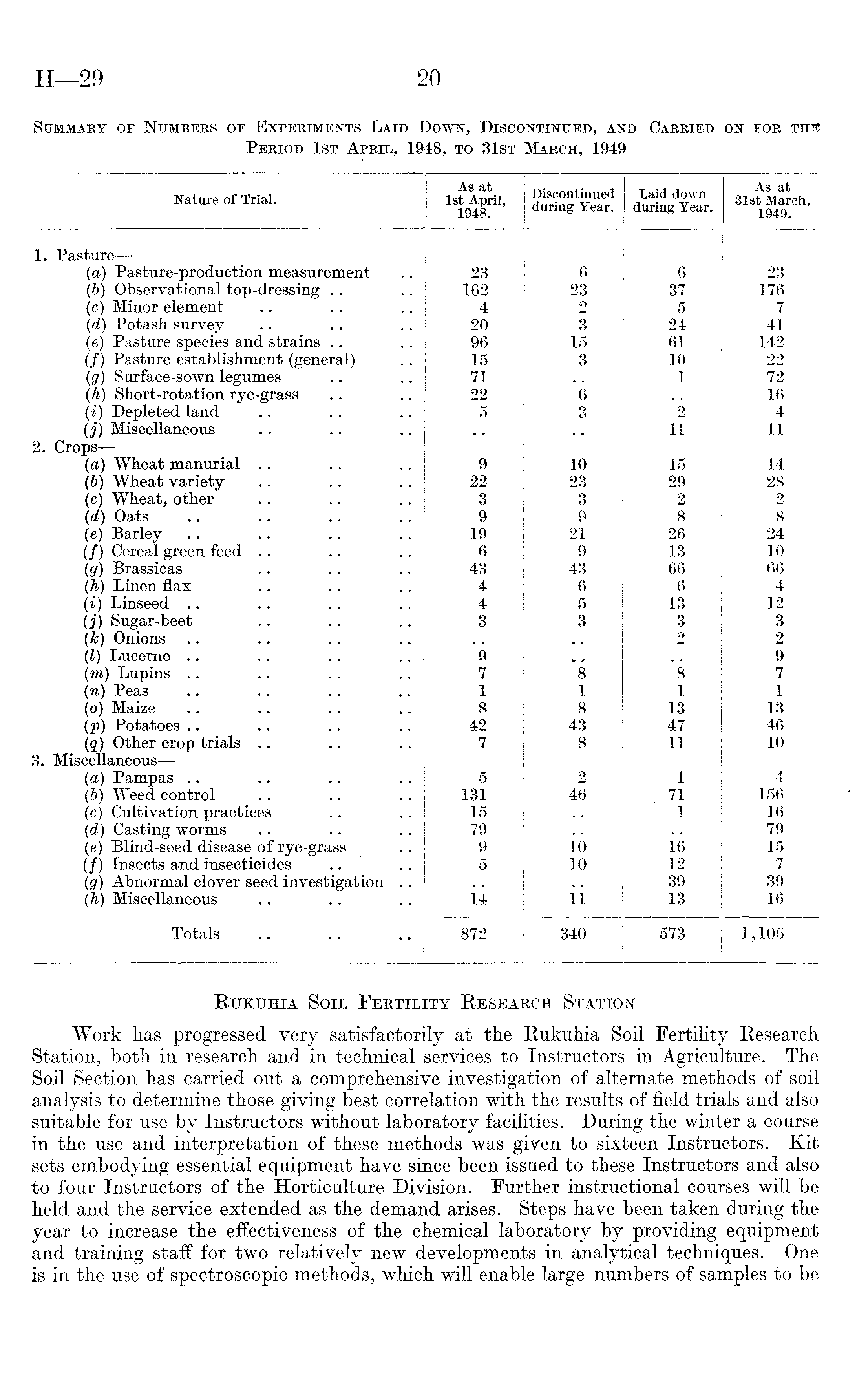 Rukuhia Soil Fertility Research Station Work lias progressed very satisfactorily at the Rukuhia Soil Fertility Research Station, both in research and in technical services to Instructors in Agriculture. The Soil Section has carried out a comprehensive investigation of alternate methods of soil analysis to determine those giving best correlation with the results of field trials and also suitable for use by Instructors without laboratory facilities. During the winter a course in the use and interpretation of these methods was given to sixteen Instructors. Kit sets embodying essential equipment have since been issued to these Instructors and also to four Instructors of the Horticulture Division. Further instructional courses will be held and the service extended as the demand arises. Steps have been taken during the year to increase the effectiveness of the chemical laboratory by providing equipment and training staff for two relatively new developments in analytical techniques. One is in the use of spectroscopic methods, which will enable large numbers of samples to be