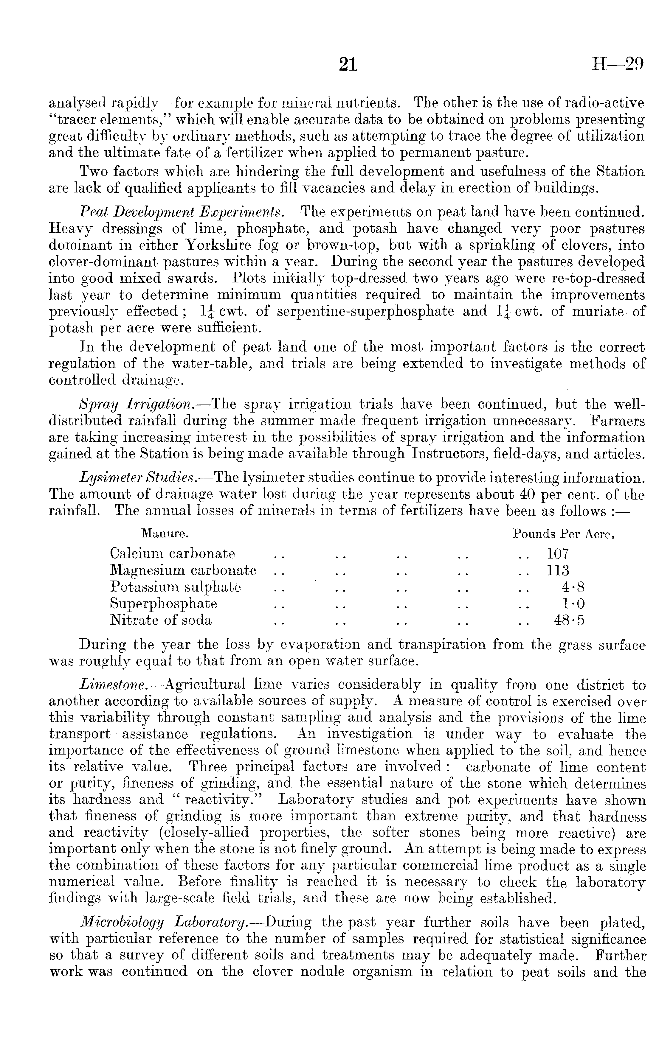 analysed rapidly—for example for mineral nutrients. The other is the use of radio-active "tracer elements," which will enable accurate data to be obtained on problems presenting great difficulty by ordinary methods, such as attempting to trace the degree of utilization and the ultimate fate of a fertilizer when applied to permanent pasture. Two factors which are hindering the full development and usefulness of the Station are lack of qualified applicants to fill vacancies and delay in erection of buildings. Peat Development Experiments.—-The experiments on peat land have been continued. Heavy dressings of lime, phosphate, and potash have changed very poor pastures dominant in either Yorkshire fog or brown-top, but with a sprinkling of clovers, into clover-dominant pastures within a year. During the second year the pastures developed into good mixed swards. Plots initially top-dressed two years ago were re-top-dressed last year to determine minimum quantities required to maintain the improvements previously effected; 1J cwt. of serpentine-superphosphate and 1J cwt. of muriate of potash per acre were sufficient. In the development of peat land one of the most important factors is the correct regulation of the water-table, and trials are being extended to investigate methods of controlled drainage. Sjpray Irrigation.—The spray irrigation trials have been continued, but the welldistributed rainfall during the summer made frequent irrigation unnecessary. Farmers are taking increasing interest in the possibilities of spray irrigation and the information gained at the Station is being made available through Instructors, field-days, and articles. Lysimeter Studies.—The lysimeter studies continue to provide interesting information. The amount of drainage water lost during the year represents about 40 per cent, of the rainfall. The annual losses of minerals in terms of fertilizers have been as follows : Manure. Pounds Per Acre. Calcium carbonate .. .. .. .. .. 107 Magnesium carbonate .. .. .. .. ..113 Potassium sulphate .. .. .. .. .. 4*B Superphosphate .. .. .. .. .. 1-0 Nitrate of soda .. .. .. .. 48 • 5 During the year the loss by evaporation and transpiration from the grass surface was roughly equal to that from an open water surface. Limestone.—Agricultural lime varies considerably in quality from one district to another according to available sources of supply. A measure of control is exercised over this variability through constant sampling and analysis and the provisions of the lime transport assistance regulations. An investigation is under way to evaluate the importance of the effectiveness of ground limestone when applied to the soil, and hence its relative value. Three principal factors are involved : carbonate of lime content or purity, fineness of grinding, and the essential nature of the stone which determines its hardness and " reactivity." Laboratory studies and pot experiments have shown that fineness of grinding is more important than extreme purity, and that hardness and reactivity (closely-allied properties, the softer stones being more reactive) are important only when the stone is not finely ground. An attempt is being made to express the combination of these factors for any particular commercial lime product as a single numerical value. Before finality is reached it is necessary to check the laboratory findings with large-scale field trials, and these are now being established. Microbiology Laboratory.—During the past year further soils have been plate'd, with particular reference to the number of samples required for statistical significance so that a survey of different soils and treatments may be adequately made. Further work was continued on the clover nodule organism in relation to peat soils and the