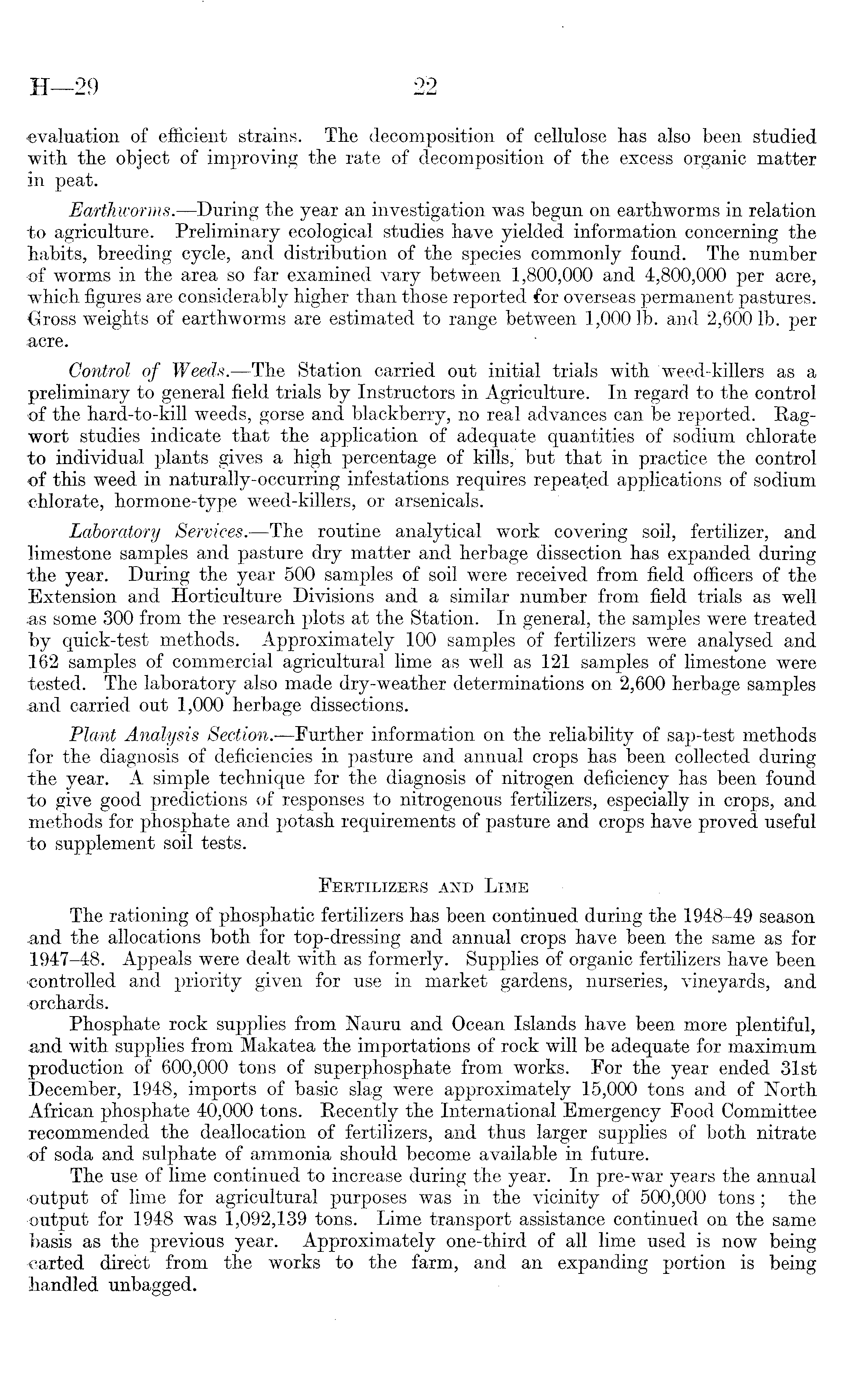 ■evaluation of efficient strains. The decomposition of cellulose lias also been studied with the object of improving the rate of decomposition of the excess organic matter in peat. Earthworm's.—During the year an investigation was begun on earthworms in relation to agriculture. Preliminary ecological studies have yielded information concerning the habits, breeding cycle, and distribution of the species commonly found. The number of worms in the area so far examined vary between 1,800,000 and 4,800,000 per acre, which figures are considerably higher than those reported for overseas permanent pastures. •Gross weights of earthworms are estimated to range between 1,000 lb. and 2,600 lb. per acre. Control of Weeds. —The Station carried out initial trials with weed-killers as a preliminary to general field trials by Instructors in Agriculture. In regard to the control of the hard-to-kill weeds, gorse and blackberry, no real advances can be reported. Ragwort studies indicate that the application of adequate quantities of sodium chlorate to individual plants gives a high percentage of kills, but that in practice the control of this weed in naturally-occurring infestations requires repeated applications of sodium chlorate, hormone-type weed-killers, or arsenicals. Laboratory Services. —The routine analytical work covering soil, fertilizer, and limestone samples and pasture dry matter and herbage dissection has expanded during the year. During the year 500 samples of soil were received from field officers of the Extension and Horticulture Divisions and a similar number from field trials as well as some 300 from the research plots at the Station. In general, the samples were treated by quick-test methods. Approximately 100 samples of fertilizers were analysed and 162 samples of commercial agricultural lime as well as 121 samples of limestone were tested. The laboratory also made dry-weather determinations on 2,600 herbage samples and carried out 1,000 herbage dissections. Plant Analysis Section.—Further information on the reliability of sap-test methods for the diagnosis of deficiencies in pasture and annual crops has been collected during the year. A simple technique for the diagnosis of nitrogen deficiency has been found to give good predictions of responses to nitrogenous fertilizers, especially in crops, and methods for phosphate and potash requirements of pasture and crops have proved useful to supplement soil tests. Fertilizers and Lime The rationing of phosphatic fertilizers has been continued during the'l94B-49 season and the allocations both for top-dressing and annual crops have been the same as for 1947-48. Appeals were dealt with as formerly. Supplies of organic fertilizers have been controlled and priority given for use in market gardens, nurseries, vineyards, and orchards. Phosphate rock supplies from Nauru and Ocean Islands have been more plentiful, and with supplies from Makatea the importations of rock will be adequate for maximum production of 600,000 tons of superphosphate from works. For the year ended 31st December, 1948, imports of basic slag were approximately 15,000 tons and of North African phosphate 40,000 tons. Recently the International Emergency Food Committee recommended the deallocation of fertilizers, and thus larger supplies of both nitrate of soda and sulphate of ammonia should become available in future. The use of lime continued to increase during the year. In pre-war years the annual output of lime for agricultural purposes was in the vicinity of 500,000 tons; the output for 1948 was 1,092,139 tons. Lime transport assistance continued on the same basis as the previous year. Approximately one-third of all lime used is now being carted direct from the works to the farm, and an expanding portion is being Jiandled unbagged.