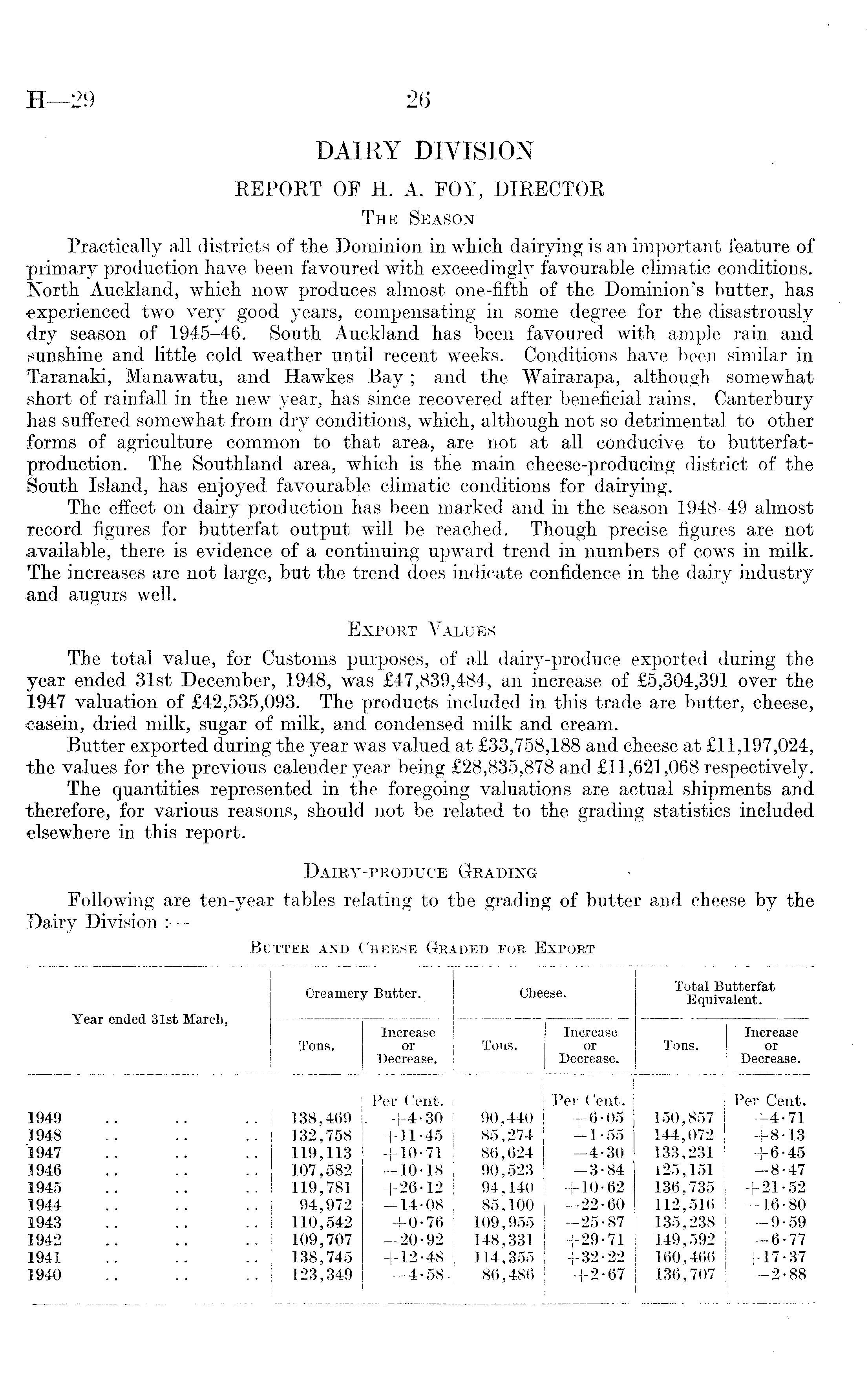 DAIRY DIVISION REPORT OF H. A. FOY, DIRECTOR The Season Practically all districts of the Dominion in which dairying is an important feature of primary production have been favoured with exceedingly favourable climatic conditions. North Auckland, which now produces almost one-fifth of the Dominion's butter, has experienced two very good years, compensating in some degree for the disastrously dry season of 1945-46. South Auckland has been favoured with ample rain and sunshine and little cold weather until recent weeks. Conditions have been similar in Taranaki, Manawatu, and Hawkes Bay; and the Wairarapa, although somewhat short of rainfall in the new year, has since recovered after beneficial rains. Canterbury has suffered somewhat from dry conditions, which, although not so detrimental to other forms of agriculture common to that area, are not at all conducive to butterfatproduction. The Southland area, which is the main cheese-producing district of the South Island, has enjoyed favourable climatic conditions for dairying. The effect on dairy production has been marked and in the season 1948-49 almost record figures for butterfat output will be reached. Though precise figures are not available, there is evidence of a continuing upward trend in numbers of cows in milk. The increases are not large, but the trend does indicate confidence in the dairy industry and augurs well. Export Values The total value, for Customs purposes, of all dairy-produce exported during the year ended 31st December, 1948, was £47,839,484, an increase of £5,304,391 over the 1947 valuation of £42,535,093. The products included in this trade are butter, cheese, casein, dried milk, sugar of milk, and condensed milk and cream. Butter exported during the year was valued at £33,758,188 and cheese at £11,197,024, the values for the previous calender year being £28,835,878 and £11,621,068 respectively. The quantities represented in the foregoing valuations are actual shipments and therefore, for various reasons, should not be related to the grading statistics included elsewhere in this report. Dairy-produce Grading Following are ten-year tables relating to the grading of butter and cheese by the Dairy Division :