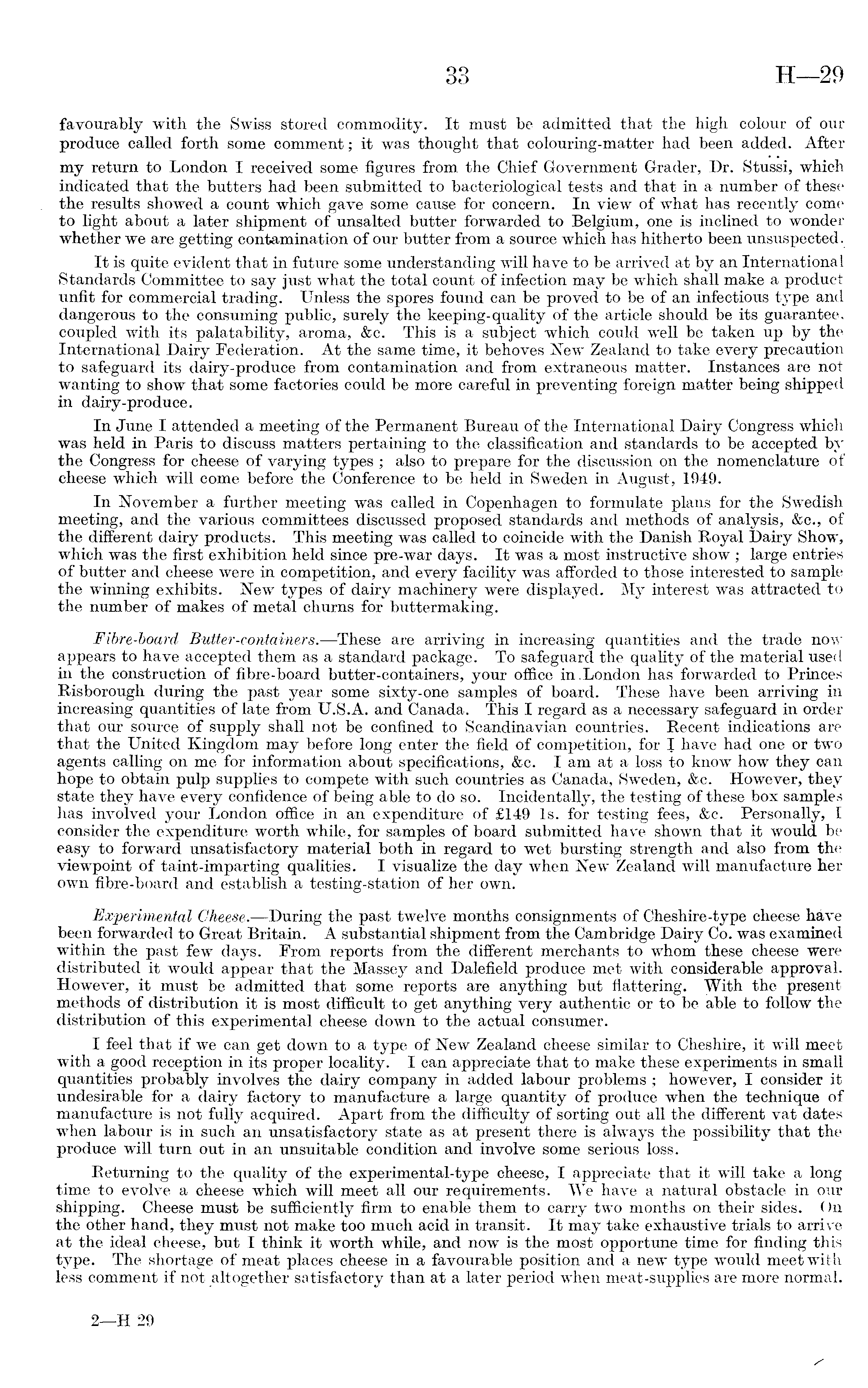 favourably with the Swiss stored commodity. It must be admitted that the high colour of our produce called forth some comment; it was thought that colouring-matter had been added. After my return to London I received some figures from the Chief Government Grader, Dr. Stussi, which indicated that the butters had been submitted to bacteriological tests and that in a number of these the results showed a count which gave some cause for concern. In view of what has recently come to light about a later shipment of unsalted butter forwarded to Belgium, one is inclined to wonder whether we are getting contamination of our butter from a source which has hitherto been unsuspected. It is quite evident that in future some understanding will have to be arrived at by an International Standards Committee to say just what the total count of infection may be which shall make a product unfit for commercial trading. Unless the spores found can be proved to be of an infectious type and dangerous to the consuming public, surely the keeping-quality of the article should be its guarantee, coupled with its palatability, aroma, &c. This is a subject which could well be taken up by the International Dairy Federation. At the same time, it behoves New Zealand to take every precaution to safeguard its dairy-produce from contamination and from extraneous matter. Instances are not wanting to show that some factories could be more careful in preventing foreign matter being shipped in dairy-produce. In June I attended a meeting of the Permanent Bureau of the International Dairy Congress which was held in Paris to discuss matters pertaining to the classification and standards to be accepted by the Congress for cheese of varying types ; also to prepare for the disctxssion on the nomenelature of cheese which will come before the Conference to be held in Sweden in August, 1949. In November a further meeting was called in Copenhagen to formulate plans for the Swedish meeting, and the various committees discussed proposed standards and methods of analysis, &c., of the different dairy products. This meeting was called to coincide with the Danish Royal Dairy Show, which was the first exhibition held since pre-war days. It was a most instructive show ; large entries of butter and cheese were in competition, and every facility was afforded to those interested to sample the winning exhibits. New types of dairy machinery were displayed. My interest was attracted to the number of makes of metal churns for buttermaking. Fibre-board Butter-containers.—These are arriving in increasing quantities and the trade now appears to have accepted them as a standard package. To safeguard the quality of the material used in the construction of fibre-board butter-containers, your office in.London has forwarded to Princes Risborough during the past year some sixty-one samples of board. These have been arriving in increasing quantities of late from U.S.A. and Canada. This I regard as a necessary safeguard in order that our source of supply shall not be confined to Scandinavian countries. Recent indications are that the United Kingdom may before long enter the field of competition, for I have had one or two agents calling on me for information about specifications, &c. lamat a loss to know how they can hope to obtain pulp supplies to compete with such countries as Canada, Sweden, &c. However, they state they have every confidence of being able to do so. Incidentally, the testing of these box samples has involved your London office in an expenditure of £149 Is. for testing fees, &c. Personally, I consider the expenditure worth while, for samples of board submitted have shown that it would be easy to forward unsatisfactory material both in regard to wet bursting strength and also from the viewpoint of taint-imparting qualities. I visualize the day when New Zealand will manufacture her own fibre-board and establish a testing-station of her own. Experimental Cheese.—During the past twelve months consignments of Cheshire-type cheese have been forwarded to Great Britain. A substantial shipment from the Cambridge Dairy Co. was examined within the past few days. From reports from the different merchants to whom these cheese were distributed it would appear that the Massey and Dalefield produce met with considerable approval. However, it must be admitted that some reports are anything but flattering. With the present methods of distribution it is most difficult to get anything very authentic or to be able to follow the distribution of this experimental cheese down to the actual consumer. I feel that if we can get down to a type of New Zealand cheese similar to Cheshire, it will meet with a good reception in its proper locality. I can appreciate that to make these experiments in small quantities probably involves the dairy company in added labour problems ; however, I consider it undesirable for a dairy factory to manufacture a large quantity of produce when the technique of manufacture is not fully acquired. Apart from the difficulty of sorting out all the different vat dates when labour is in such an unsatisfactory state as at present there is always the possibility that the produce will turn out in an unsuitable condition and involve some serious loss. Returning to the quality of the experimental-type cheese, I appreciate that it will take a long time to evolve a cheese which will meet all our requirements. We have a natural obstacle in our shipping. Cheese must be sufficiently firm to enable them to carry two months on their sides. On the other hand, they must not make too much acid in transit. It may take exhaustive trials to arrive at the ideal cheese, but I think it worth while, and now is the most opportune time for finding this type. The shortage of meat places cheese in a favourable position and a new type would meet with less comment if not altogether satisfactory than at a later period when meat-supplies are more normal.