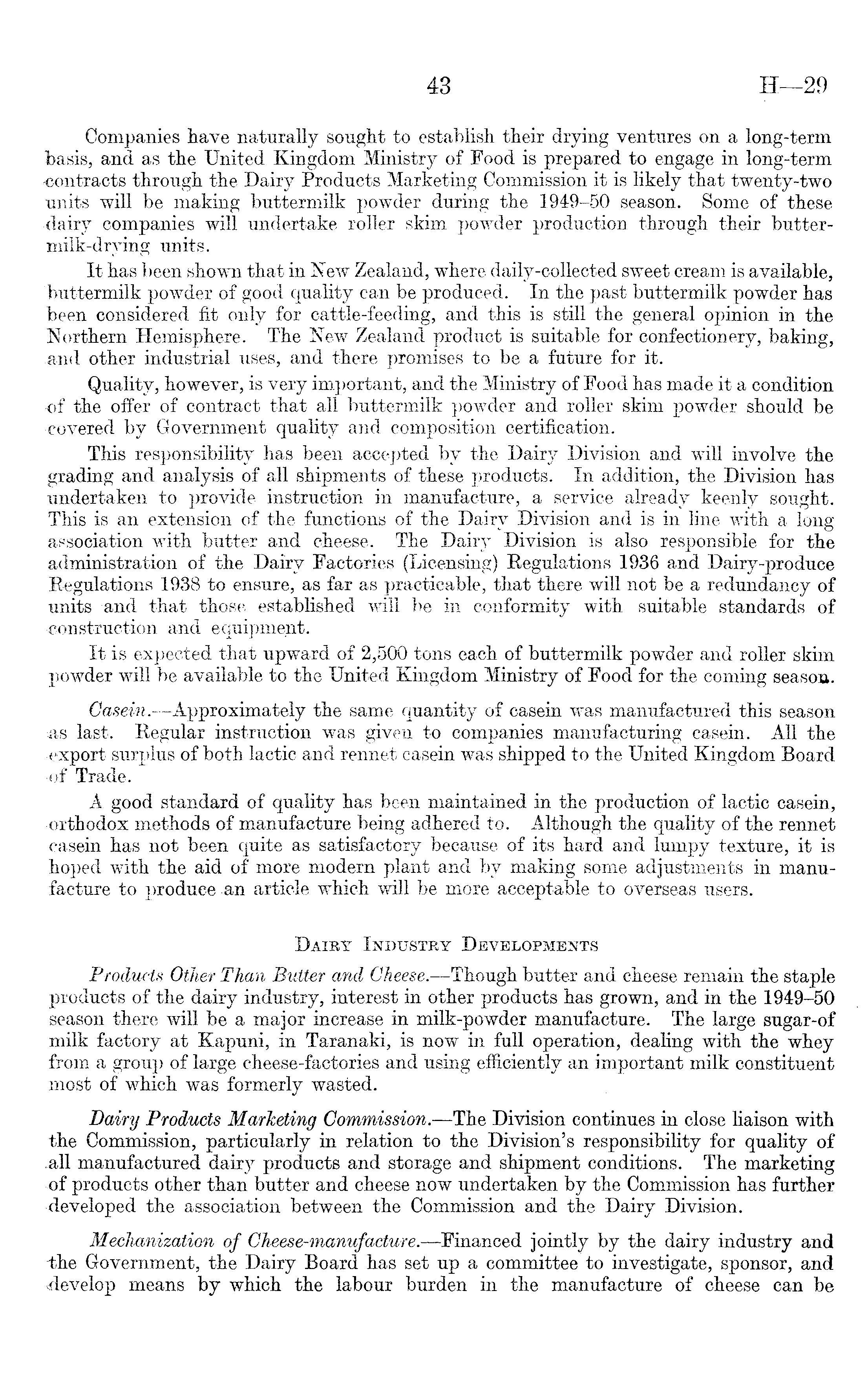 Companies have naturally sought to establish their drying ventures on a long-term basis, and as the United Kingdom Ministry of Food is prepared to engage in long-term -contracts through the Dairy Products Marketing Commission it is likely that twenty-two units will be making buttermilk powder during the 1949-50 season. Some of these dairy companies will undertake roller skim powder production through their butter-milk-drying units. It has been shown that in New Zealand, where daily-collected sweet cream is available, buttermilk powder of good quality can be produced. In the past buttermilk powder has been considered fit only for cattle-feeding, and this is still the general opinion in the Northern Hemisphere. The New Zealand product is suitable for confectionery, baking, and other industrial uses, and there promises to be a future for it. Quality, however, is very important, and the Ministry of Food has made it a condition of the offer of contract that all buttermilk powder and roller skim powder should be by Government quality and composition certification. This responsibility has been accepted by the Dairy Division and will involve the grading and analysis of all shipments of these products. In addition, the Division has undertaken to provide instruction in manufacture, a service already keenly sought. This is an extension of the functions of the Dairy Division and is in line with a long association with butter and cheese. The Dairy Division is also responsible for the administration of the Dairy Factories (Licensing) Regulations 1936 and Dairy-produce Regulations 1938 to ensure, as far as practicable, that there will not be a redundancy of units and that those established will be in conformity with suitable standards of •construction and equipment. It is expected that upward of 2,500 tons each of buttermilk powder and roller skim powder will be available to the United Kingdom Ministry of Food for the coming season. Casein.—Approximately the same quantity of casein was manufactured this season as last. Regular instruction was given to companies manufacturing casein. All the export surplus of both lactic and rennet casein was shipped to the United Kingdom Board •of Trade. A good standard of quality has been maintained in the production of lactic casein, orthodox methods of manufacture being adhered to. Although the quality of the rennet casein has not been quite as satisfactory because of its hard and lumpy texture, it is hoped with the aid of more modern plant and by making some adjustments in manufacture to produce an article which will be more acceptable to overseas users. Dairy Industry Developments Products Other Than Butter and Cheese.—Though butter and cheese remain the staple products of the dairy industry, interest in other products has grown, and in the 1949-50 season there will be a major increase in milk-powder manufacture. The large sugar-of milk factory at Kapuni, in Taranaki, is now in full operation, dealing with the whey from a group of large cheese-factories and using efficiently an important milk constituent most of which was formerly wasted. Dairy Products Marketing Commission.—The Division continues in close liaison with the Commission, particularly in relation to the Division's responsibility for quality of all manufactured dairy products and storage and shipment conditions. The marketing of products other than butter and cheese now undertaken by the Commission has further developed the association between the Commission and the Dairy Division. Mechanization of Cheese-manufacture. —Financed jointly by the dairy industry and ■the Government, the Dairy Board has set up a committee to investigate, sponsor, and develop means by which the labour burden in the manufacture of cheese can be