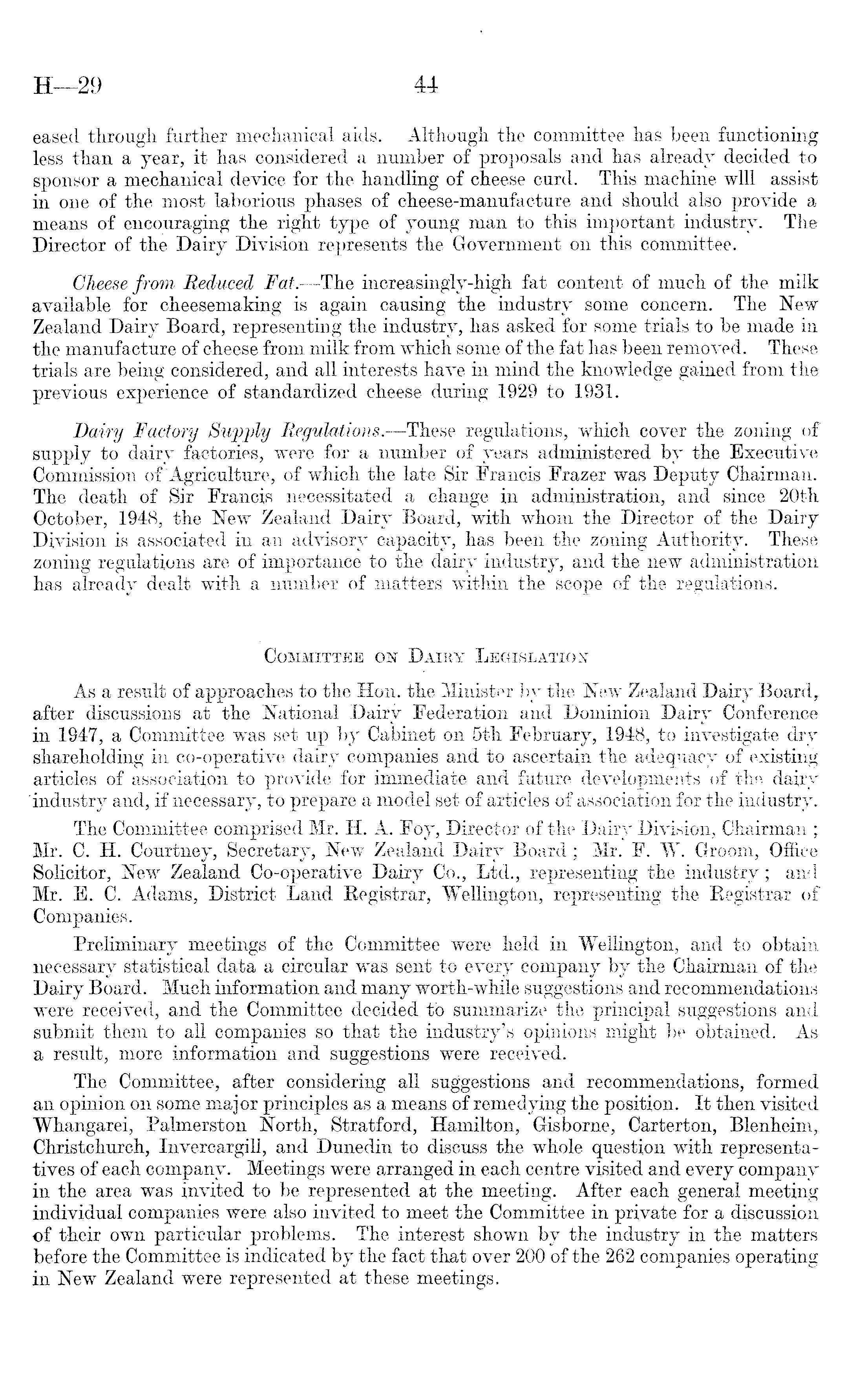 eased through further mechanical aids. Although the committee has been functioning less than a year, it has considered a number of proposals and has already decided to sponsor a mechanical device for the handling of cheese curd. This machine will assist in one of the most laborious phases of cheese-manufacture and should also provide a means of encouraging the right type of young man to this important industry. The Director of the Dairy Division represents the Government on this committee. Cheese from Reduced Fat.—The increasingly-high fat content of much of the milk available for cheesemaking is again causing the industry some concern. The New Zealand Dairy Board, representing the industry, has asked for some trials to be made in the manufacture of cheese from milk from which some of the fat has been removed. These trials are being considered, and all interests have in mind the knowledge gained from the previous experience of standardized cheese during 1929 to 1931. Dairy Factory Supply Regulations.—These regulations, which cover the zoning of supply to dairy factories, were for a number of years administered by the Executive Commission of Agriculture, of which the late Sir Francis Frazer was Deputy Chairman. The death of Sir Francis necessitated a change in administration, and since 20th October, 1948, the New Zealand Dairy Board, with whom the Director of the Dairy Division is associated in an advisory capacity, has been the zoning Authority. These zoning regulations are of importance to the dairy industry, and the new administration has already dealt with a number of matters within the scope of the regulations. Committee on Dairy Legislation As a result of approaches to the Hon. the Minister by the New Zealand Dairy Board, after discussions at the National Dairy Federation and Dominion Dairy Conference in 1947, a Committee was set up by Cabinet on sth February, 1948, to investigate dry shareholding in co-operative dairy companies and to ascertain the adequacy of existing articles of association to provide for immediate and future developments of the dairy industry and, if necessary, to prepare a model set of articles of association for the industry. The Committee comprised Mr. H. A. Foy, Director of the Dairy Division, Chairman ; Mr. C. H. Courtney, Secretary, New Zealand Dairy Board ; Mr. F. W. Groom, Office Solicitor, New Zealand Co-operative Dairy Co., Ltd., representing the industry; and Mr. E. C. Adams, District Land Registrar, Wellington, representing the Registrar of Companies. Preliminary meetings of the Committee were held in Wellington, and to obtain necessary statistical data a circular was sent to every company by the Chairman of the Dairy Board. Much information and many worth-while suggestions and recommendations were received, and the Committee decided to summarize the principal suggestions and submit them to all companies so that the industry's opinions might be obtained. As a result, more information and suggestions were received. The Committee, after considering all suggestions and recommendations, formed an opinion on some major principles as a means of remedying the position. It then visited Whangarei, Palmerston North, Stratford, Hamilton, Gisborne, Carterton, Blenheim, Christchurch, Invercargill, and Dunedin to discuss the whole question with representatives of each company. Meetings were arranged in each centre visited and every company in the area was invited to be represented at the meeting. After each general meeting individual companies were also invited to meet the Committee in private for a discussion of their own particular problems. The interest shown by the industry in the matters before the Committee is indicated by the fact that over 200 of the 262 companies operating in New Zealand were represented at these meetings.