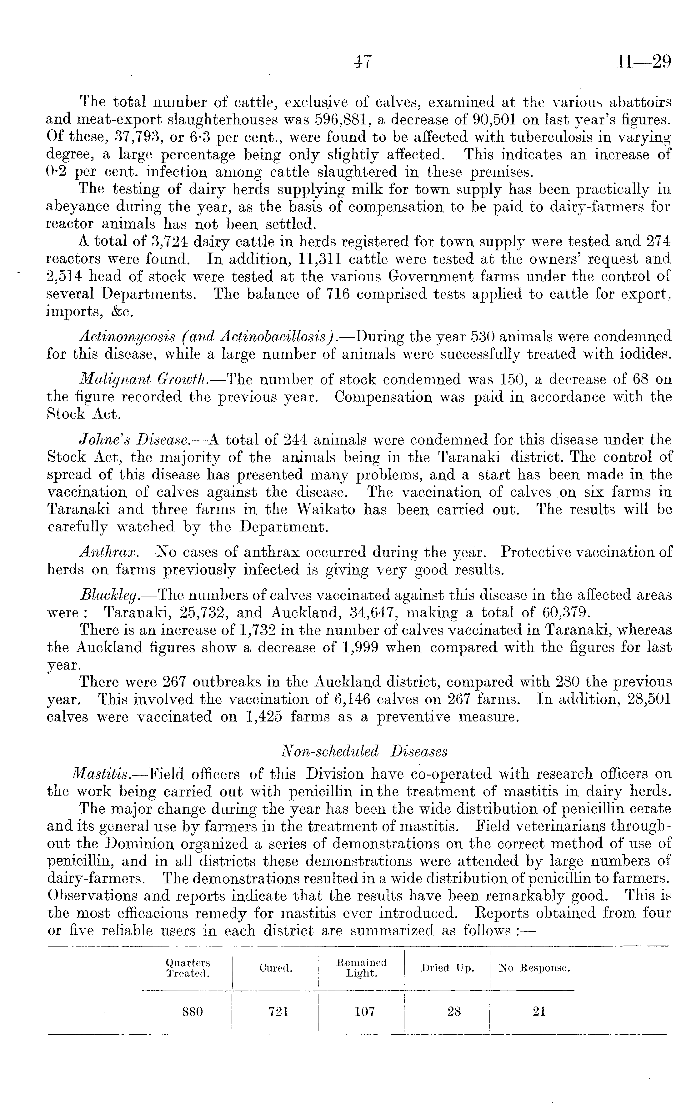 The total number of cattle, exclusive of calves, examined at the various abattoirs and meat-export slaughterhouses was 596,881, a decrease of 90,501 on last year's figures. Of these, 37,793, or 6*3 per cent., were found to be affected with tuberculosis in varying degree, a large percentage being only slightly affected. This indicates an increase of 0-2 per cent, infection among cattle slaughtered in these premises. The testing of dairy herds supplying milk for town supply has been practically in abeyance during the year, as the basis of compensation to be paid to dairy-farmers for reactor animals has not been settled. A total of 3,724 dairy cattle in herds registered for town supply were tested and 274 reactors were found. In addition, 11,311 cattle were tested at the owners' request and 2,514 head of stock were tested at the various Government farms under the control of several Departments. The balance of 716 comprised tests applied to cattle for export, imports, &c. Actinomycosis. (and Actinobacillosis). —During the year 530 animals were condemned for this disease, while a large number of animals were successfully treated with iodides. Malignant Growth.—The number of stock condemned was 150, a decrease of 68 on the figure recorded the previous year. Compensation was paid in accordance with the Stock Act. Johne's Disease. —A total of 244 animals were condemned for this disease under the Stock Act, the majority of the animals being in the Taranaki district. The control of spread of this disease has presented many problems, and a start has been made in the vaccination of calves against the disease. The vaccination of calves on six farms in Taranaki and three farms in the Waikato has been carried out. The results will be carefully watched by the Department. Anthrax.—No cases of anthrax occurred during the year. Protective vaccination of herds on farms previously infected is giving very good results. Blackleg. —The numbers of calves vaccinated against this disease in the affected areas were : Taranaki, 25,732, and Auckland, 34,647, making a total of 60,379. There is an increase of 1,732 in the number of calves vaccinated in Taranaki, whereas the Auckland figures show a decrease of 1,999 when compared with the figures for last year. There were 267 outbreaks in the Auckland district, compared with 280 the previous year. This involved the vaccination of 6,146 calves on 267 farms. In addition, 28,501 calves were vaccinated on 1,425 farms as a preventive measure. Non-scheduled Diseases Mastitis.—Field officers of this Division have co-operated with research officers on the work being carried out with penicillin in the treatment of mastitis in dairy herds. The major change during the year has been the wide distribution of penicillin cerate and its general use by farmers in the treatment of mastitis. Field veterinarians throughout the Dominion organized a series of demonstrations on the correct method of use of penicillin, and in all districts these demonstrations were attended by large numbers of dairy-farmers. The demonstrations resulted in a wide distribution of penicillin to farmers. Observations and reports indicate that the results have been remarkably good. This is the most efficacious remedy for mastitis ever introduced. Reports obtained from four or five reliable users in each district are summarized as follows :