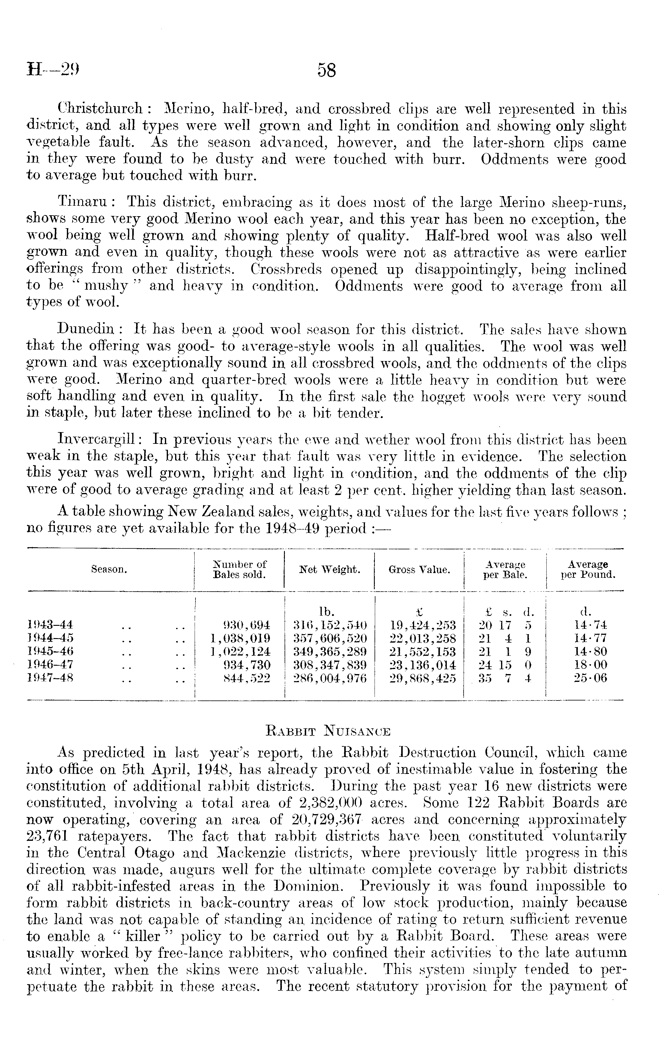 Christchurch : Merino, half-bred, and crossbred clips are well represented in this district, and all types were well grown and light in condition and showing only slight vegetable fault. As the season advanced, however, and the later-shorn clips came in they were found to be dusty and were touched with burr. Oddments were good to average but touched with burr. Timaru: This district, embracing as it does most of the large Merino sheep-runs, shows some very good Merino wqpl each year, and this year has been no exception, the wool being well grown and showing plenty of quality. Half-bred wool was also well grown and even in quality, though these wools were not as attractive as were earlier offerings from other districts. Crossbreds opened .up disappointingly, being inclined to be " mushy " and heavy in condition. Oddments were good to average from all types of wool. Dunedin : It has been a good wool season for this district. The sales have shown that the offering was good- to average-style wools in all qualities. The wool was well grown and was exceptionally sound in all crossbred wools, and the oddments of the clips were good. Merino and quarter-bred wools were a little heavy in condition but were soft handling and even in quality. In the first sale the hogget wools were very sound in staple, but later these inclined to be a bit tender. Invercargill: In previous years the ewe and wether wool from this district has been weak in the staple, but this year that fault was very little in evidence. The selection this year was well grown, bright and light in condition, and the oddments of the clip were of good to average grading and at least 2 per cent, higher yielding than last season. A table showing New Zealand sales, weights, and values for the last five years follows ; no figures are yet available for the 1948-49 period :