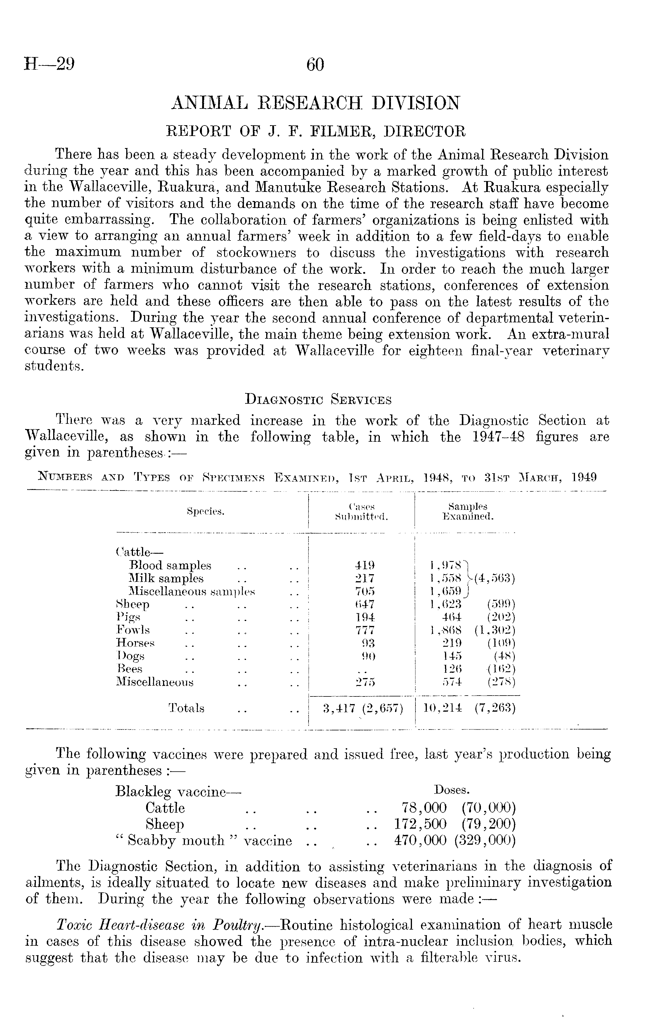 ANIMAL RESEARCH DIVISION REPORT OF J. F. FILMER, DIRECTOR There has been a steady development in the work of the Animal Research Division during the year and this has been accompanied by a marked growth of public interest in the Wallaceville, Ruakura, and Manutuke Research Stations. At Ruakura especially the number of visitors and the demands on the time of the research staff have become quite embarrassing. The collaboration of farmers' organizations is being enlisted with a view to arranging an annual farmers' week in addition to a few field-days to enable the maximum number of stockowners to discuss the investigations with research workers with a minimum disturbance of the work. In order to reach the much larger number of farmers who cannot visit the research stations, conferences of extension workers are held and these officers are then able to pass on the latest results of the investigations. During the year the second annual conference of departmental veterinarians was held at Wallaceville, the main theme being extension work. An extra-mural course of two weeks was provided at Wallaceville for eighteen final-year, veterinary students. Diagnostic Services There was a very marked increase in the work of the Diagnostic Section at Wallaceville, as shown in the following table, in which the 1947-48 figures are given in parentheses-: