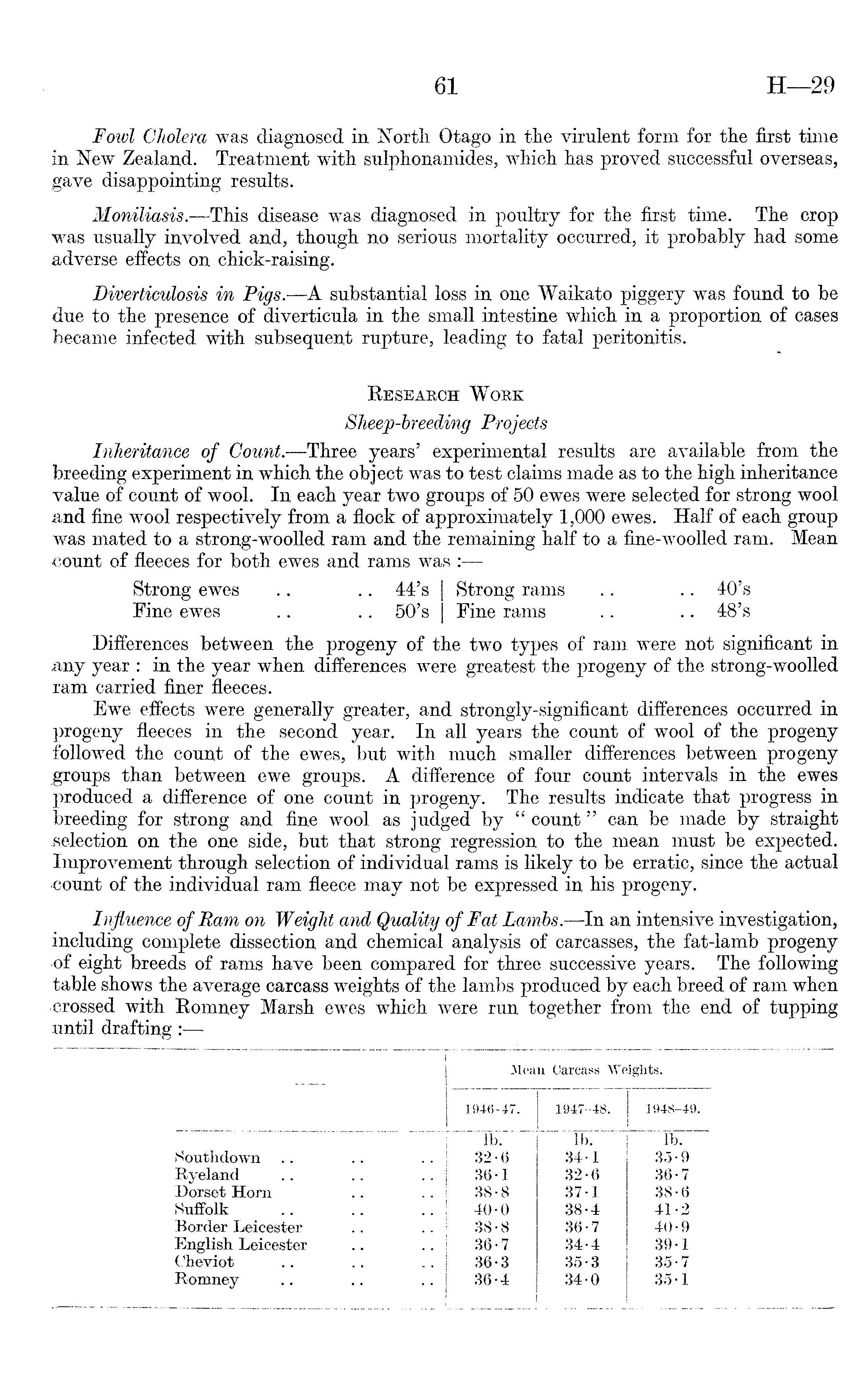 Fowl Cholera was diagnosed in North. Otago in the virulent form for the first time in New Zealand. Treatment with sulphonamides, which has proved successful overseas, gave disappointing results. Moniliasis.—This disease was diagnosed in poultry for the first time. The crop was usually involved and, though no serious mortality occurred, it probably had some adverse effects on chick-raising. Diverticulosis in Pigs.—A substantial loss in one Waikato piggery was found to be due to the presence of diverticula in the small intestine which in a proportion of cases became infected with subsequent rupture, leading to fatal peritonitis. Research Work Sheep-breeding Projects Inheritance of Count. —Three years' experimental results are available from the breeding experiment in which the object was to test claims made as to the high inheritance value of count of wool. In each year two groups of 50 ewes were selected for strong wool and fine wool respectively from a flock of approximately 1,000 ewes.' Half of each group was mated to a strong-woolled ram and the remaining half to a fine-woolled ram. Mean count of fleeces for both ewes and rams was : Strong ewes .. .. 44's | Strong rams .. .. 40's Fine ewes .. .. 50's j Fine rams .. .. 48's Differences between the progeny of the two types of ram were not significant in any year': in the year when differences were greatest the progeny of the strong-woolled ram carried finer fleeces. Ewe effects were generally greater, and strongly-significant differences occurred in progeny fleeces in the second year. In all years the count of wool of the progeny followed the count of the ewes, but with much smaller differences between progeny groups than between ewe groups. A difference of four count intervals in the ewes produced a difference of one count in progeny. The results indicate that progress in breeding for strong and fine wool as judged by " count" can be made by straight selection on the one side, but that strong regression to the mean must be expected. Improvement through selection of individual rams is likely to be erratic, since the actual -count of the individual ram fleece may not be expressed in his progeny. Influence of Ram on Weight and Quality of Fat Lambs. —In an intensive investigation, including complete dissection and chemical analysis of carcasses, the fat-lamb progeny of eight breeds of rams have been compared for three successive years. The following table shows the average carcass weights of the lambs produced by each breed of ram when crossed with Romney Marsh ewes which were run together from the end of tupping until drafting