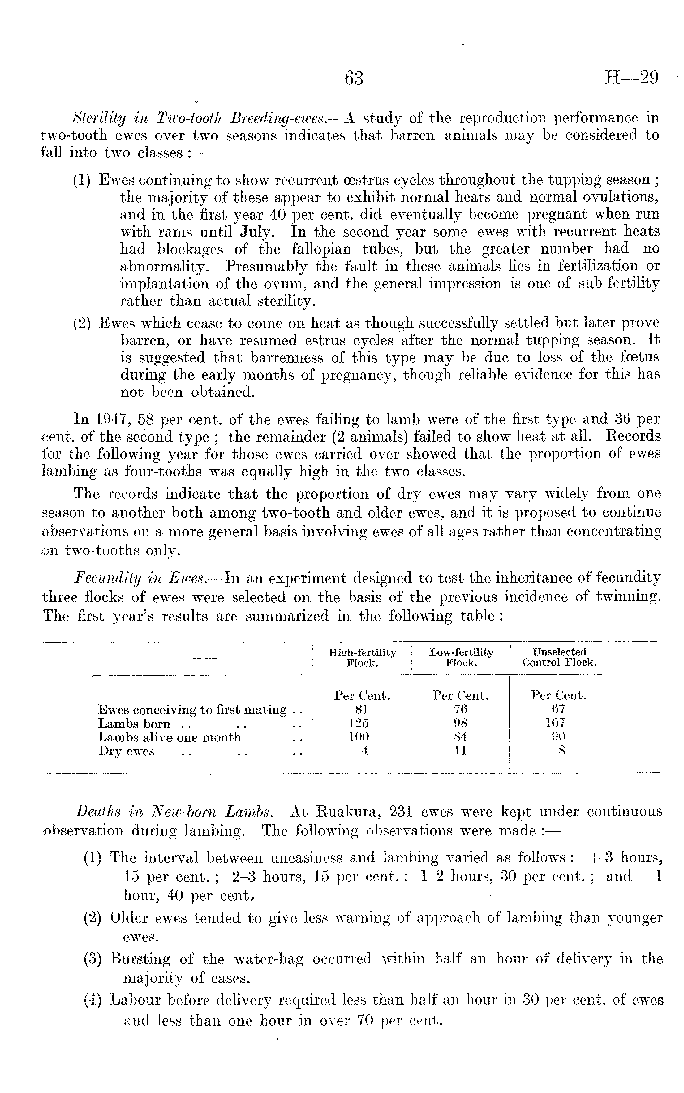 Sterility in Two-tooth Breeding-ewes. —A study of the reproduction performance in two-tooth ewes over two seasons indicates that barren animals may be considered to fall into two classes (1) Ewes continuing to show recurrent oestrus cycles throughout the tupping season; the majority of these appear to exhibit normal heats and normal ovulations, and in the first year 40 per cent, did eventually become pregnant when run with rams until July. In the second year some ewes with recurrent heats had blockages of the fallopian tubes, but the greater number had no abnormality. Presumably the fault in these animals lies, in fertilization or implantation of the ovum, and the general impression is one of sub-fertility rather than actual sterility. (2) Ewes which cease to come on heat as though successfully settled but later prove barren, or have resumed estrus cycles after the normal tupping season. It is suggested that barrenness of this type may be due to loss of the foetus during the early months of pregnancy, though reliable evidence for this has not been obtained. In 1947, 58 per cent, of the ewes failing to lamb were of the first type and 36 per cent, of the second type ; the remainder (2 animals) failed to show heat at all. Records for the following year for those ewes carried over showed that the proportion of ewes lambing as four-tooths was equally high in the two classes. The records indicate that the proportion of dry ewes may vary widely from one season to another both among two-tooth and older ewes, and it is proposed to continue observations on a more general basis involving ewes of all ages rather than concentrating on two-tooths only. Fecundity in Ewes. —In an experiment designed to test the inheritance of fecundity three flocks of ewes were selected on the basis of the previous incidence of twinning. The first year's results are summarized in the following table :