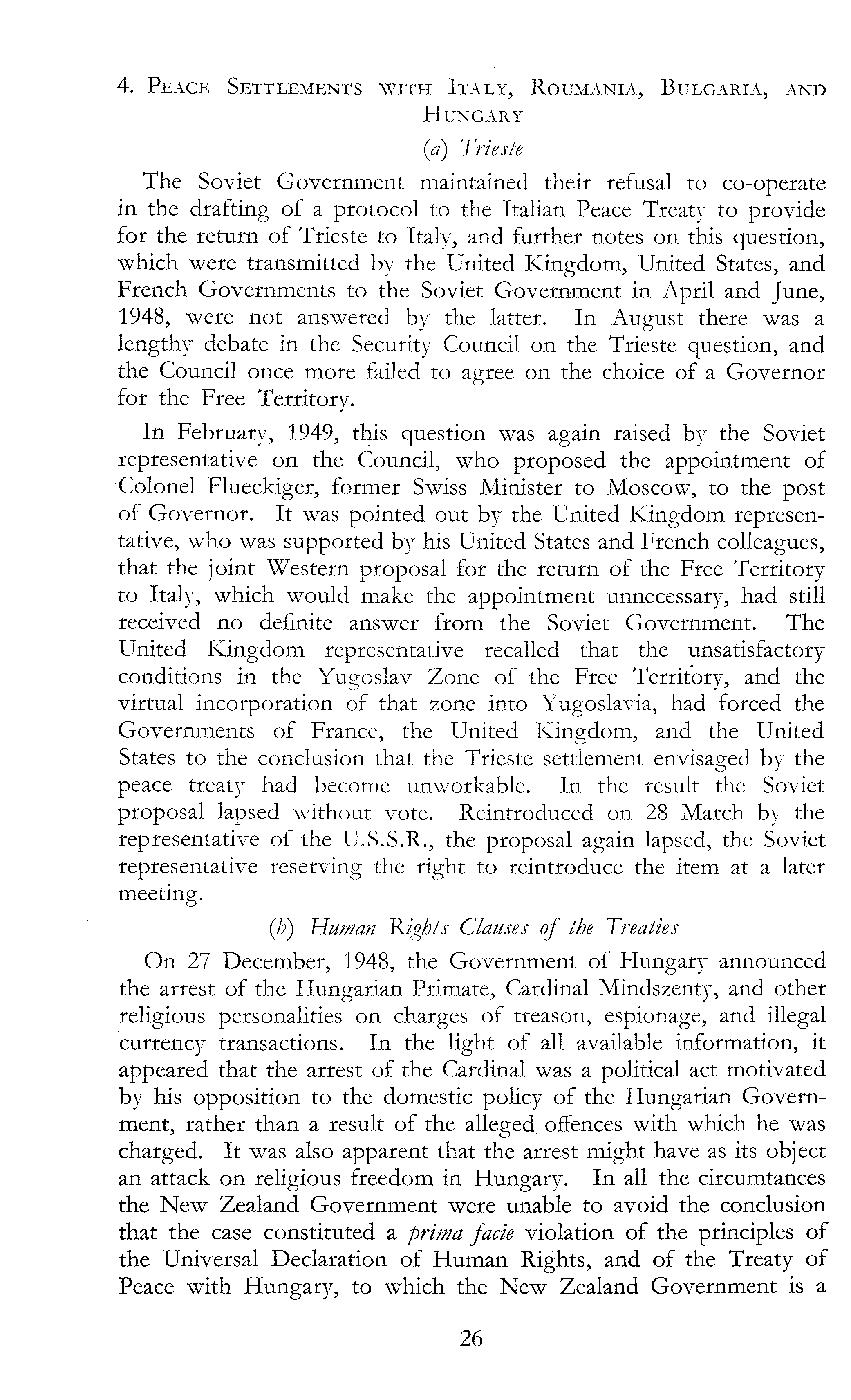 4. Peace Settlements with Italy, Roumania, Bulgaria, and Hungary (a) Trieste The Soviet Government maintained their refusal to co-operate in the drafting of a protocol to the Italian Peace Treaty to provide for the return of Trieste to Italy, and further notes on this question, which were transmitted by the United Kingdom, United States, and French Governments to the Soviet Government in April and June, 1948, were not answered by -the latter. In August there was a lengthy debate in the Security Council on the Trieste question, and the Council once more failed to agree on the choice of a Governor for the Free Territory. In February, 1949, this question was again raised by the Soviet representative on the Council, who proposed the appointment of Colonel Flueckiger, former Swiss Minister to Moscow, to the post of Governor. It was pointed out by the United Kingdom representative, who was supported by his United States and French colleagues, that the joint Western proposal for the return of the Free Territory to Italy, which "Would make the appointment unnecessary, had still received no definite answer from the Soviet Government. The United Kingdom representative recalled that the unsatisfactory conditions in the Yugoslav Zone of the Free Territory, and the virtual incorporation of that zone into Yugoslavia, had forced the Governments of France, the United Kingdom, and the United States to the conclusion that the Trieste settlement envisaged by the peace treaty had become unworkable. In the result the Soviet proposal lapsed without vote. Reintroduced on 28 March by the representative of the U.S.S.R., the proposal again lapsed, the Soviet representative reserving the right to reintroduce the item at a later meeting. (b) Human Rights Clauses of the Treaties On 27 December, 1948, the Government of Hungary announced the arrest of the Hungarian Primate, Cardinal Mindszenty, and other religious personalities on charges of treason, espionage, and illegal currency transactions. In the light of all available information, it appeared that the arrest of the Cardinal was a political act motivated by his opposition to the domestic policy of the Hungarian Government, rather than a result of the alleged, offences with which he was charged. It was also apparent that the arrest might have as its object an attack on religious freedom in Hungary. In all the circumtances the New Zealand Government were unable to avoid the conclusion that the case constituted a prima facie violation of the principles of the Universal Declaration of Human Rights, and of the Treaty of Peace with Hungary, to which the New Zealand Government is a