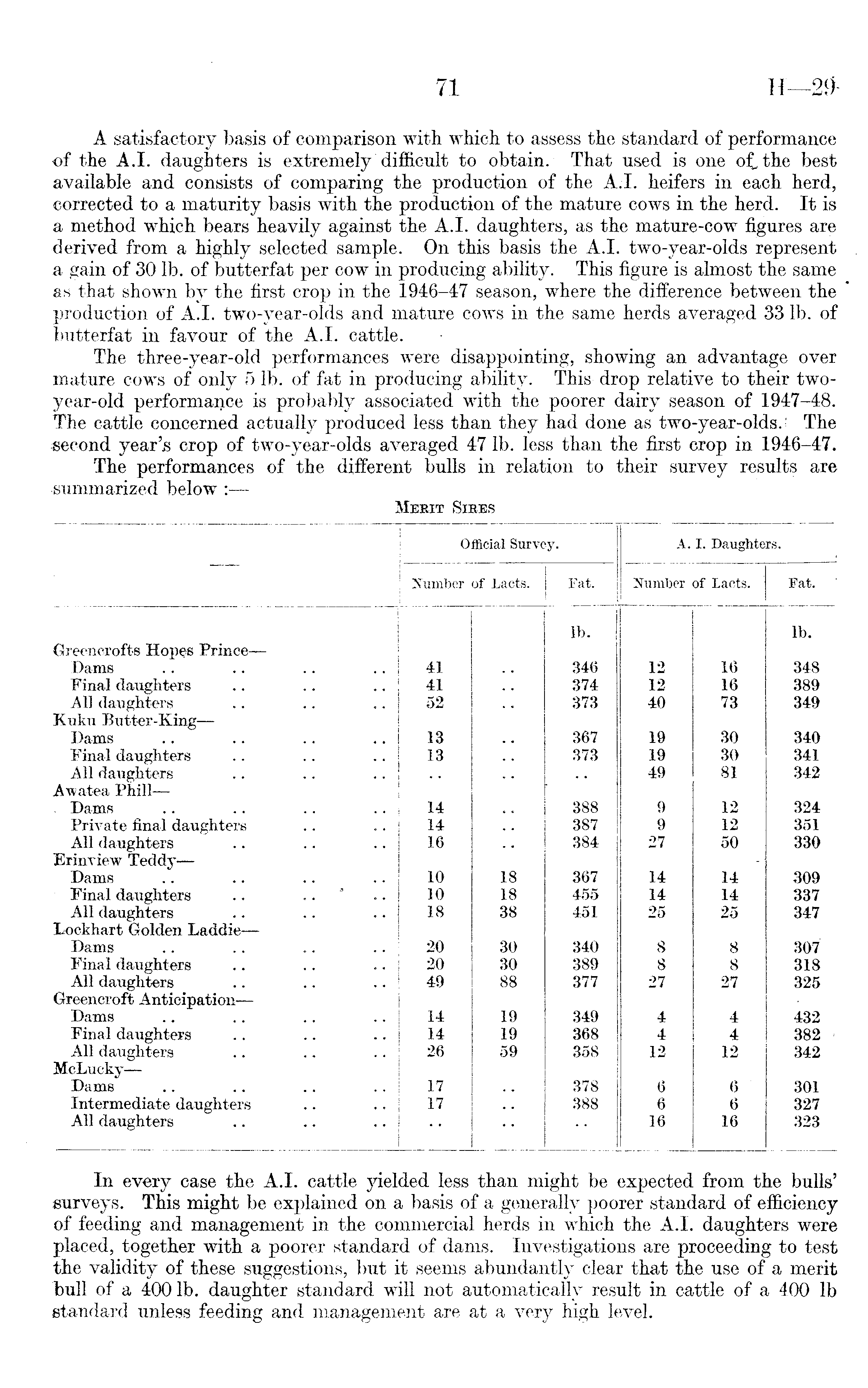 A satisfactory basis of comparison with which to assess the standard of performance of the A.I. daughters is extremely difficult to obtain. That used is one o£,the best available and consists of comparing the production of the A.I. heifers in each herd, corrected to a maturity basis with the production of the mature cows in the herd. It is a method which bears heavily against the A.l. daughters, as the mature-cow figures are derived from a highly selected sample. On this basis the A.I. two-year-olds represent & gain of 30 lb. of butterfat per cow in producing ability. This figure is almost the same as that shown by the first crop in the 1946-47 season, where the difference between the production of A.I. two-year-olds and mature cows in the same herds averaged 33 lb. of butterfat in favour of the A.I. cattle. The three-year-old performances were disappointing, showing an advantage over mature cows of only 5 lb. of fat in producing ability. This drop relative" to their two-year-old performance is probably associated with the poorer dairy season of 1947-48. The cattle concerned actually produced less than they had done as two-year-olds. ' The second year's crop of two-year-olds averaged 47 lb. less than the first crop in 1946-47. The performances of the different bulls in relation to their survey results are summarized below :