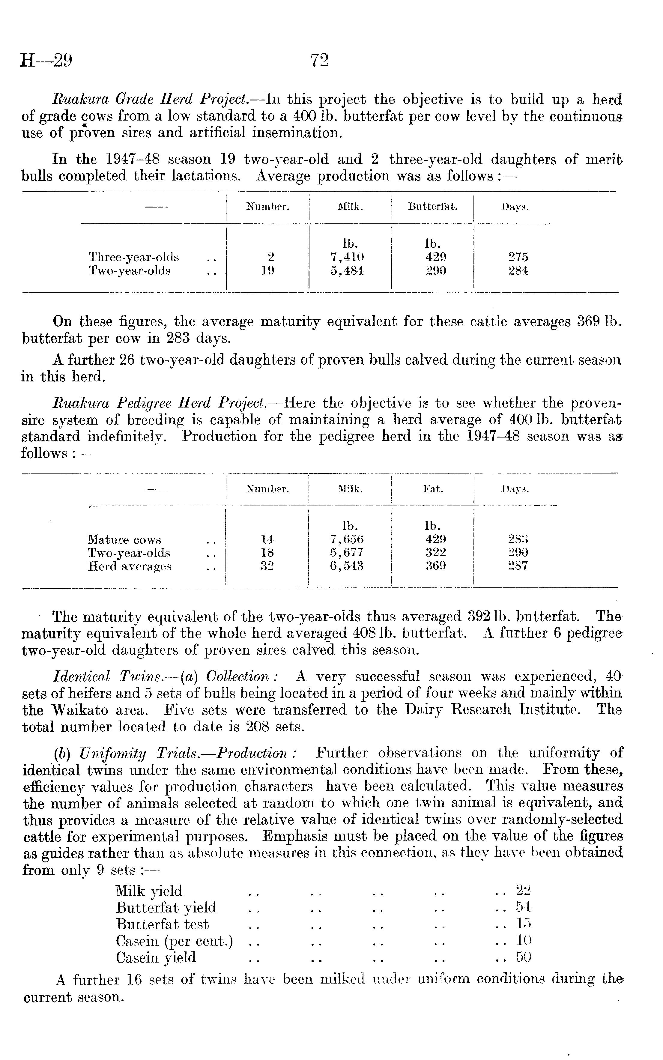 Ruakura Grade Herd Project. —In this project the objective is to build up a herd of grade cows from a low standard to a 400 lb. butterfat per cow level by the continuous use of proven sires and artificial insemination. In the 1947-48 season 19 two-year-old and 2 three-year-old daughters of meritbulls completed their lactations. Average production was as follows :