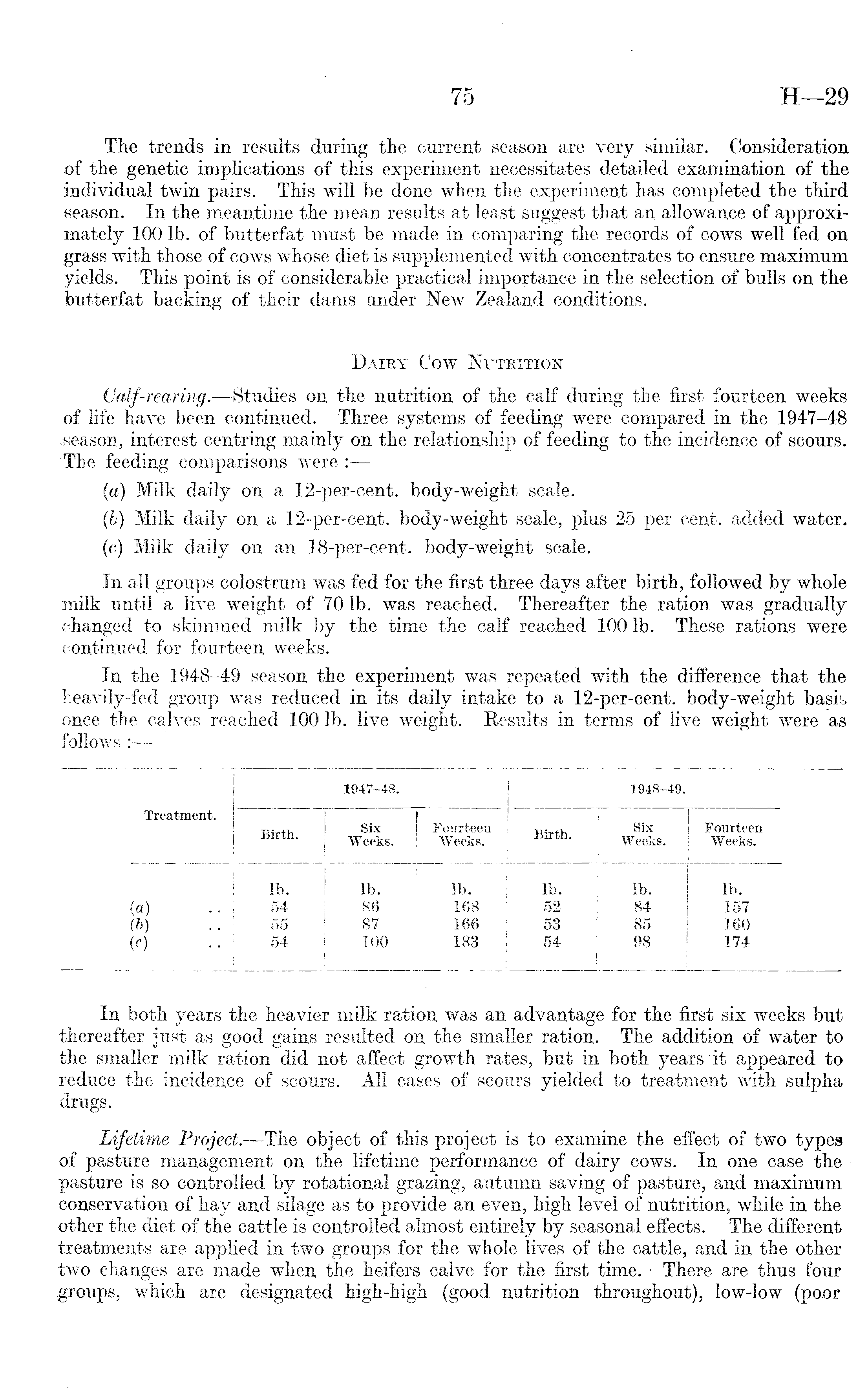 The trends in results during the current season are very similar. Consideration •of the genetic implications of this experiment necessitates detailed examination of the individual twin pairs. This will be done when the experiment has completed the third season. In the meantime the mean results at least suggest that an allowance of approximately 100 lb. of butterfat must be made in comparing the records of cows well fed on _grass with those of cows whose diet is supplemented with concentrates to ensure maximum yields. This point is of considerable practical importance in the selection of bulls on the butterfat backing of their dams under New Zealand conditions. Dairy Cow Nutrition Calf-rearing. —Studies on the nutrition of the calf during the first fourteen weeks of life have been continued. Three systems of feeding were compared in the 1947-48 interest centring mainly on the relationship of feeding to the incidence of scours. The feeding comparisons were : {a) Milk daily on a 12-per-cent. body-weight scale. (6) Milk daily on a 12-per-cent. body-weight scale, plus 25 per cent, added water. (c) Milk daily on an 18-per-cent. body-weight scale. In all groups colostrum was fed for the first three days after birth, followed by whole milk until a live weight of 70 lb. was reached. Thereafter the ration was gradually changed to skimmed milk by the time the calf reached 100 lb. These rations were continued for fourteen weeks. In the 1948-49 season the experiment was repeated with the difference that the heavily-fed group was reduced in its daily intake to a 12-per-cent. body-weight basit, once tKe~calves reached 100 lb. live weight. Results in terms of live weight were as follows :