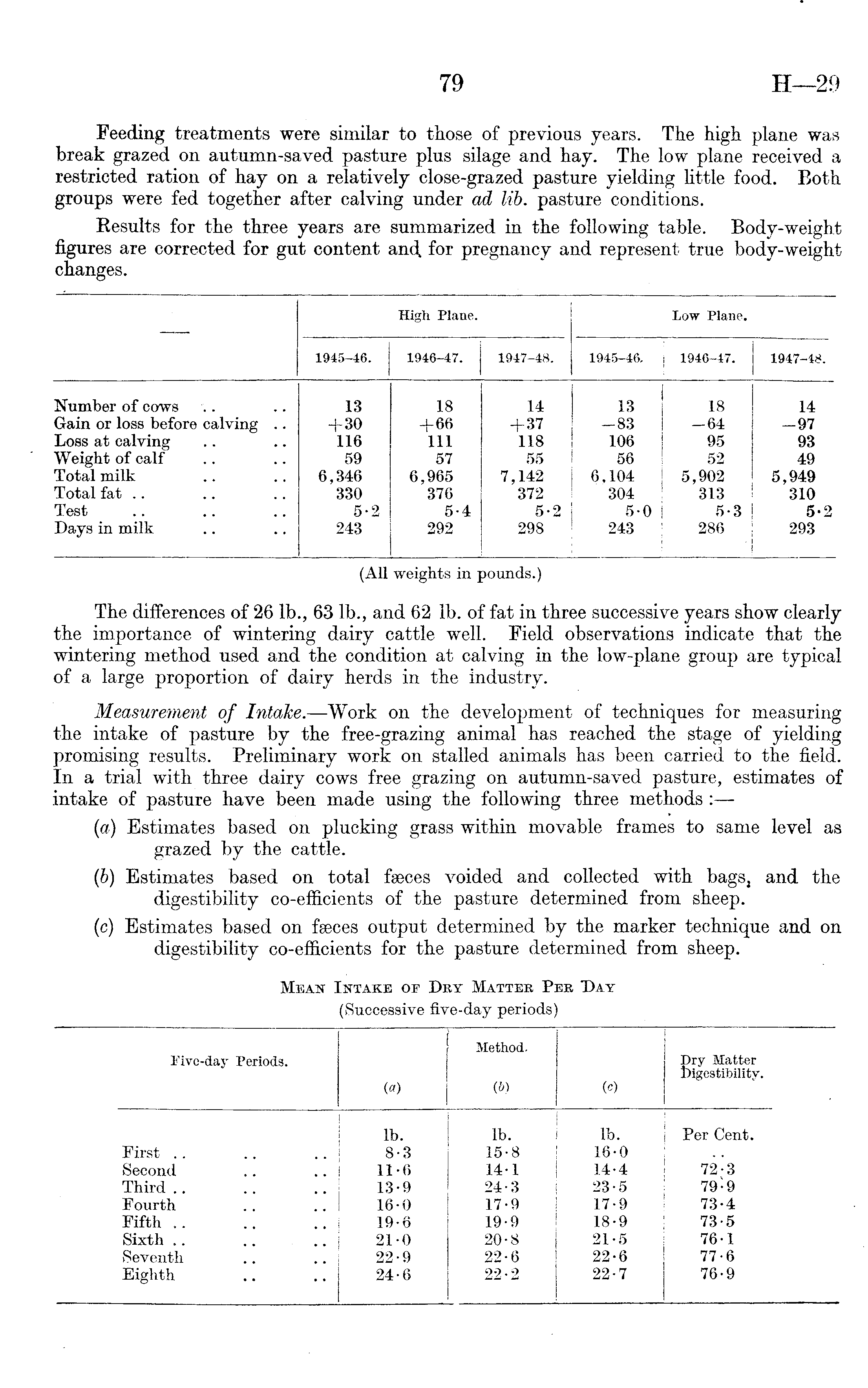 Feeding treatments were similar to those of previous years. The high plane was break grazed on autumn-saved pasture plus silage and hay. The low plane received a restricted ration of hay on a relatively close-grazed pasture yielding little food. Both groups were fed together after calving under ad lib. pasture conditions. Results for the three years are summarized in the following table. Body-weight figures are corrected for gut content and, for pregnancy and represent true body-weight changes.