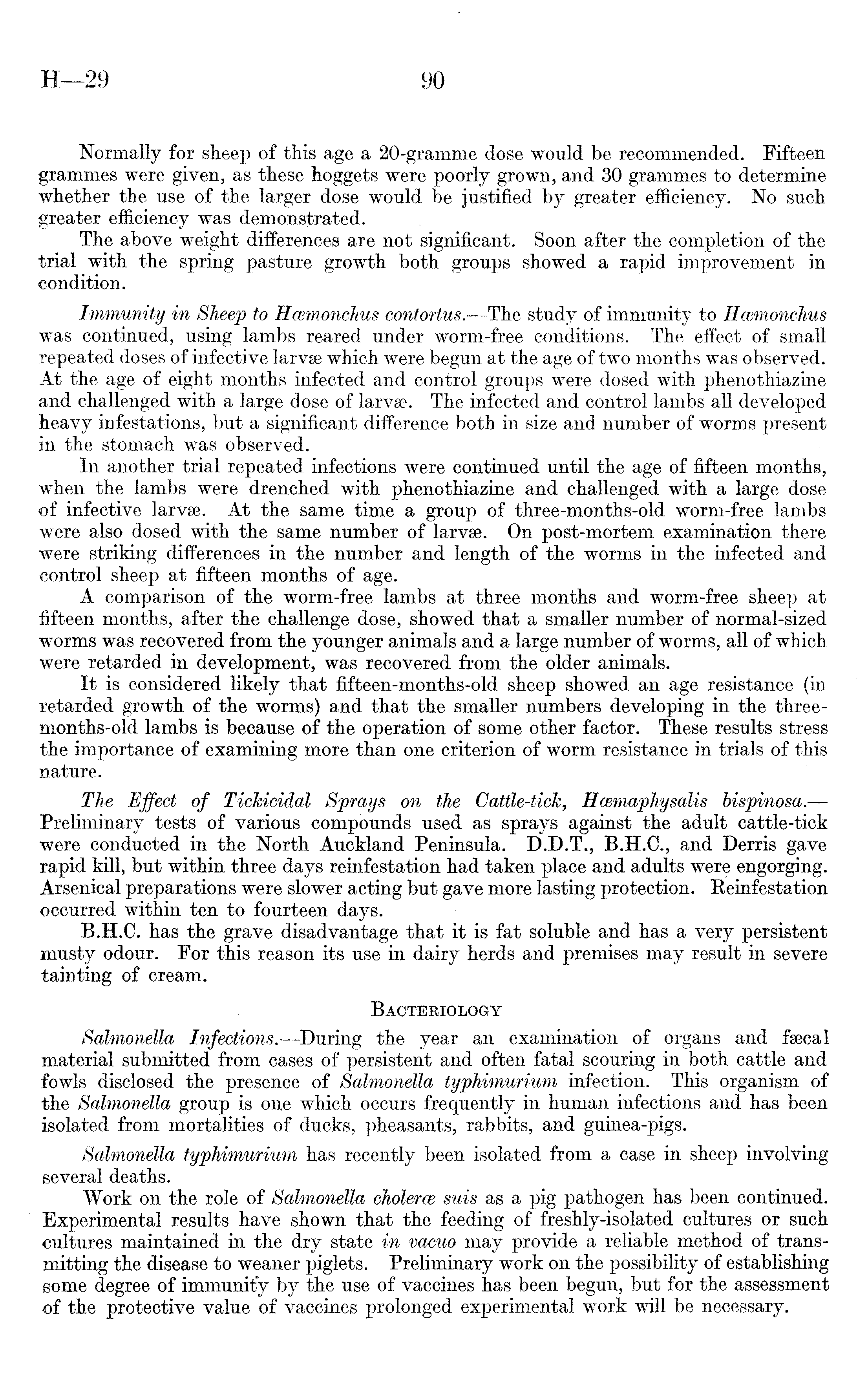 Normally for sheep of this age a 20-gramme dose would be recommended. Fifteen grammes were given, as these hoggets were poorly grown, and 30 grammes to determine whether the use of the larger dose would be justified by greater efficiency. No such greater efficiency was demonstrated. The above weight differences are not significant. Soon after the completion of the trial with the spring pasture growth both groups showed a rapid improvement in condition. Immunity in Sheep to Hcemonchus contortus. —The study of immunity to Hcemonchus was continued, using lambs reared under worm-free conditions. The effect of small repeated doses of infective larvae which were begun at the age of two months was observed. At the age of eight months infected and control groups were dosed with phenothiazine and challenged with a large dose of larvae. The infected and control lambs all developed heavy infestations, but a significant difference both in size and number of worms present in the stomach was observed. In another trial repeated infections were continued until the age of fifteen months, when the lambs were drenched with phenothiazine and challenged with a large dose of infective larvae. At the same time a group of three-months-old worm-free lambs were also dosed with the same number of larvae. On post-mortem examination there were striking differences in the number and length of the worms in the infected and control sheep at fifteen months of age. A comparison of the worm-free lambs at three months and worm-free sheep at fifteen months, after the challenge dose, showed that a smaller number of normal-sized worms was recovered from the younger animals and a large number of worms, all of which were retarded in development, was recovered from the older animals. It is considered likely that fifteen-months-old sheep showed an age resistance (in retarded growth of the worms) and that the smaller numbers developing in the three-months-old lambs is because of the operation of some other factor. These results stress the importance of examining more than one criterion of worm resistance in trials of this nature. The Effect of TicJcicidal Sprays on the Cattle-tick, Hcemaphysalis bispinosa.— Preliminary tests of various compounds used as sprays against the adult cattle-tick were conducted in the North Auckland Peninsula. D.D.T., and Derris gave rapid kill, but within three days reinfestation had taken place and adults were engorging. Arsenical preparations were slower acting but gave more lasting protection. Reinfestation occurred within ten to fourteen days. B.H.C. has the grave disadvantage that it is fat soluble and has a very persistent musty odour. For this reason its use in dairy herds and premises may result in severe tainting of cream. Bacteriology Salmonella Infections. —During the year an examination of organs and faecal material submitted from cases of persistent and often fatal scouring in both cattle and fowls disclosed the presence of Salmonella typhimurium infection. This organism of the Salmonella group is one which occurs frequently in human infections and has been isolated from mortalities of ducks, pheasants, rabbits, and guinea-pigs. Salmonella typhimurium has recently been isolated from a case in sheep involving several deaths. Work on the role of Salmonella choleras suis as a pig pathogen has been continued. Experimental results have shown that the feeding of freshly-isolated cultures or such cultures maintained in the dry state in vacuo may provide a reliable method of transmitting the disease to weaner piglets. Preliminary work on the possibility of establishing some degree of immunity by the use of vaccines has been begun, but for the assessment of the protective value of vaccines prolonged experimental work will be necessary.