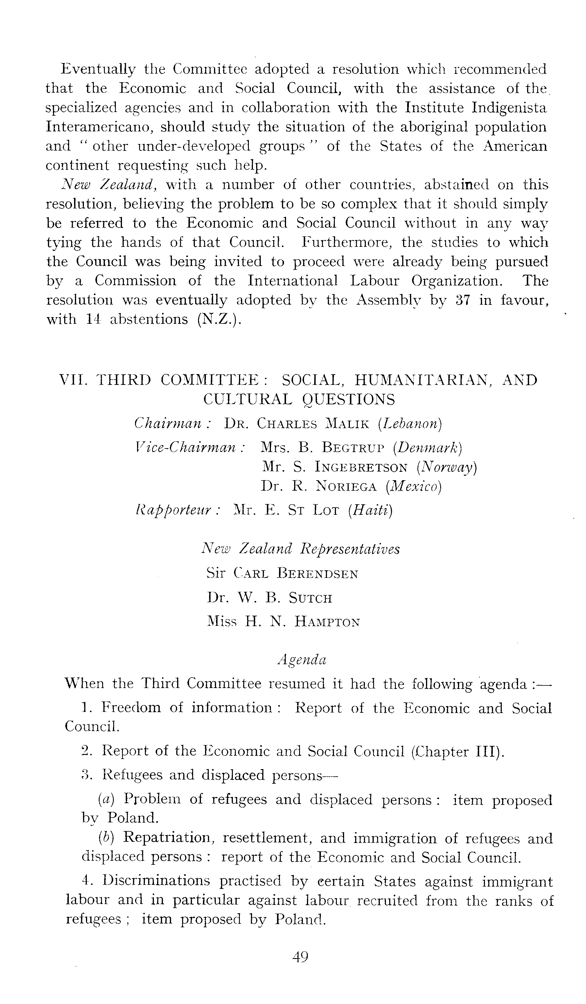 Eventually the Committee adopted a resolution which recommended that the Economic and Social Council, with the assistance of the. specialized agencies and in collaboration with the Institute Indigenista Interamericano, should study the situation of the aboriginal population and " other under-developed groups " of the States of the American continent requesting such help. New Zealand, with a number of other countries, abstained on this resolution, believing the problem to be so complex that it should simply be referred to the Economic and Social Council without in any way tying the hands of that Council. Furthermore, the studies to which the Council was being invited to proceed were already being pursued by a Commission of the International Labour Organization. The resolution was eventually adopted by the Assembly by 37 in favour, with 14 abstentions (N.Z.). VII. THIRD COMMITTEE : SOCIAL, HUMANITARIAN, AND CULTURAL QUESTIONS Chairman : Dr. Charles Malik (Lebanon) Vice-Chairman : Mrs. B. Begtrup (Denmark) Mr. S. Ingebretson (Norway) Dr.- R. Noriega (Mexico) Rapporteur: Mr. E. St Lot (Haiti) New Zealand Representatives Sir Carl Berendsen Dr. W. B. Sutch Miss H. N. Hampton Agenda When the Third Committee resumed it had the following agenda: — 1. Freedom of information : Report of the Economic and Social Council. 2. Report of the Economic and Social Council (Chapter III). 3. Refugees and displaced persons—(a) Problem of refugees and displaced persons : item proposed by Poland. (b) Repatriation, resettlement, and immigration of refugees and displaced persons : report of the Economic and Social Council. 4. Discriminations practised by certain States against immigrant labour and in particular against labour recruited from the ranks of refugees ; item proposed by Poland.