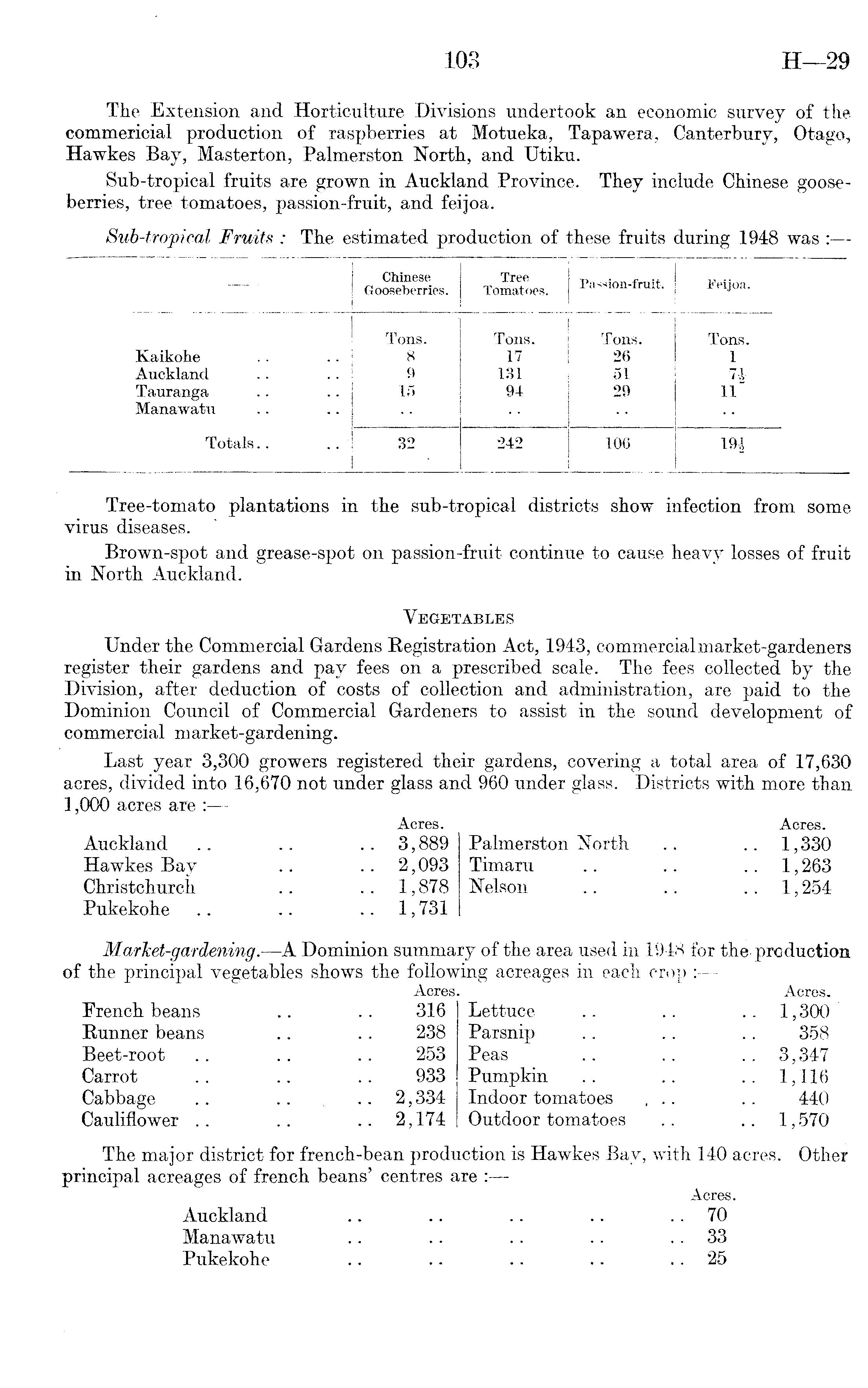 The Extension and Horticulture Divisions undertook an economic survey of the commericial production of raspberries at Motueka, Tapawera, Canterbury, Otago, Hawkes Bay, Masterton, Palmerston North, and Utiku. Sub-tropical fruits are grown in Auckland Province. They include Chinese gooseberries, tree tomatoes, passion-fruit, and feijoa. Sub-tropical Fruits : The estimated production of these fruits during 1948 was : —-