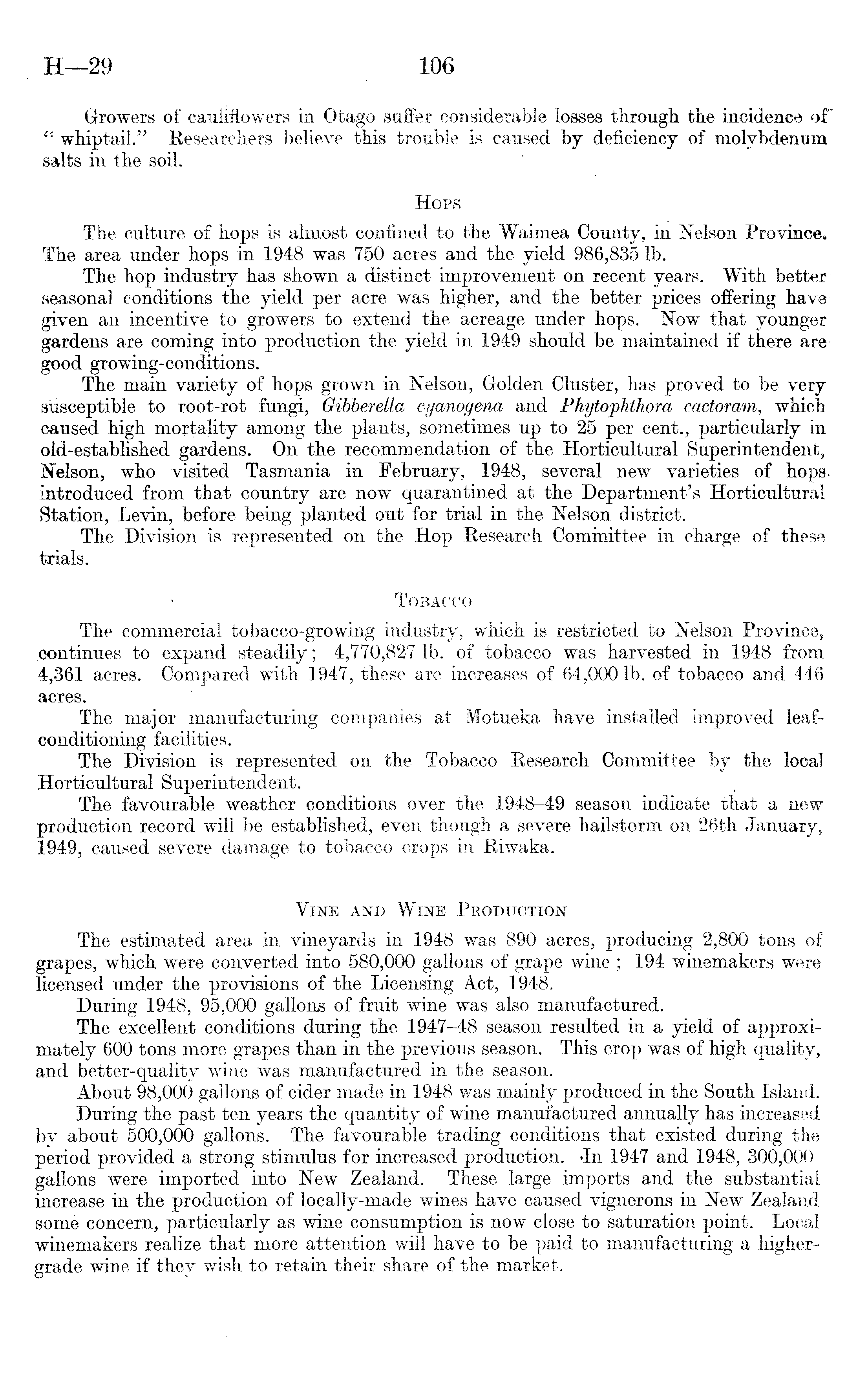 Growers of cauliflowers in Otago suffer considerable losses through the incidence of " whiptail." Researchers believe this trouble is caused by deficiency of molybdenum salts in the soil. Hops The culture of hops is almost confined to the Waimea County, in Nelson Province. The area under hops in 1948 was 750 acres and the yield 986,835 lb. The hop industry has shown a distinct improvement on recent years. With better seasonal conditions the yield per acre was higher, and the better prices offering have given an incentive to growers to extend the acreage under hops. Now that younger gardens are coming into production the yield in 1949 should be maintained if there are good growing-conditions. The main variety of hops grown in Nelson, Golden Cluster, has proved to be very susceptible to root-rot fungi, Gibberella cyanogena and Phytophthora cactoram, which caused high mortahty among the plants, sometimes up to 25 per cent., particularly in old-established gardens. On the recommendation of the Horticultural Superintendent, Nelson, who visited Tasmania in February, 1948, several new varieties of hopsintroduced from that country are now quarantined at the Department's Horticultural Station, Levin, before being planted out for trial in the Nelson district. The Division is represented on the Hop Research Committee in charge of these trials. Tobacco The commercial tobacco-growing industry, which is restricted to Nelson Province, continues to expand steadily; 4,770,827 lb. of tobacco was harvested in 1948 from 4,361 acres. Compared with 1947, these are increases of 64,000 lb. of tobacco and 446 acres. The major manufacturing companies at Motueka have installed improved leafconditioning facilities. The Division is represented on the Tobacco Research Committee by the local Horticultural Superintendent. The favourable weather conditions over the 1948-49 season indicate that a new production record will be established, even though a severe hailstorm on 26th January, 1949, caused severe damage to tobacco crops in Riwaka. Vine and Wine Production The estimated area in vineyards in 1948 was 890 acres, producing 2,800 tons of grapes, which were converted into 580,000 gallons of grape wine ; 194 winemakers were licensed under the provisions of the Licensing Act, 1948. During 1948, 95,000 gallons of fruit wine was also manufactured. The excellent conditions during the 1947-48 season resulted in a yield of approximately 600 tons more grapes than in the previous season. This crop was of high quality, and better-quality wine was manufactured in the season. About 98,000 gallons of cider made in 1948 was mainly produced in the South Island. During the past ten years the quantity of wine manufactured annually has increased by about 500,000 gallons. The favourable trading conditions that existed during the period provided a strong stimulus for increased production. -In 1947 and 1948, 300,000 gallons were imported into New Zealand. These large imports and the substantial increase in the production of locally-made wines have caused vignerons in New Zealand some concern, particularly as wine consumption is now close to saturation point. Local winemakers realize that more attention will have to be paid to manufacturing a highergrade wine if they wish to retain their share of the market.