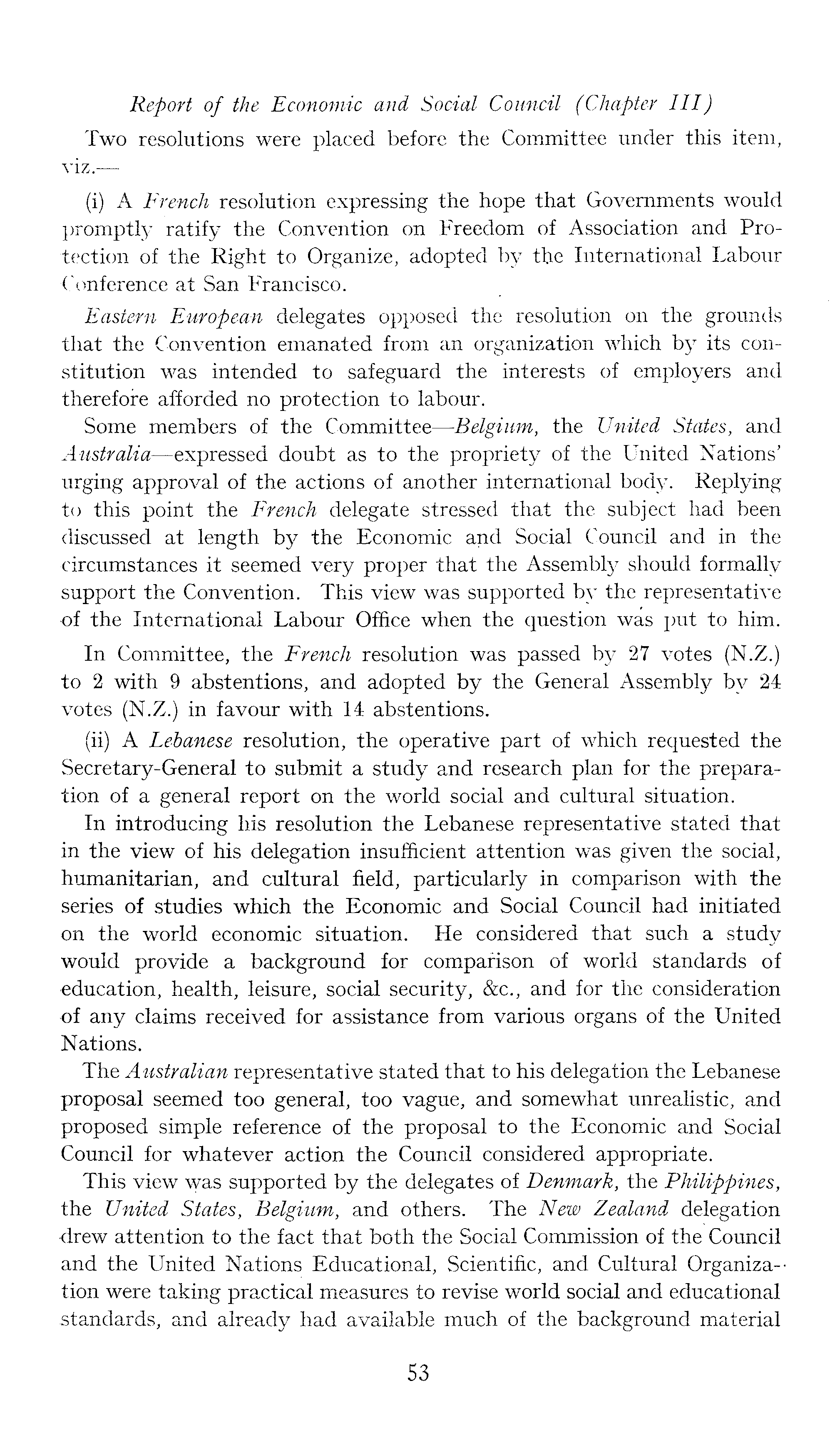 Report of the Economic and Social Council (Chapter III) Two resolutions were placed before the Committee under this item, viz.— (i) A French resolution expressing the hope that Governments would promptly ratify the Convention on Freedom of Association and Protection of the Right to Organize, adopted by the International Labour Conference at San Francisco. Eastern European delegates opposed the resolution on the grounds that the Convention emanated from an organization which by its constitution was intended to safeguard the interests of employers and therefore afforded no protection to labour. Some members of the Committee —Belgium, the United States, and Australia—expressed doubt as to the propriety of the United Nations' urging approval of the actions of another international body. Replying to this point the French delegate stressed that the subject had been discussed at length by the Economic and Social Council and in the circumstances it seemed very proper that the Assembly should formally support the Convention. This view was supported by the representative •of the International Labour Office when the question was put to him. In Committee, the French resolution was passed by 27 votes (N.Z.) to 2 with 9 abstentions, and adopted by the General Assembly by 24 votes (N.Z.) in favour with 14 abstentions. (ii) A Lebanese resolution, the operative part of which requested the Secretary-General to submit a study and research plan for the preparation of a general report on the world social and cultural situation. In introducing his resolution the Lebanese representative stated that in the view of his delegation insufficient attention was given the social, humanitarian, and cultural field, particularly in comparison with the series of studies which the Economic and Social Council had initiated on the world economic situation. He considered that such a study would provide a background for comparison of world standards of education, health, leisure, social security, &c., and for the consideration of any claims received for assistance from various organs of the United Nations. The Australian representative stated that to his delegation the Lebanese proposal seemed too general, too vague, and somewhat unrealistic, and proposed simple reference of the proposal to the Economic and Social v Council for whatever action the Council considered appropriate. This view was supported by the delegates of Denmark, the Philippines, the United States, Belgium, and others. The New Zealand delegation drew attention to the fact that both the Social Commission of the Council and the United Nations Educational, Scientific, and Cultural Organization were taking practical measures to revise world social and educational standards, and already had available much of the background material