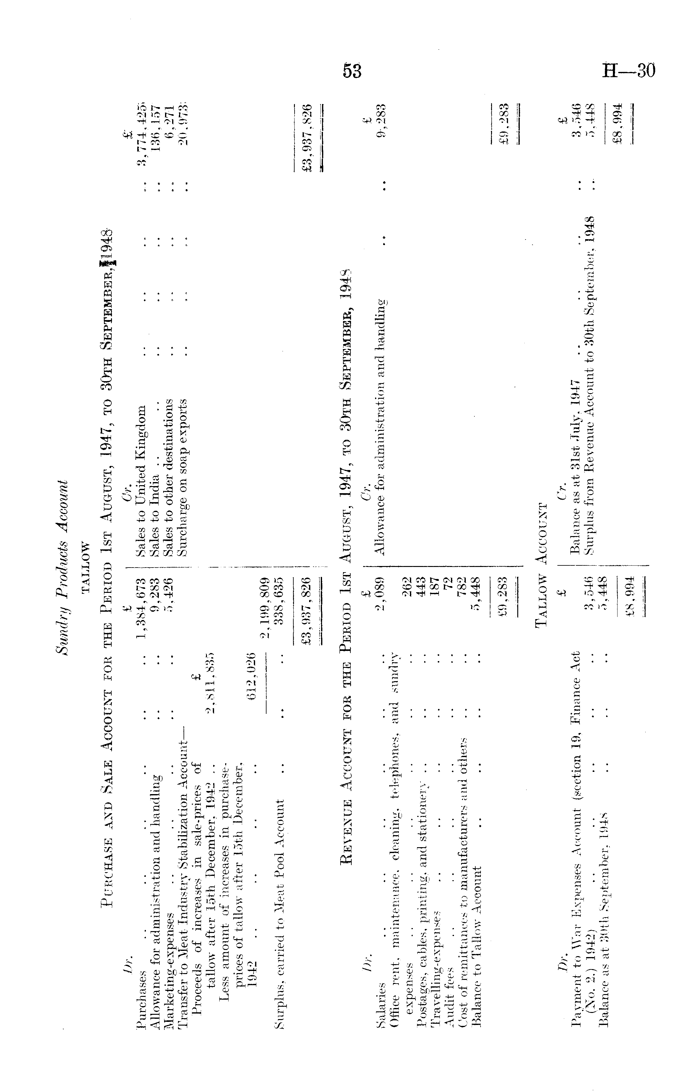 Sundry Products Account TALLOW Purchase and Sale Account for the Period Ist August, 1947, to 30th September, |1948 Dr. £ Or. £; Purchases .. .. .. .. .. .. 1,384,673 Sales to United Kingdom .. .. .. ... 3,774,425; Allowance for administration and handling .. .. 9,283 Sales to India .. .. .. .. .. .. 136,157 Marketing-expenses .. .. .. .. .. 6,426 Sales to other destinations .. .. .. .. 6,271 Transfer to Meat Industry Stabilization Account— Surcharge on soap exports .. .. .. .. 20,97:3; Proceeds of increases in sale-prices of £ tallow after 15th December, 1942 .. 2,811,835 Less amount of increases in purchaseprices of tallow after 15th December, 1942 .. .. 612,026 2,199,809 Surplus, carried to Meat Pool Account .. .. .. 338,635 £3,937,826 £3,937,826 Revenue Account for the Period Ist August, 1947, to 30th September, 1948 Dr. £ Gr. £ Salaries .. .. .. .. .. .. 2,089 Allowance for administration and handling .. .. 9-,283 Office rent, maintenance, cleaning, telephones, and sundry expenses .. .. .. .. .. .. 262 Postages, cables, printing, and stationery .. .. .. 443 Travelling-expenses .. .. .. .. .. 187 Audit fees .. .. .. .. .. .. 72 Cost of remittances to manufacturers and others .. .. 782 Balance to Tallow Account .. .. .. .. 5,448 £9,283 £9,283 Tallow Account Dr. & Gr. £ Payment to War Expenses Account (section 19, Finance Act Balance as at 31st July, 1947 .. .. .. ... 3,546 (No. 2.) 1942) .. .. .. .. .. 3,546 Surplus from Revenue Account to 30th September, 1948 ... 5,448 Balance as at 30th September, 1948 .. .. .. 5,448 £8,994 £8,994 =====