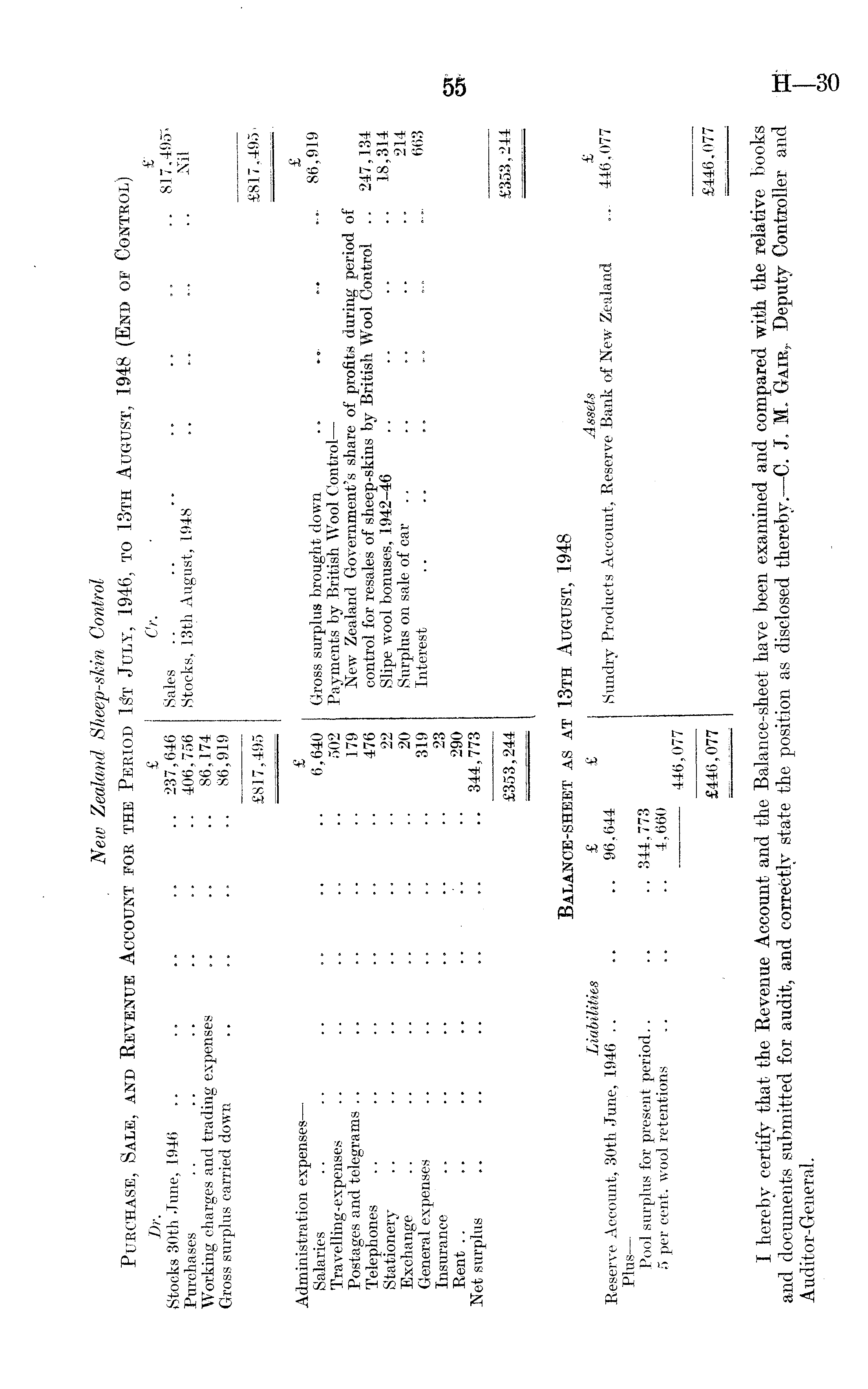 Neiv Zealand Sheep-shin Control Purchase, Sale, and Revenue Account for the Period I£t July, 1946, to 13th August, 1948 (End of Control) Dr. £ Stocks 30th June, 1946 .. .. 237,646 Sales .. .. .. •• 81^.f 95; Purchases .. .. .. .. •• •• 406,756 Stocks, 13th August, 1948 .. ... ... . Working charges and trading expenses .. .. .. 86,174 Gross surplus carried down .. .. .. .. 86,919 £817,495 £817,495. Administration expenses—- £ / Salaries .. .. .. .. .. •• 6,640 Gross surplus brought down .. ... ... —• Bb,yiy Travelling-expenses .. .. • • • • • • 502 Payments by British Wool Control— Postages and telegrams .. .. .. .. • • 179 New Zealand Government's share of profits during period of Telephones .. .. .. .. .. • • 476 control for resales of sheep-skins by British Wool Control .. 247, 134 Stationery .. .. .. .. . • • • 22 Slipe wool bonuses, 1942-46 .. .. • • • ■ 18, 314 Exchange .. .. .. .. • • • • 20 Surplus on sale of car .. .. .. . • • • 214 General expenses .. .. .. .. •• 319 Interest .. .. ... . . 663 Insurance .. .. .. • • • • • • 23 Rent .. .. .. .. .. .. .. 290 Net surplus .. .. .. .. ... •• 344,773 £353,244 £353,244 Balance-sheet as at 13th August, 1948 Liabilities £ £ Assets £ Reserve Account, 30th June, 1946 .. .. .. 96,644 Sundry Products Account, Reserve Bank of New Zealand .... 446,077 Plus— Pool surplus for present period.. .. .. 344,773 5 per cent, wool retentions .. .. .. 4,660 446,077 £446,077 £446,077 I hereby certify that the Revenue Account and the Balance-sheet have been examined and compared with the relative books and documents submitted for audit, and correctly state the position as disclosed thereby.— C. J. M. GpAir, Deputy Controller and Auditor-General.