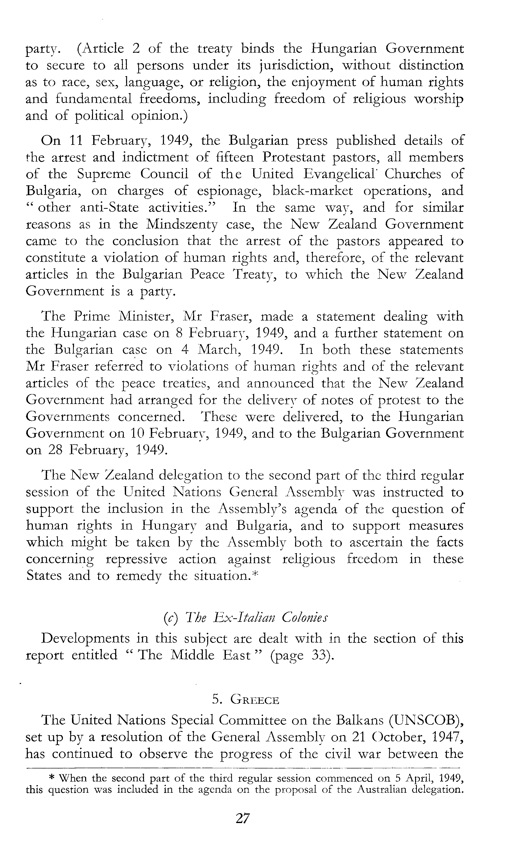 party. (Article 2 of the treaty binds the Hungarian Government to secure to all persons under its jurisdiction, without distinction as to race, sex, language, or religion, the enjoyment of human rights and fundamental freedoms, including freedom of religious worship and of political opinion.) On 11 February, 1949, the Bulgarian press published details of the arrest and indictment of fifteen Protestant pastors, all members of the Supreme Council of the United Evangelical' Churches of Bulgaria, on charges of espionage, black-market operations, and " other anti-State activities." In the same way, and for similar reasons as in the Mindszenty case, the New Zealand Government came to the conclusion that the arrest of the pastors appeared to constitute a violation of human rights and, therefore, of the relevant articles in the Bulgarian Peace Treaty, to which the New Zealand Government is a party. The Prime Minister, Mr Fraser, made a statement dealing with the Hungarian case on 8 February, 1949, and a further statement on the Bulgarian case on 4 March, 1949. In both these statements Mr Fraser referred to violations of human rights and of the relevant articles of the peace treaties, and announced that the New Zealand Government had arranged for the delivery of notes of protest to the Governments concerned. These were delivered, to the Hungarian Government on 10 February, 1949, and to the Bulgarian Government on 28 February, 1949. The New Zealand delegation to the second part of the third regular session of the United Nations General Assembly was instructed to support the inclusion in the Assembly's agenda of the question of human rights in Hungary and Bulgaria, and to support measures which might be taken by the Assembly both to ascertain the facts concerning repressive action against religious freedom in these States and to remedy the situation.* (c) The Ex-Italian Colonies Developments in this subject are dealt with in the section of this report entitled " The Middle East" (page 33). 5. Greece The United Nations Special Committee on the Balkans (UNSCOB), set up by a resolution of the General Assembly on 21 October, 1947, has continued to observe the progress of the civil war between the