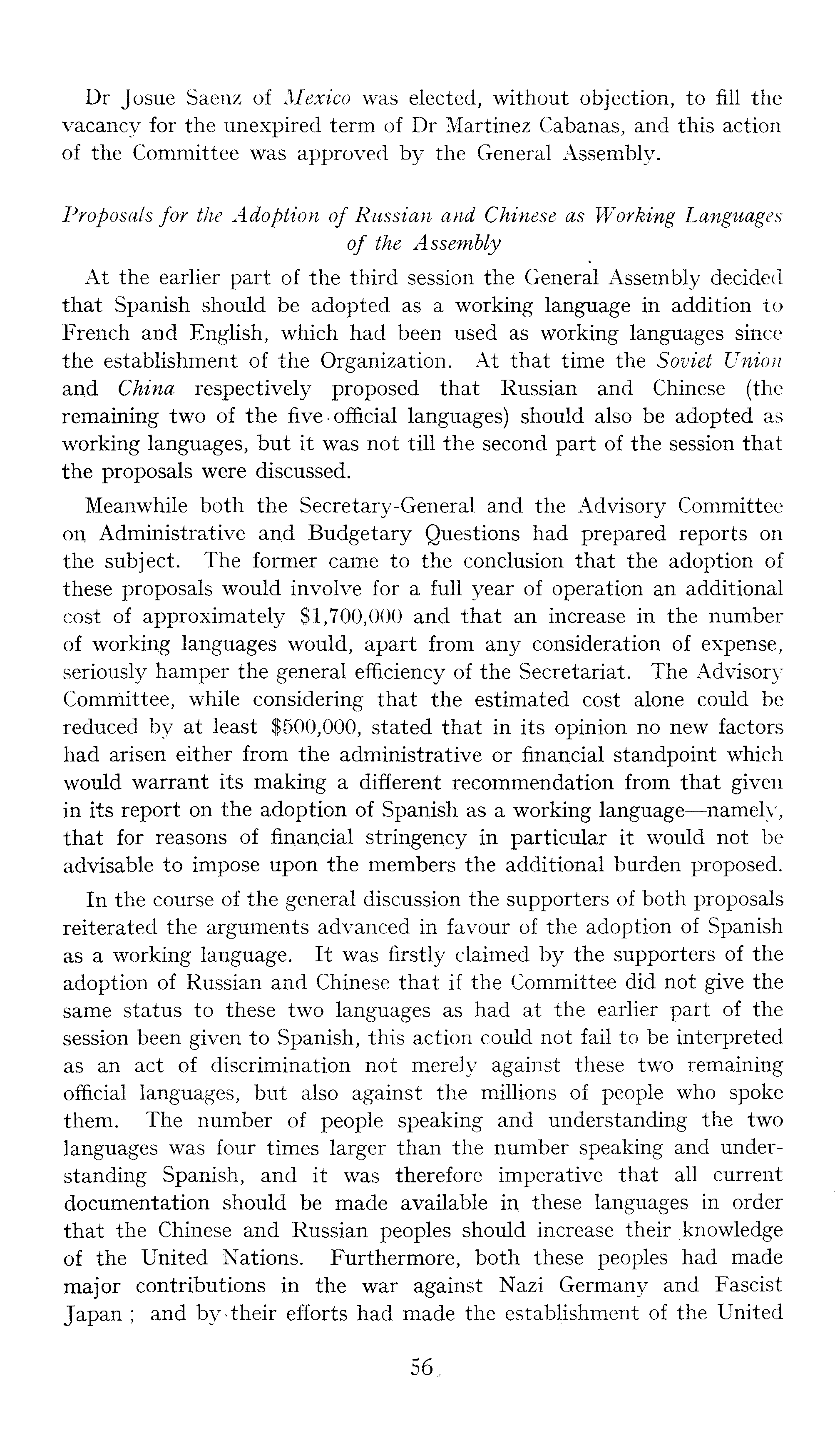 Dr Josue Saenz of Mexico was elected, without objection, to fill the vacancy for the unexpired term of Dr Martinez Cabanas, and this action of the Committee was approved by the General Assembly. Proposals for the Adoption of Russian and Chinese as Working Languages of the Assembly At the earlier part of the third session the General Assembly decided that Spanish should be adopted as a working language in addition to French and English, which had been used as working languages since the establishment of the Organization. At that time the Soviet Union and China respectively proposed that Russian and Chinese (the remaining two of the five official languages) should also be adopted as working languages, but it was not till the second part of the session that the proposals were discussed. Meanwhile both the Secretary-General and the Advisory Committee on Administrative and Budgetary Questions had prepared reports on the subject. The former came to the conclusion that the adoption of these proposals would involve for a full year of operation an additional cost of approximately $1,700,000 and that an increase in the number of working languages would, apart from any consideration of expense, seriously hamper the general efficiency of the Secretariat. The Advisory Committee, while considering that the estimated cost alone could be reduced by at least $500,000, stated that in its opinion no new factors had arisen either from the administrative or financial standpoint which would warrant its making a different recommendation from that given in its report on the adoption of Spanish as a working language —namely, that for reasons of financial stringency in particular it would not be advisable to impose upon the members the additional burden proposed. In the course of the general discussion the supporters of both proposals reiterated the arguments advanced in favour of the adoption of Spanish as a working language. It was firstly claimed by the supporters of the adoption of Russian and Chinese that if the Committee did not give the same status to these two languages as had at the earlier part of the session been given to Spanish, this action could not fail to be interpreted as an act of discrimination not merely against these two remaining official languages, but also against the millions of people who spoke them. The number of people speaking and understanding the two languages was four times larger than the number speaking and understanding Spanish, and it was therefore imperative that all current documentation should be made available in these languages in order that the Chinese and Russian peoples should increase their knowledge of the United Nations. Furthermore, both these peoples had made major contributions in the war against Nazi Germany and Fascist Japan ; and by-their efforts had made the establishment of the United