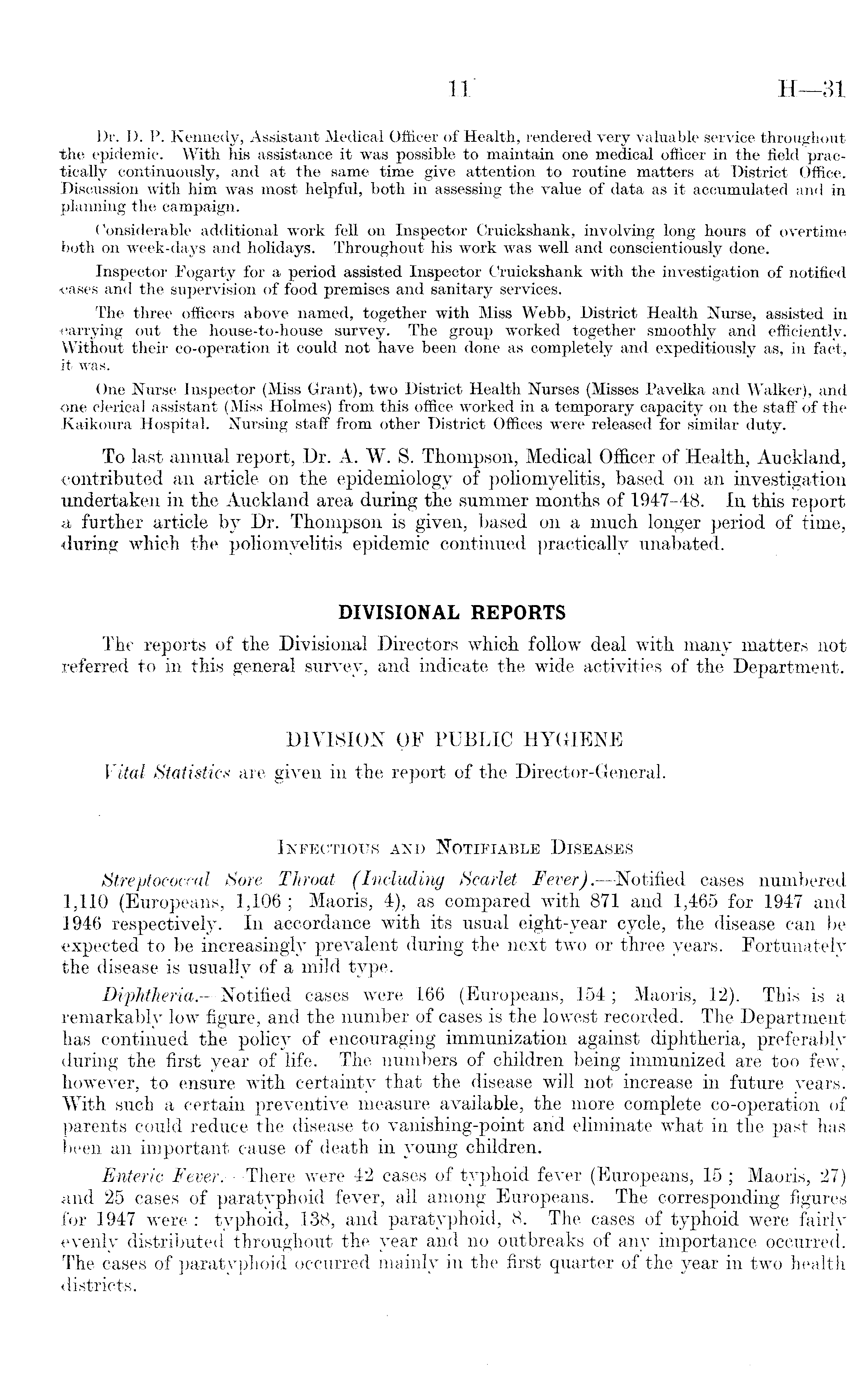 Dr. D. P. Kennedy, Assistant Medical Officer of Health, rendered very valuable service throughout the epidemic. With his assistance it was possible to maintain one medical officer in the field practically continuously, and at the same time give attention to routine matters at District Office. Discussion with him was most helpful, both in assessing the value of data as it accumulated and in planning the campaign. Considerable additional work fell on Inspector Cruickshank, involving long hours of overtime both on week-days and holidays. Throughout his work was well and conscientiously done. Inspector Fogarty for a period assisted Inspector Cruickshank with the investigation of notified oases and the supervision of food premises and sanitary services. The three officers above named, together with Miss Webb, District Health Nurse, assisted in carrying out the house-to-house survey. The group worked together smoothly and efficiently. Without their co-operation it could not have been done as completely and expeditiously as, in fact, it was. One Nurse Inspector (Miss Grant), two District Health Nurses (Misses Pavelka and Walker), and one clerical assistant (Miss Holmes) from this office worked in a temporary capacity on the staff of the Kaikoura Hospital. Nursing staff from other District Offices were released for similar duty. To last annual report, Dr. A. W. S. Thompson, Medical Officer of Health, Auckland, contributed an article on the epidemiology of poliomyelitis, based on an investigation undertaken in the Auckland area during the summer months of 1947-48. In this report a further article by Dr. Thompson is given, based on a much longer period of time, during which the poliomyelitis epidemic continued practically unabated. DIVISIONAL REPORTS The reports of the Divisional Directors which follow deal with many matters not referred to in this general survey, and indicate the wide activities of the Department. DIVISION OF PUBLIC HYGIENE Vital Statistics are given in the report of the Director-General. Infectious and Notifiable Diseases Streptococcal Sore Throat (bicluding Scarlet Fever). —Notified cases numbered 1,110 (Europeans, 1,106 ; Maoris, 4), as compared with 871 and 1,465 for 1947 and 1946 respectively. In accordance with its usual eight-year cycle, the disease can be expected to be increasingly prevalent during the next two or three years. Fortunately the disease is usually of a mild type. Diphtheria.—Notified cases were 166 (Europeans, 154; Maoris, 12). This is a remarkably low figure, and the number of cases is the lowest recorded. The Department has continued the policy of encouraging immunization against diphtheria, preferably during the first year of life. The numbers of children being immunized are too few, however, to ensure with certainty that the disease will not increase in future years. With such a certain preventive measure available, the more complete co-operation of parents could reduce the disease to vanishing-point and eliminate what in the past has been an important cause of death in young children. Enteric Fever.—There were 42 cases of typhoid fever (Europeans, 15 ; Maoris, 27) and 25 cases of paratyphoid fever, all among Europeans. The corresponding figures for 1947 were : typhoid, 138, and paratyphoid, 8. The cases of typhoid were fairly evenly distributed throughout the year and no outbreaks of any importance occurred. The cases of paratyphoid occurred mainly in the first quarter of the year in two health districts.