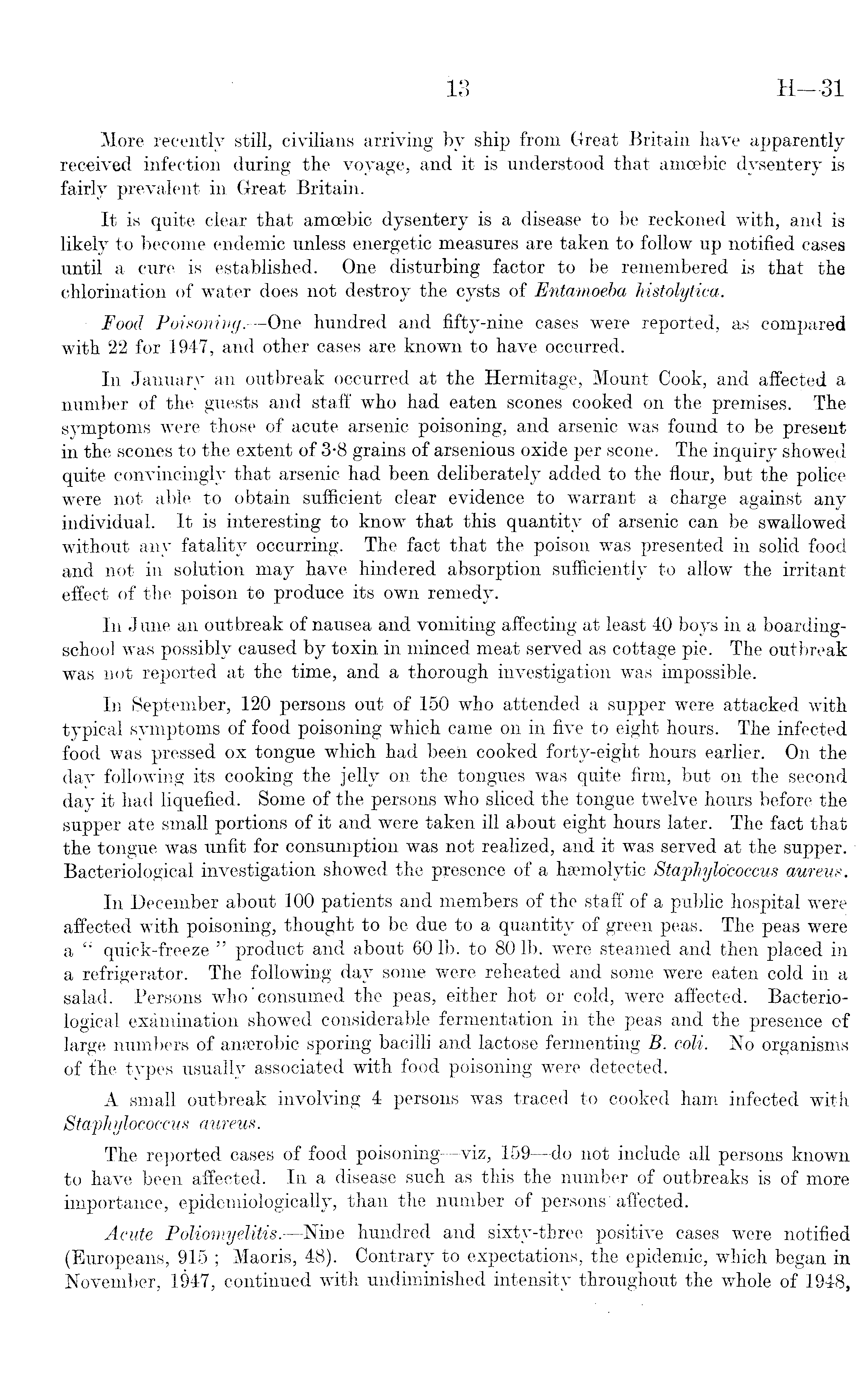 More recently still, civilians arriving by ship from Great Britain have apparently received infection during the voyage, and it is understood that amoebic dysentery is fairly prevalent in Great Britain. It is quite clear that amoebic dysentery is a disease to be reckoned with, and is likely to become endemic unless energetic measures are taken to follow up notified cases until a cure is established. One disturbing factor to be remembered is that the chlorination of water does not destroy the cysts of Entamoeba histolytica. Food Poisoning.—One hundred and fifty-nine cases were reported, as compared with 22 for 1947, and other cases are known to have occurred. In January an outbreak occurred at the Hermitage, Mount Cook, and affected a number of the guests and staff who had eaten scones cooked on the premises. The symptoms were those of acute arsenic poisoning, and arsenic was found to be present in the scones to the extent of 3-8 grains of arsenious oxide per scone. The inquiry showed quite convincingly that arsenic had been deliberately added to the flour, but the police were not able to obtain sufficient clear evidence to warrant a charge against any individual. It is interesting to know that this quantity of arsenic can be swallowed without any fatality occurring. The fact that the poison was presented in solid food and not in solution may have hindered absorption sufficiently to allow the irritant effect of the poison to produce its own remedy. In June an outbreak of nausea and vomiting affecting at least 40 boys in a boardingschool was possibly caused by toxin in minced meat served as cottage pie. The outbreak was not reported at the time, and a thorough investigation was impossible. In September, 120 persons out of 150 who attended a supper were attacked with typical symptoms of food poisoning which came on in five to eight hours. The infected food was pressed ox tongue which had been cooked forty-eight hours earlier. On the day following its cooking the jelly on the tongues was quite firm, but on the second day it had liquefied. Some of the persons who sliced the tongue twelve hours before the supper ate small portions of it and were taken ill about eight hours later. The fact that the tongue was unfit for consumption was not realized, and it was served at the supper. Bacteriological investigation showed the presence of a hsemolytic Staphylococcus aureus. In December about 100 patients and members of the staff of a public hospital were affected with poisoning, thought to be due to a quantity of green peas. The peas were a " quick-freeze " product and about 60 lb, to 80 lb. were steamed and then placed in a refrigerator. The following day some were reheated and some were eaten cold in a salad. Persons who'consumed the peas, either hot or cold, were affected. Bacteriological examination showed considerable fermentation in the peas and the presence of large numbers of anaerobic sporing bacilli and lactose fermenting B. coli. No organisms of the types usually associated with food poisoning were detected. A small outbreak involving 4 persons was traced to cooked ham infected with Staphylococcus aureus. The reported cases of food poisoning—viz, 159—d0 not include all persons known to have been affected. In a disease such as this the number of outbreaks is of more importance, epidemiologically, than the number of persons affected. Acute Poliomyelitis. —Nine hundred and- sixty-three positive cases were notified (Europeans, 915 ; Maoris, 48). Contrary to expectations, the epidemic, which began in November, 1947, continued with undiminished intensity throughout the whole of 1948,