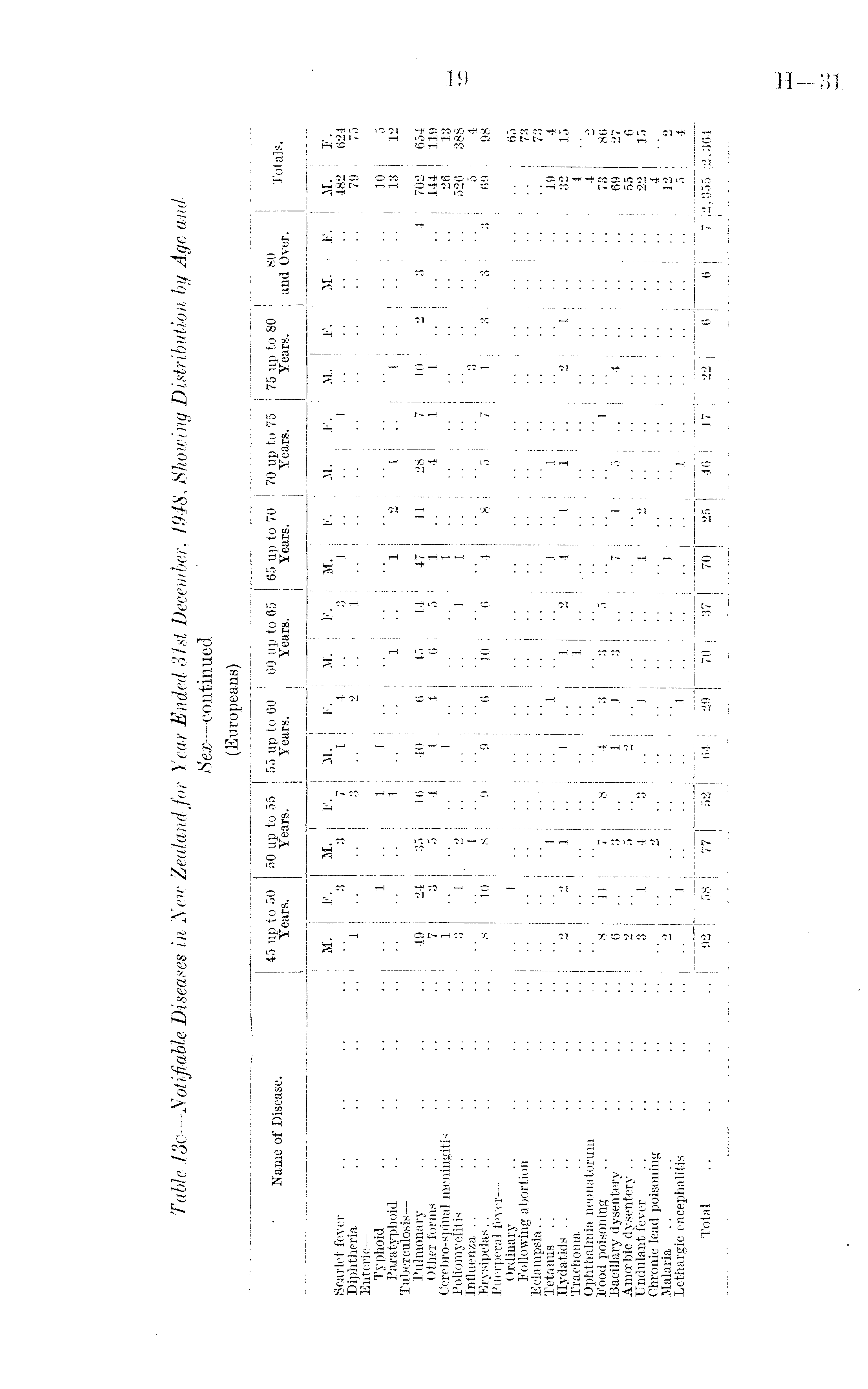 (Europeans) Name of Disease. 45 up to 50 Years. 50 up to 55 Years. 55 up to 60 Years. 60 up to 65 Years, 65 up to 70 Years. I 70 up to 75 j Years. 75 up to 80 Years. 80 and Over. Totals. Scarlet fever Diphtheria Enteric — Typhoid Paratyphoid Tuberculosis — Pulmonary Other forms Cerebro-spinal meningitis Poliomyelitis Influenza Erysipelas Puerperal fever — Ordinary .. .. .. Following abortion Eclampsia.. .. .. .. Tetanus Hydatids Trachoma Ophthalmia neonatorum Food poisoning Bacillary dysentery Amoebic dysentery TIndulant fever Chronic lead poisoning Malaria Lethargic encephalitis M. ' 1 49 7 1 3 " 8 ' '8 6 2 3 F. 3 1 24 3 ' 'l 10 1 11 ' 1 ' 1 M. 3 35 5 2 1 8 "l 1 ' '7 3 5 4 l>CO rHiH O-H OS 00 CO ... .. ... M. 1 1 40 4 1 ' 9 | ' 1 4 1 F. 4 2 6 4 6 ' 1 ' 3 1 ' 1 ' 1 M. ' 1 45 6 io ' 1 1 3 3 F. 3 1 14 5 1 6 " 5 M. 1 ' 1 47 1 1 1 4 1 4 7 1 1 F. 2 11 ' '8 ' 1 "l M. ' 1 28 4 ' 1 1 5 "1 F. 1 7 1 7 1 i 3VL ' 1 10 1 1 ' '2 4 F. ' 3 i ' 1 M. 3 3 F. 4 M. 482 79 10 13 702 144 26 526 5 69 i9 32 4 4 73 69 55 22 4 12 5 F. 624 75 5 12 654 119 13 388 4 98 65 73 73 4 15 86 27 6 15 0 4 Total 92 58 77 52 64 J 29 70 37 70 25 4(5 IT 22 6 6 7 2,355 2,364