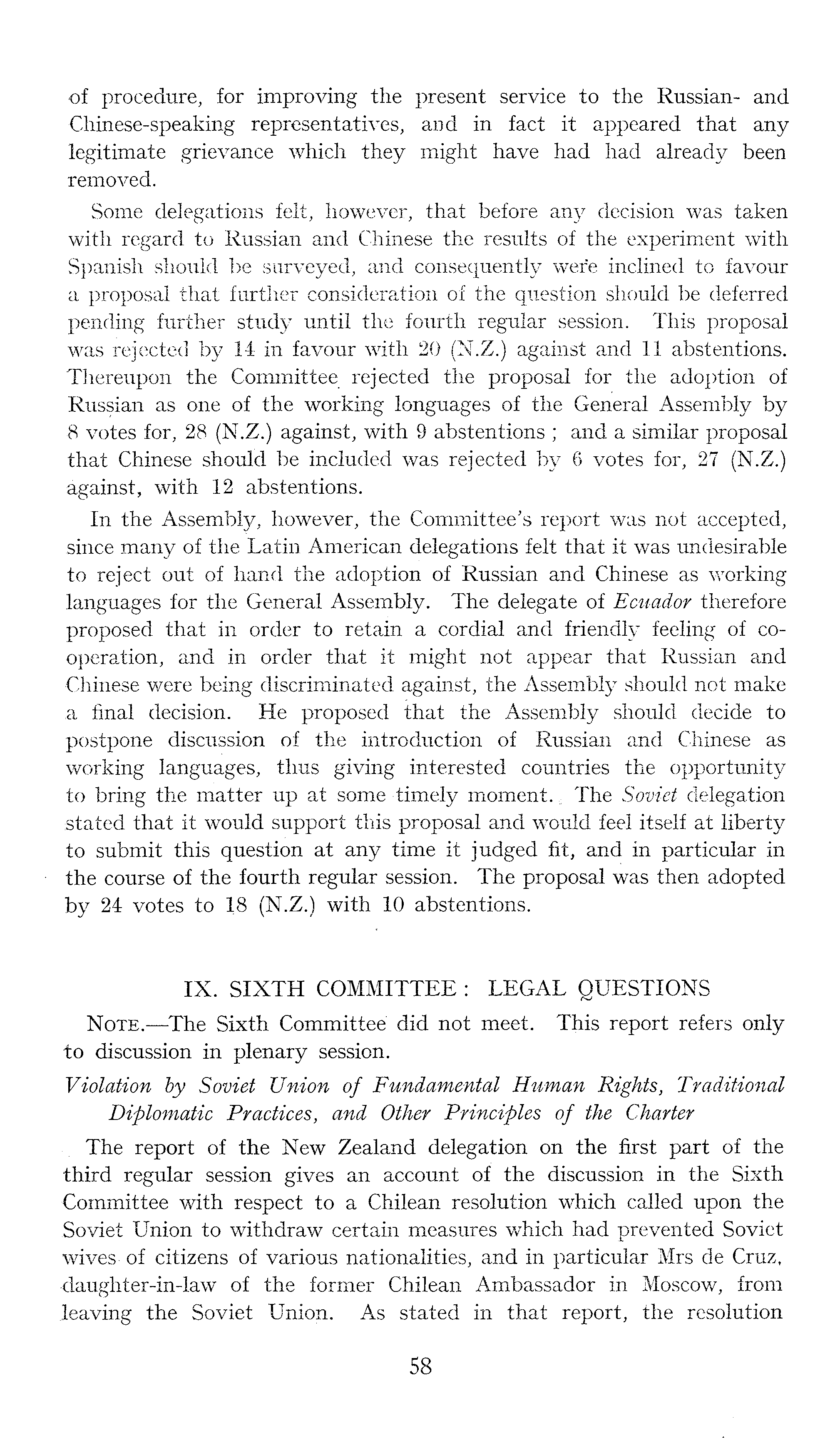 of procedure, for improving the present service to the Russian- and Chinese-speaking representatives, and in fact it appeared that any legitimate grievance which they might have had had already been removed. Some delegations felt, however, that before any decision was taken with regard to Russian and Chinese the results of the experiment with Spanish should be surveyed, and consequently were inclined to favour a proposal that further consideration of the question should be deferred pending further study until the fourth regular session. This proposal was rejected by 14 in favour with 20 (N.Z.) against and 11 abstentions. Thereupon the Committee rejected the proposal for the adoption of Russian as one of the working longuages of the General Assembly by ■8 votes for, 28 (N.Z.) against, with 9 abstentions ; and a similar proposal that Chinese should be included was rejected by 6 votes for, 27 (N.Z.) against, with 12 abstentions. In the Assembly, however, the Committee's report was not accepted, since many of the Latin American delegations felt that it was undesirable to reject out of hand the adoption of Russian and Chinese as working languages for the General Assembly. The delegate of Ecuador therefore proposed that in order to retain a cordial and friendly feeling of cooperation, and in order that it might not appear that Russian and Chinese were being discriminated against, the Assembly should not make a final decision. He proposed that the Assembly should decide to postpone discussion of the introduction of Russian and Chinese as working languages, thus giving interested countries the opportunity to bring the matter up at some timely moment.. The Soviet delegation stated that it would support this proposal and would feel itself at liberty to submit this question at any time it judged fit, and in particular in the course of the fourth regular session. The proposal was then adopted by 24 votes to 18 (N.Z.) with 10 abstentions. IX. SIXTH COMMITTEE : LEGAL QUESTIONS Note. —The Sixth Committee did not meet. This report refers only to discussion in plenary session. Violation by Soviet Union of Fundamental Human Rights, Traditional Diplomatic Practices, and Other Principles of the Charter x The report of the New Zealand delegation on the first part of the third regular session gives an account of the discussion in the Sixth Committee with respect to a Chilean resolution which called upon the Soviet Union to withdraw certain measures which had prevented Soviet wives of citizens of various nationalities, and in particular Mrs de Cruz, daughter-in-law of the former Chilean Ambassador in Moscow, from leaving the Soviet Union. As stated in that report, the resolution
