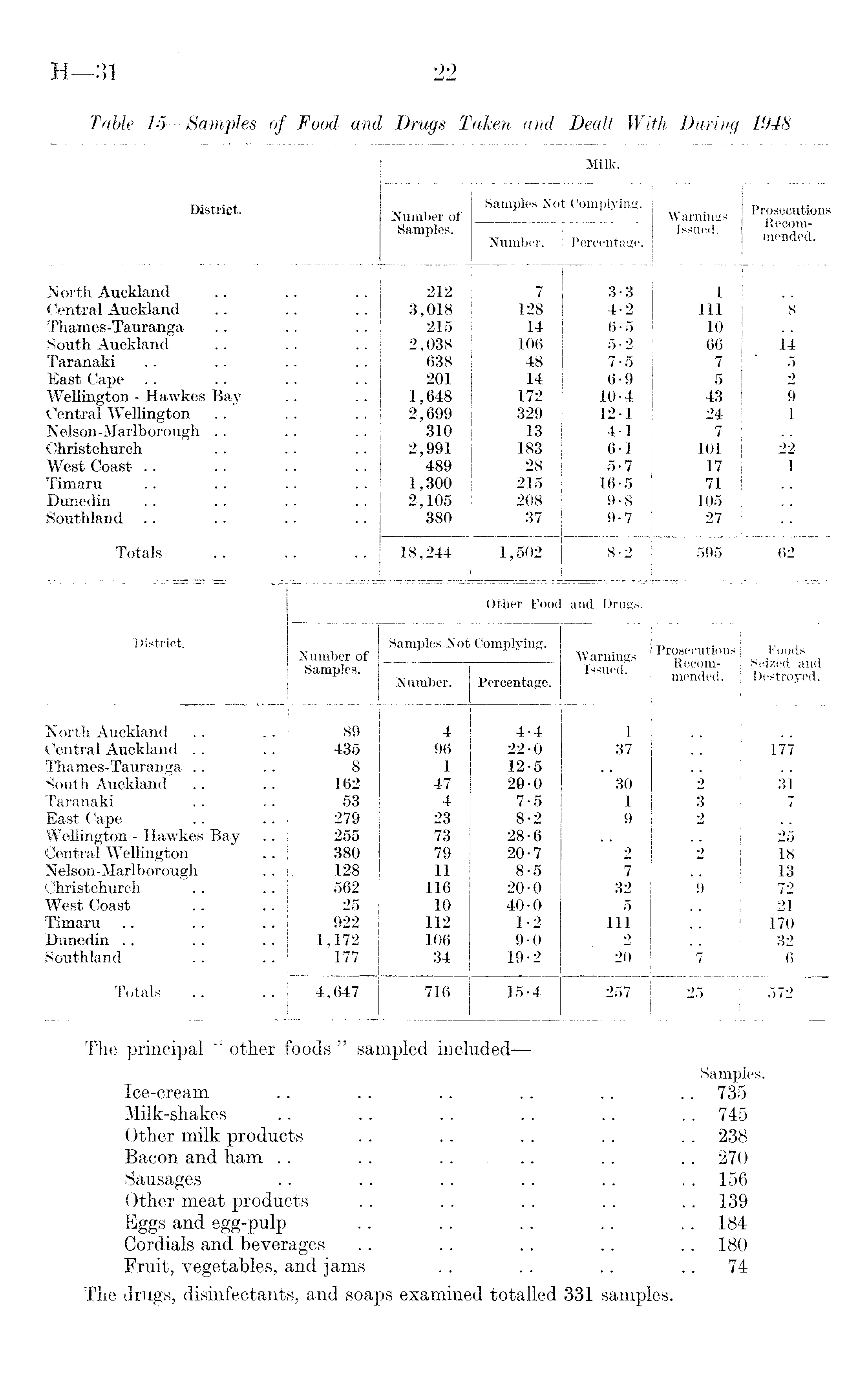 Table 15 —Samples of Food and Drugs Taken and Dealt With During 1948