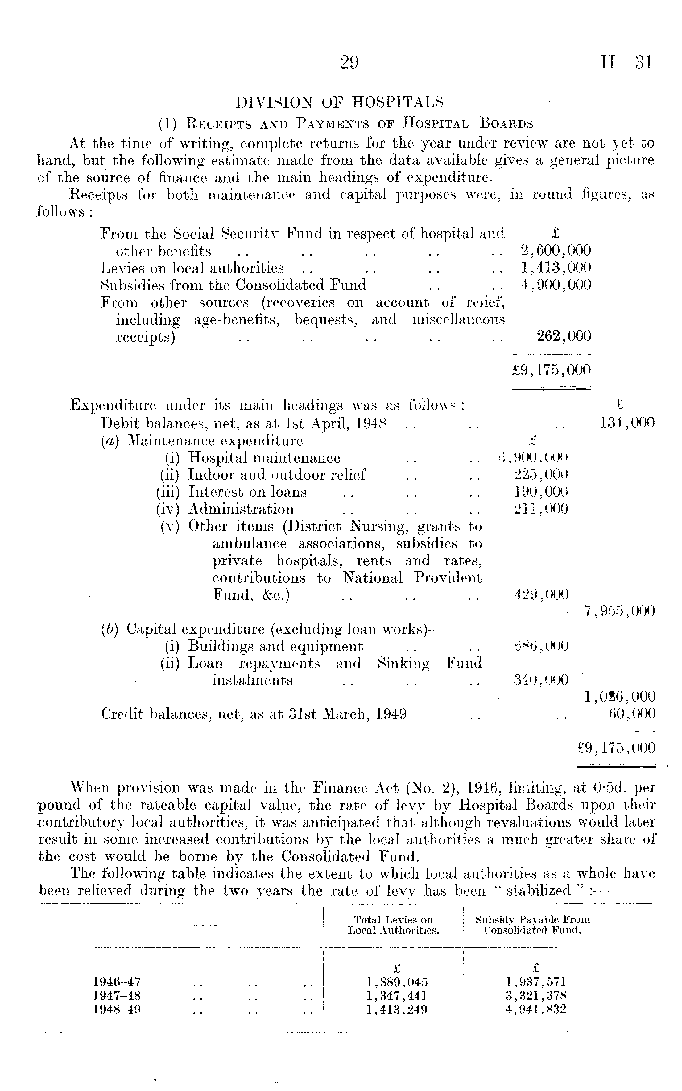 DIVISION OF HOSPITALS (1) Receipts and Payments op Hospital Boards At the time of writing, complete returns for the year under review are not yet to hand, but the following estimate made from the data available gives a general picture of the source of finance and the main headings of expenditure. Receipts for both maintenance and capital purposes were, in round figures, as follows : From the Social Security Fund in respect of hospital and £ other benefits .. .. .. .. .. 2,600,000 Levies on local authorities .. .. .. .. 1,413,000 Subsidies from the Consolidated Fund .. .. 4,900,000 From other sources (recoveries on account of relief, including age-benefits, bequests, and miscellaneous receipts) . . . . .. .. .. '262,000 £9,175,000 Expenditure under its main headings was as follows : £ Debit balances, net, as at Ist April, 1948 .. .. .. 134,000 (а) Maintenance expenditure — £ (i) Hospital maintenance .. .. 6,900,000 (ii) Indoor and outdoor relief .. .. 225,000 (iii) Interest on loans .. 190,000 (iv) Administration .. .. .. 211,000 (v) Other items (District Nursing, grants to ambulance associations, subsidies to private hospitals, rents and rates, contributions to National Provident Fund, &c.) .. .. .. 429,000 7,955,000 (б) Capital expenditure (excluding loan works) — (i) Buildings and equipment .. .. 686,000 (ii) Loan repayments and Sinking Fund instalments . . .. .. 340,000 1,0J6,000 Credit balances, net, as at 31st March, 1949 .. .. 60,000 £9,175,000 When provision was made in the Finance Act (No. 2), 1946, limiting, at o*sd. per pound of the rateable capital value, the rate of levy by Hospital Boards upon their contributory local authorities, it was anticipated that although revaluations would later result in some increased contributions by the local authorities a much greater share of the cost would be borne by the Consolidated Fund.