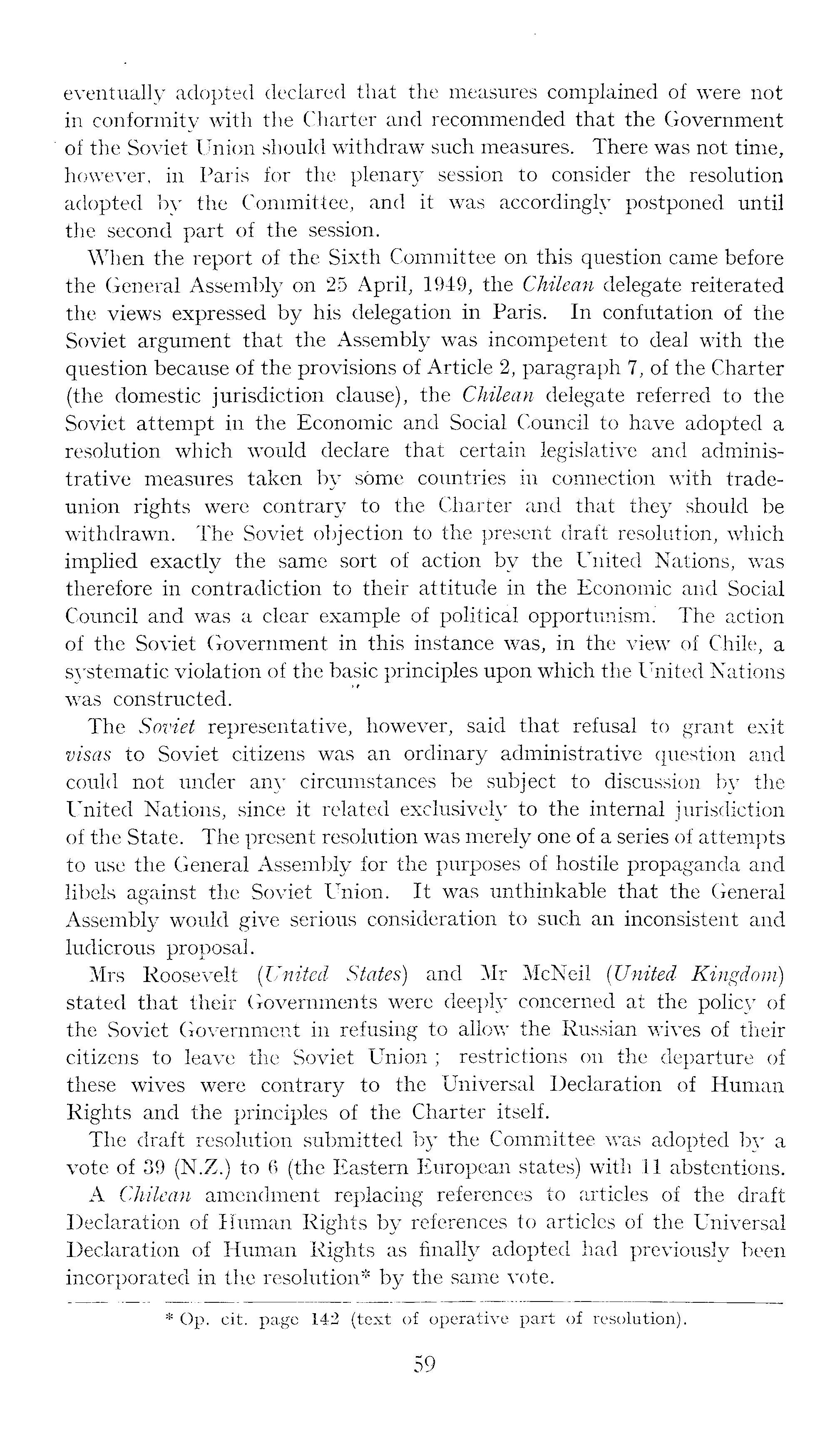 eventually adopted declared that the measures complained of were not in conformity with the Charter and recommended that the Government of the Soviet Union should withdraw such measures. There was not time, however, in Paris for the plenary session to consider the resolution adopted by the Committee, and it was accordingly postponed until the second part of the session. When the report of the Sixth Committee on this question came before the General Assembly on 25 April, 1949, the Chilean delegate reiterated the views expressed by his delegation in Paris. In confutation of the Soviet argument that the Assembly was incompetent to deal with the question because of the provisions of Article 2, paragraph 7, of the Charter (the domestic jurisdiction clause), the Chilean delegate referred to the Soviet attempt in the Economic and Social Council to have adopted a resolution which would declare that certain legislative and administrative measures taken by some countries in connection with tradeunion rights were contrary to the Charter and that they should be withdrawn. The Soviet objection to the present draft resolution, which implied exactly the same sort of action by the United Nations, was therefore in contradiction to their attitude in the Economic and Social Council and was a clear example of political opportunism. The action of the Soviet Government in this instance was, in the view of Chile, a systematic violation of the basic principles upon which the United Nations was constructed. The Soviet representative, however, said that refusal to grant exit visas to Soviet citizens was an ordinary administrative question and could not under any circumstances be subject to discussion by the United Nations, since it related exclusively to the internal jurisdiction of the State. The present resolution was merely one of a series of attempts to use the General Assembly for the purposes of hostile propaganda and libels against the Soviet Union. It was unthinkable that the General Assembly would give serious consideration to such an inconsistent and ludicrous proposal. Mrs Roosevelt (United States) and Mr McNeil (United Kingdom) stated that their Governments were deeply concerned at the policy of the Soviet Government in refusing to allow the Russian wives of their citizens to leave the Soviet Union ; restrictions on the departure of these wives were contrary to the Universal Declaration of Human Rights and the principles of the Charter itself. The draft resolution submitted by the Committee was adopted by a vote of 39 (N.Z.) to 6 (the Eastern European states) with 11 abstentions. A Chilean amendment replacing references to articles of the draft Declaration of Human Rights by references to articles of the Universal Declaration of Human Rights as finally adopted had previously been incorporated in the resolution* by the same vote.