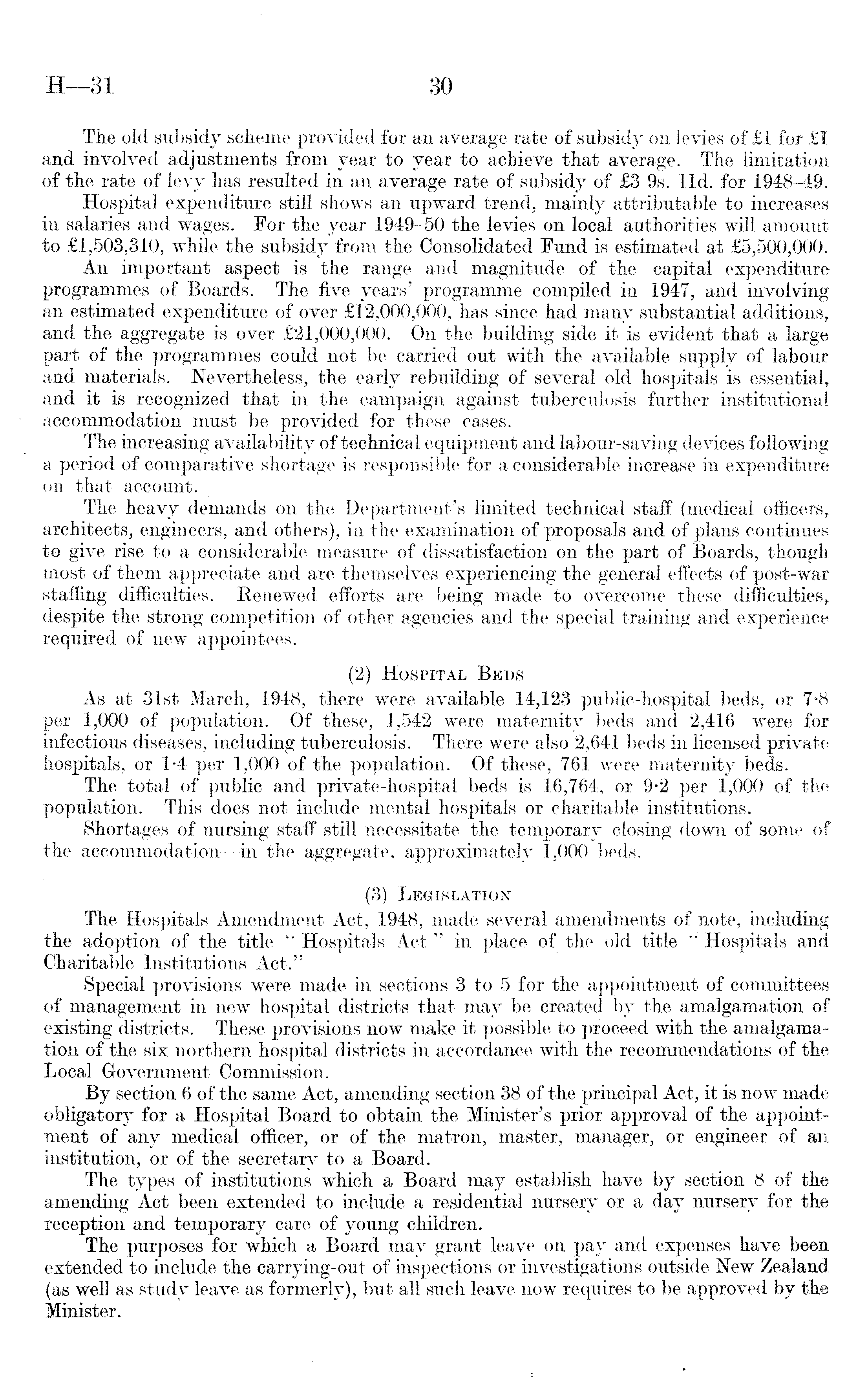 The old subsidy scheme provided for ail average rate of subsidy on levies of £1 for £1 and involved adjustments from year to year to achieve that average. The limitation of the rate of levy has resulted in an average rate of subsidy of £3 9s. lid. for 1948-49. Hospital expenditure still shows an upward trend, mainly attributable to increases in salaries and wages. For the year 1949-50 the levies on local authorities will amount to £1,503,310, while the subsidy from the Consolidated Fund is estimated at £5,500,000. An important aspect is the range and magnitude of the capital expenditure programmes of Boards. The five years' programme compiled in 1947, and involving an estimated expenditure of over £12,000,000, has since had many substantial additions, and the aggregate is over £21,000,000. On the building side it is evident that a large part of the programmes could not be carried out with the available supply of labour and materials. Nevertheless, the early rebuilding of several old hospitals is essential, and it is recognized that in the campaign against tuberculosis further institutional accommodation must be provided for these cases. The increasing availability of technical equipment and labour-saving devices following a period of comparative shortage is responsible for a considerable increase in expenditure on that account. The heavy demands on the Department's limited technical staff (medical officers, architects, engineers, and others), in the examination of proposals and of plans continues to give rise to a considerable measure of dissatisfaction on the part of Boards, though most of them appreciate and are themselves experiencing the general effects of post-war staffing difficulties. Renewed efforts are being made to overcome these difficulties,, despite the strong competition of other agencies and the special training and experience required of new appointees. (2) Hospital Beds As at 31st March, 1948, there were available 14,123 public-hospital beds, or 7-8 per 1,000 of population. Of these, 1,542 were maternity beds and 2,416 were for infectious diseases, including tuberculosis. There were also 2,641 beds in licensed private hospitals, or 1-4 per 1,000 of the population. Of these, 761 were maternity beds. The total of public and private-hospital beds is 16,764, or 9-2 per 1,000 of the population. This does not include mental hospitals or charitable institutions. Shortages of nursing staff still necessitate the temporary closing down of some of the accommodation —in the aggregate, approximately 1,000 beds. (3) Legislation The Hospitals Amendment Act, 1948, made several amendments of note, including the adoption of the title " Hospitals Act " in place of the old title " Hospitals and Charitable Institutions Act." Special provisions were made in sections 3 to 5 for the appointment of committees of management in new hospital districts that may be created by the amalgamation of existing districts. These provisions now make it possible to proceed with the amalgamation of the six northern hospital districts in accordance with the recommendations of the Local Government Commission. By section 6 of the same Act, amending section 38 of the principal Act, it is now made obligatory for a Hospital Board to obtain the Minister's prior approval of the appointment of any medical officer, or of the matron, master, manager, or engineer of an institution, or of the secretary to a Board. The types of institutions which a Board may establish have by section 8 of the •amending Act been extended to include a residential nursery or a day nursery for the reception and temporary care of young children. The purposes for which a Board may grant leave on pay and expenses have been extended to include the carrying-out of inspections or investigations outside New Zealand (as well as study leave as formerly), but all such leave now requires to be approved by the Minister.