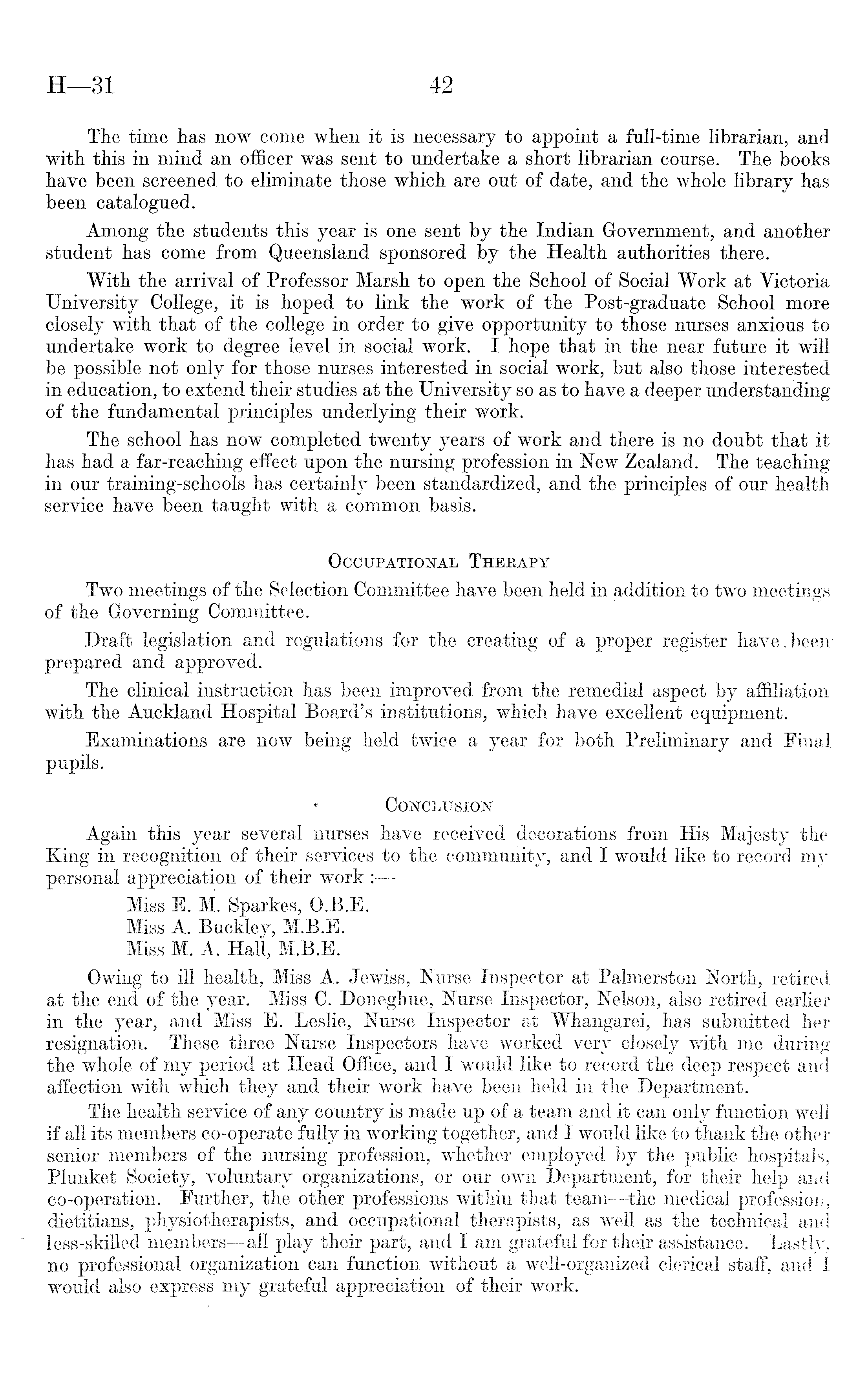 The time has now come when it is necessary to appoint a full-time librarian, and with this in mind an officer was sent to undertake a short librarian course. The books have been screened to eliminate those which are out of date, and the whole library has been catalogued. Among the students this year is one sent by the Indian Government, and another student has come from Queensland sponsored by the Health authorities there. With the arrival of Professor Marsh to open the School of Social Work at Victoria University College, it is hoped to link the work of the Post-graduate School more closely with that of the college in order to give opportunity to those nurses anxious to undertake work to degree level in social work. I hope that in the near future it will be possible not only for those nurses interested in social work, but also those interested in education, to extend their studies at the University so as to have a deeper understanding of the fundamental principles underlying their work. The school has now completed twenty years of work and there is no doubt that it has had a far-reaching effect upon the nursing profession in New Zealand. The teaching in our training-schools has certainly been standardized, and the principles of our health service have been taught with a common basis. Occupational Therapy Two meetings of the Selection Committee have been held in addition to two meetings of the Governing Committee. Draft legislation and regulations for the creating of a proper register have.been' prepared and approved. The clinical instruction has been improved from the remedial aspect by affiliation with the Auckland Hospital Board's institutions, which have excellent equipment. Examinations are now being held twice a year for both Preliminary and Final pupils. Conclusion Again this year several nurses have received decorations from His Majesty the King in recognition of their services to the community, and I would like to record my personal appreciation of their work : Miss E. M. Sparkes, 0.8. E. Miss A. Buckley, M.B.E. Miss M. A. Hall, M.B.E. Owing to ill health, Miss A. Jewiss, Nurse Inspector at Palmerston North, retired at the end of the year. Miss C. Doneghue, Nurse Inspector, Nelson, also retired earlier in the year, and Miss E. Leslie, Nurse Inspector at Whangarei, has submitted her resignation. These three Nurse Inspectors have worked very closely with me during the whole of my period at Head Office, and I would like to record the deep respect and affection with which they and their work have been held in the Department. The health service of any country is made up of a team and it can only function well if all its members co-operate fully in working together, and I would like to thank the other senior members of the nursing profession, whether employed by the public hospitals, Plunket Society, voluntary organizations, or our own Department, for their help and co-operation. Further, the other professions within that team —the medical profession, dietitians, physiotherapists, and occupational therapists, as well as the technical and less-skilled members—all play their part, and lam grateful for their assistance. Lastly, no professional organization can function without a well-organized clerical staff, and I would also express my grateful appreciation of their work.