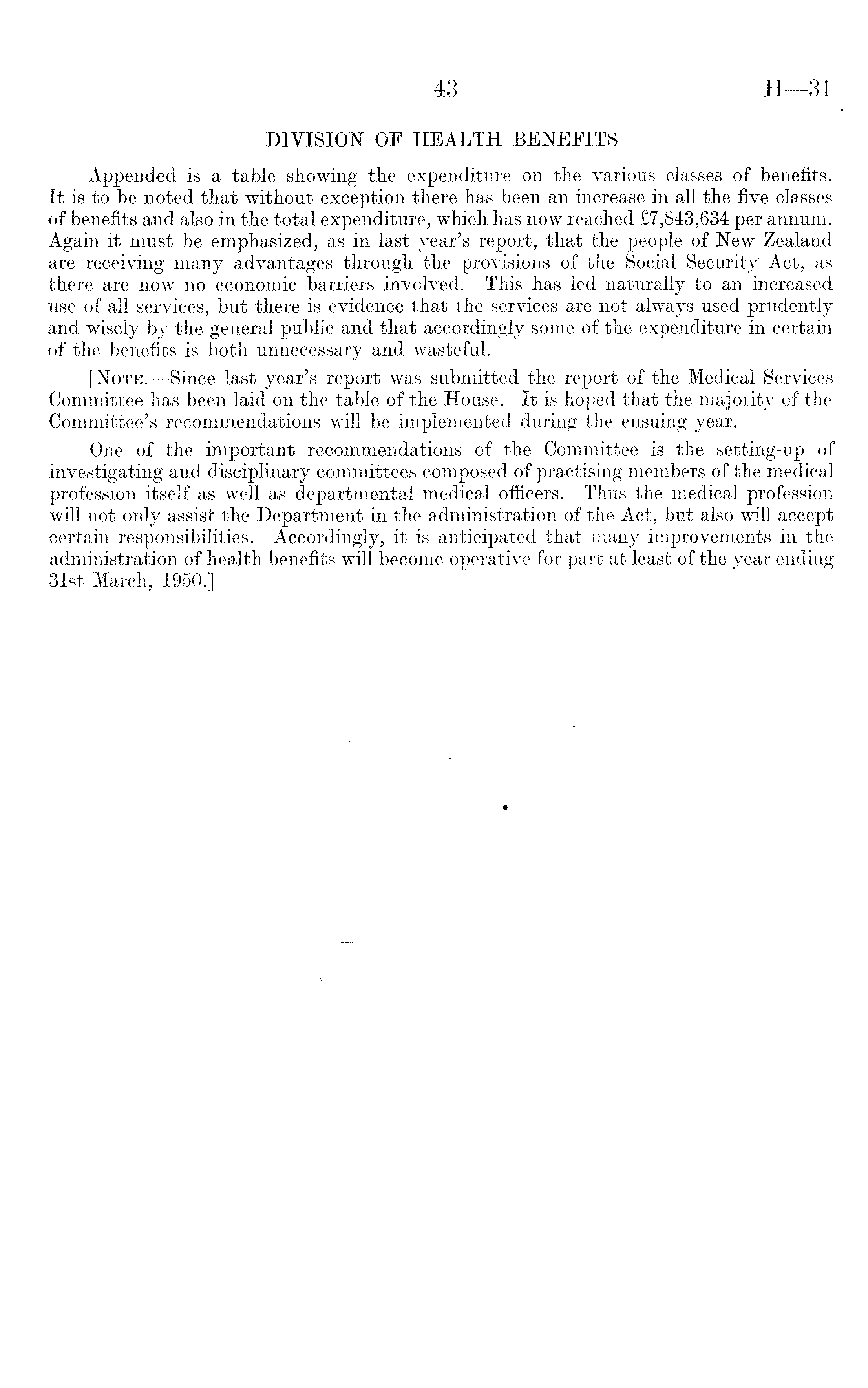 DIVISION OF HEALTH BENEFITS Appended is a table showing the expenditure on the various classes of benefits. It is to be noted that without exception there has been an increase in all the five classes of benefits and also in the total expenditure, which has now reached £7,843,634 per annum. Again it must be emphasized, as in last year's report, that the people of New Zealand are receiving many advantages through the provisions of the Social Security Act, as there are now no economic barriers involved. This has led naturally to an increased use of all services, but there is evidence that the services are not always used prudently and wisely by the general public and that accordingly some of the expenditure in certain of the benefits is both unnecessary and wasteful. [Note. —Since last year's report was submitted the report of the Medical Services Committee has been laid on the table of the House. It is hoped that the majority of the Committee's recommendations will be implemented during the ensuing year. One of the important recommendations of the Committee is the setting-up of investigating and disciplinary committees composed of practising members of the medical profession itself as well as departmental medical officers. Thus the medical profession will not only assist the Department in the administration of the Act, but also will accept certain responsibilities. Accordingly, it is anticipated that many improvements in the administration of health benefits will become operative for part at least of the year ending 31st March, 1950.]